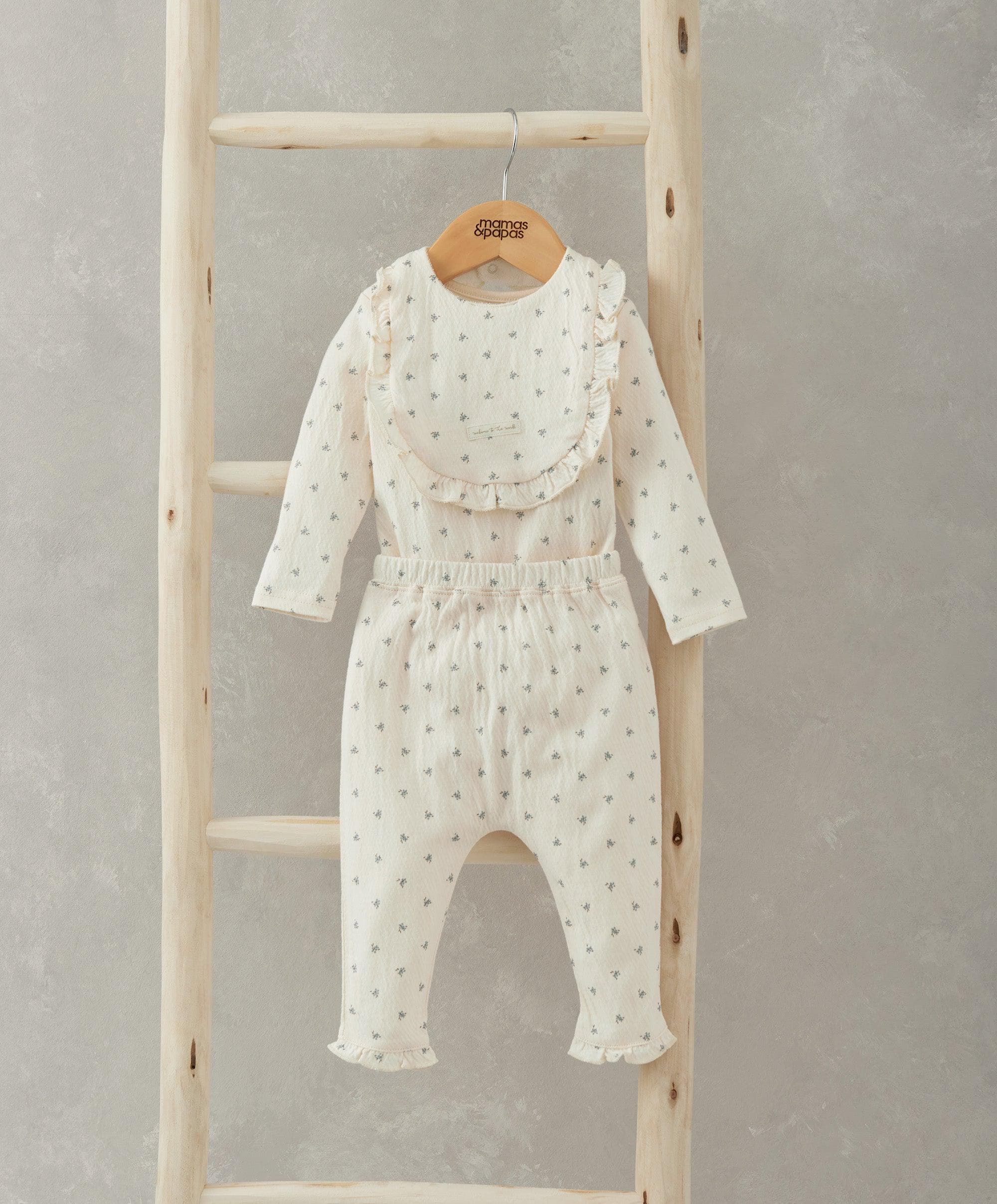3 piece set with bib. Long sleeved bodysuit in all-over ditsy floral print with envelope neckline and eye-catching gather into body both front and back. Popper opening at gusset for easy nappy changes. Comfy matching leggings in all-over ditsy floral print with woven badge detail at back and gorgeous frill cuffs. With elasticated waistband for easy changing and dressing. Matching bib in all-over ditsy floral print with woven badge detail and frill edges. Popper opening at back for easy adjusting.