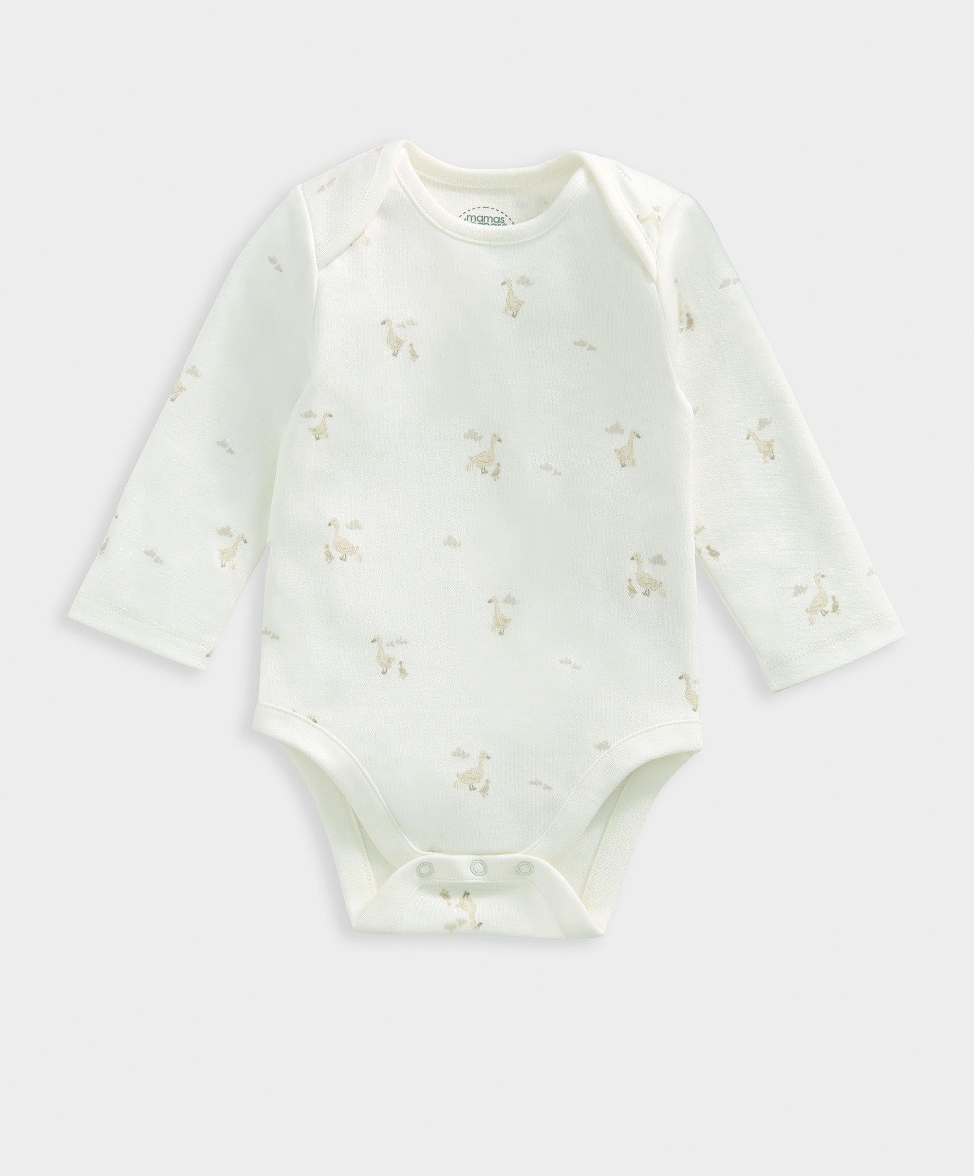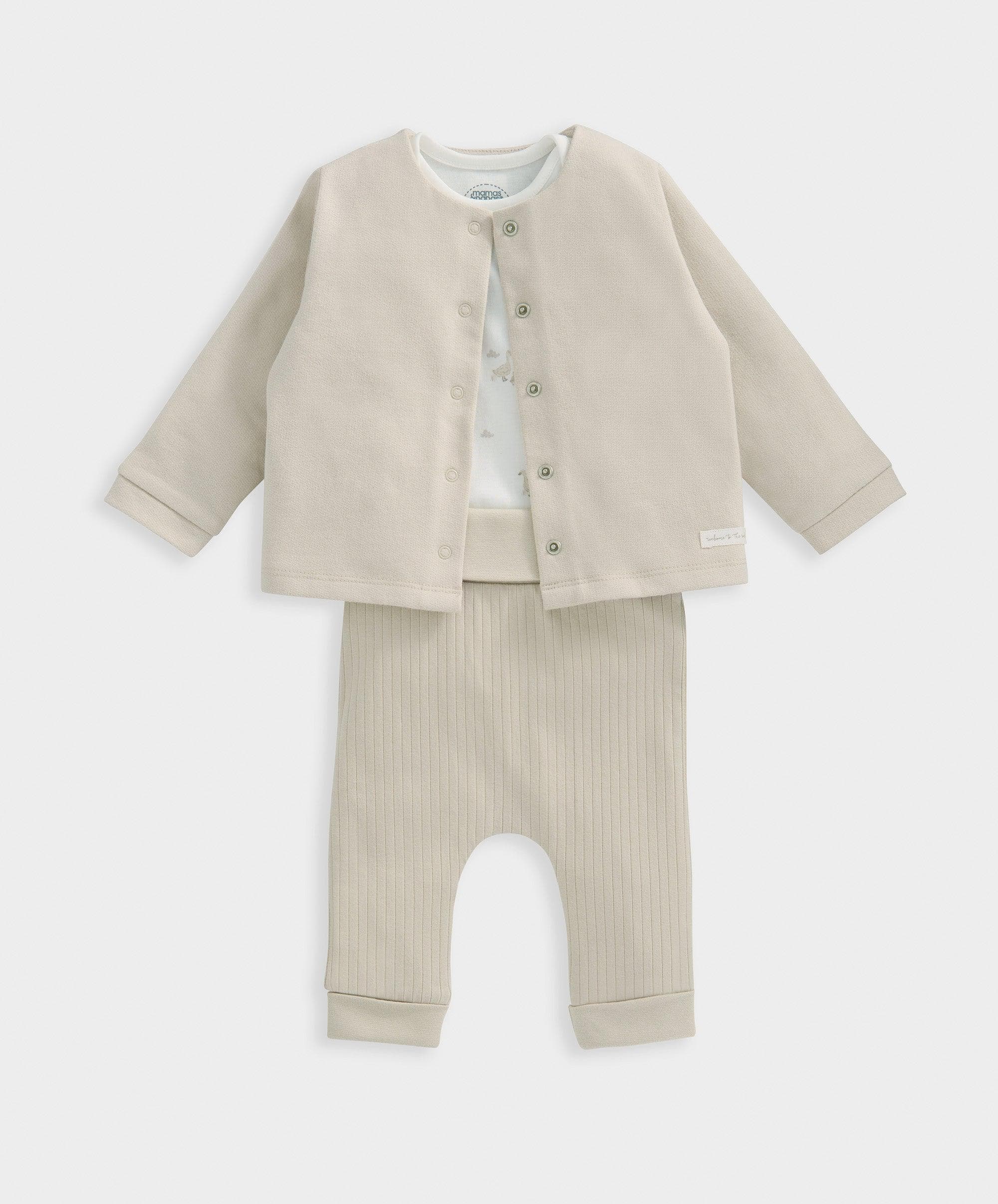 3-piece set. Includes oatmeal jacket with central poppers, long-sleeved duckling print bodysuit with popper fastening at crotch and ribbed cotton leggings