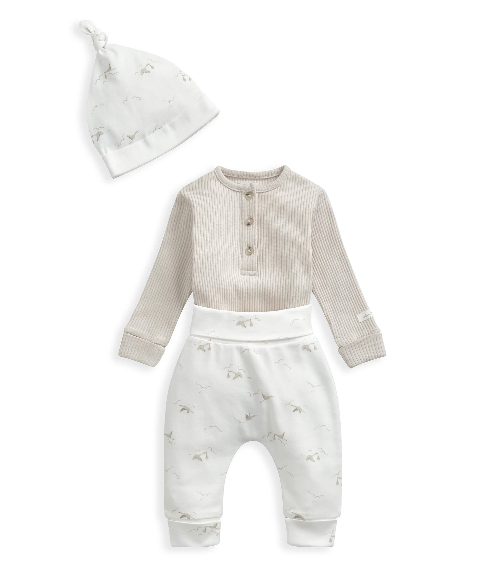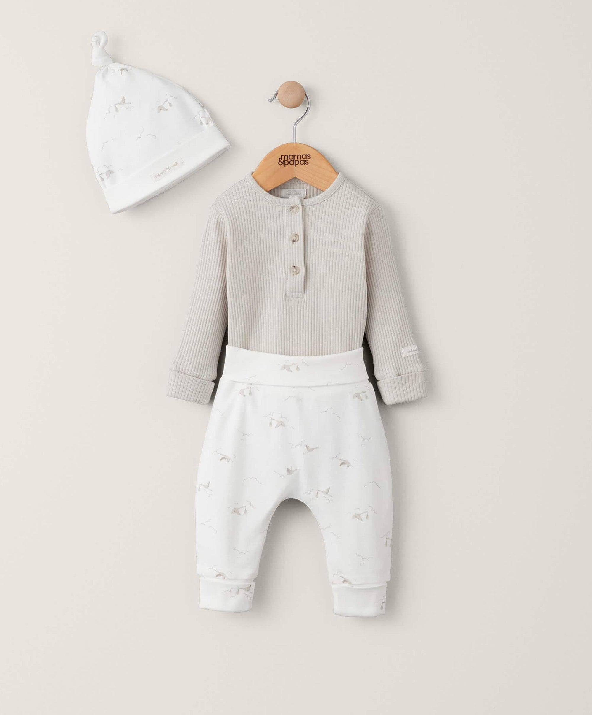 3-piece set - a complete outfit for your little one! Grey chunky rib bodysuit with mock horn button detail, matches with gorgeous soft cotton leggings with sweet stalk print and matching stork print hat. Popper fastening on bodysuit and elasticated waist on leggings means dressing and undressing and nappy changes are kept easy and quick!