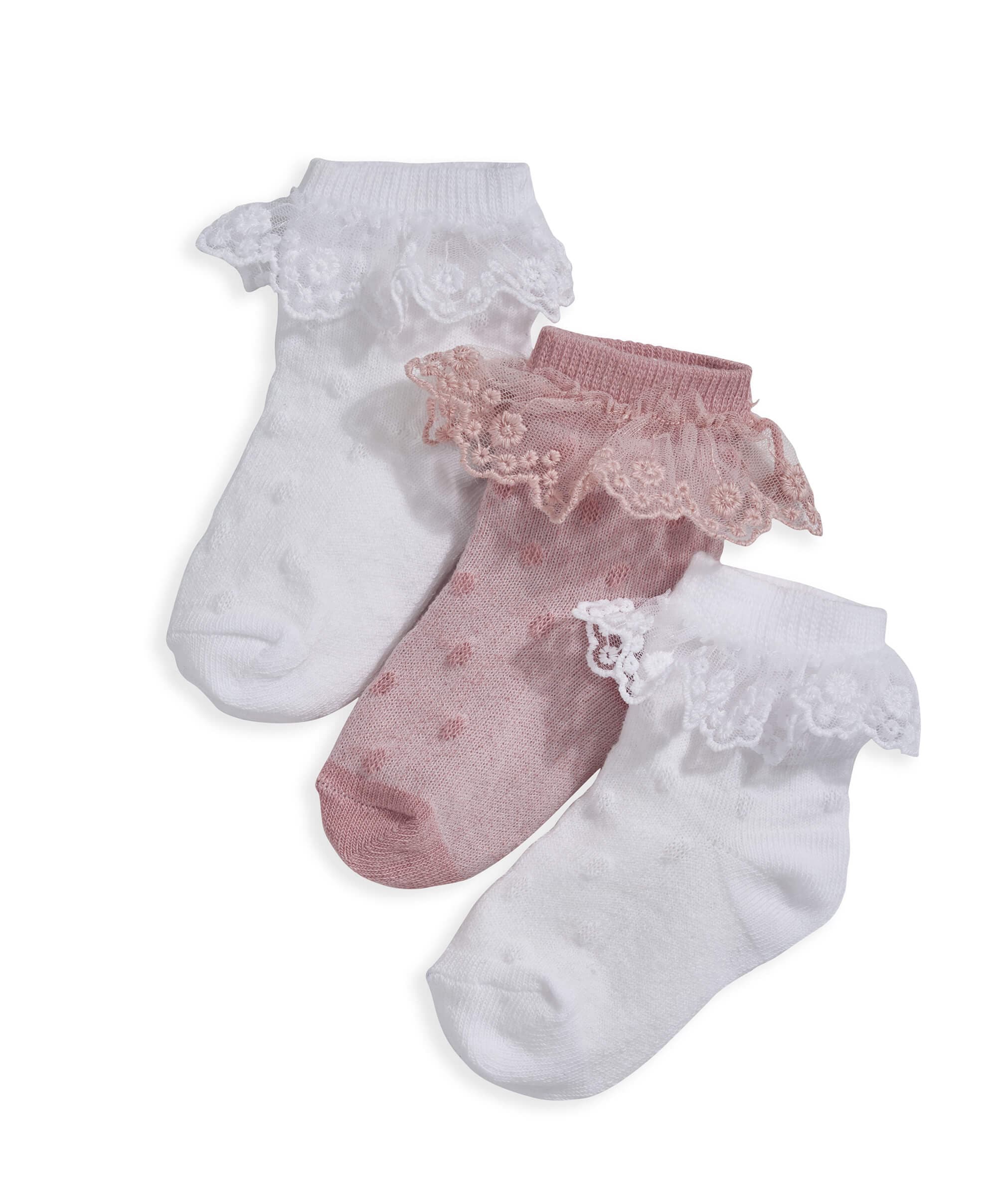 Handy 3-pack frill socks with lace trim. Pink and white.