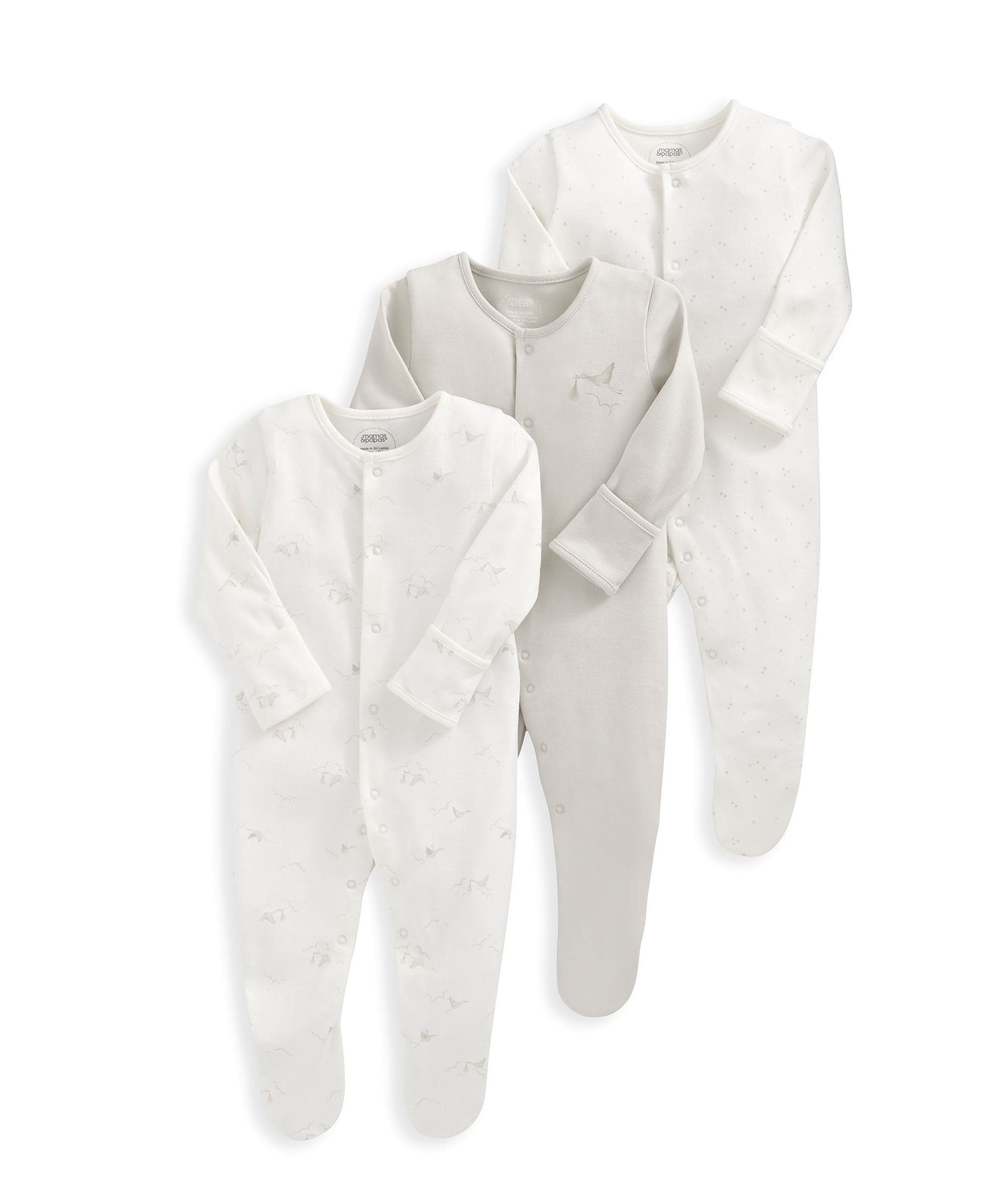 3-pack of long-sleeved all in one sleepsuits, in various styles. Includes 1 stork print, 1 spotted and 1 plain grey with stork logo. Full popper fastening,
