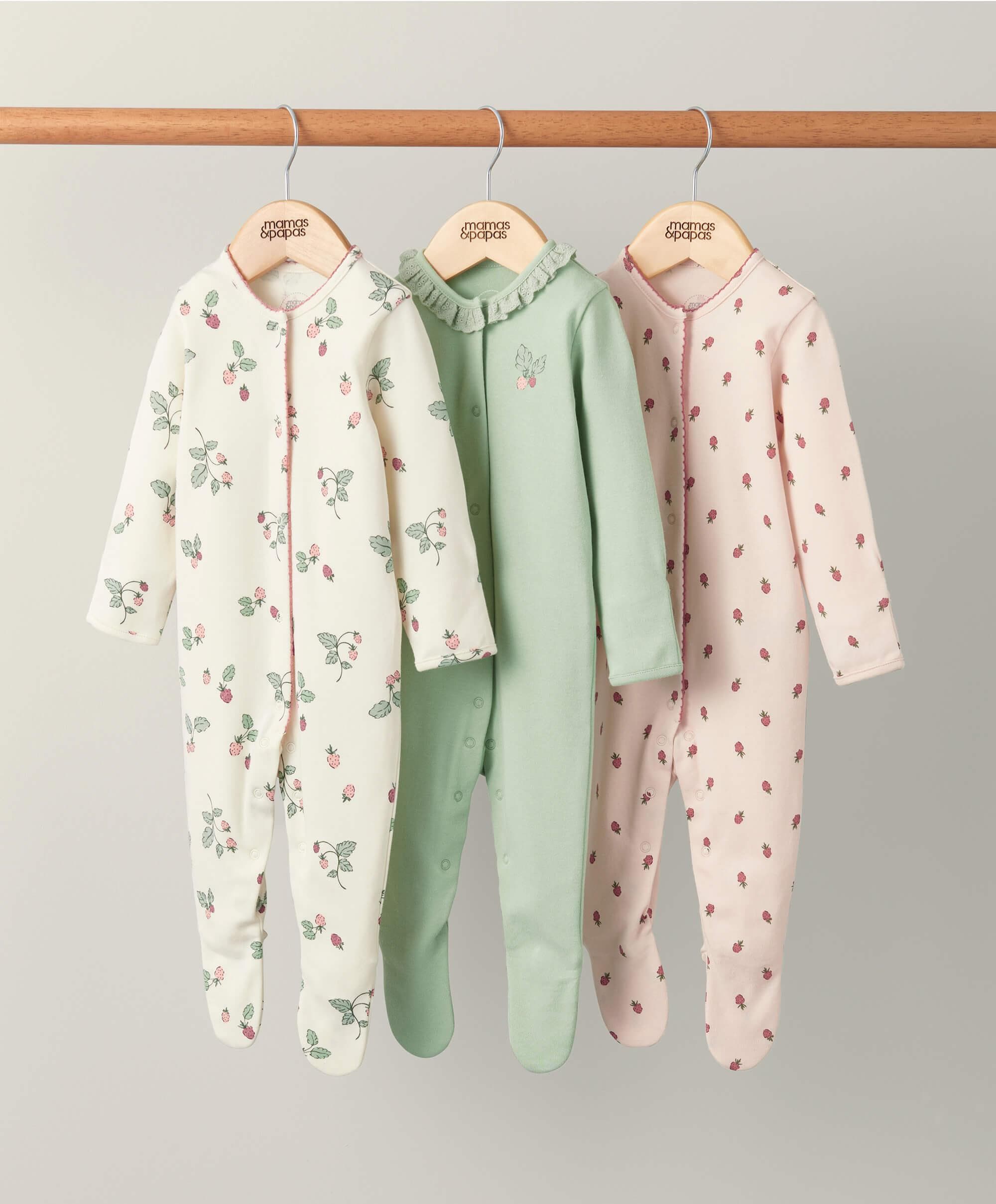Handy three-pack of girls' long-sleeved all in one sleepsuits, with integrated feet and mitts for extra warmth and protection. Includes strawberry leaf print with picot trim, ditsy strawberry print with picot trim and plain with broderie collar and placement print. Features popper fastening at crotch for easier nappy changes. Crafted from our softest 100% cotton that's gentle on newborn skin.