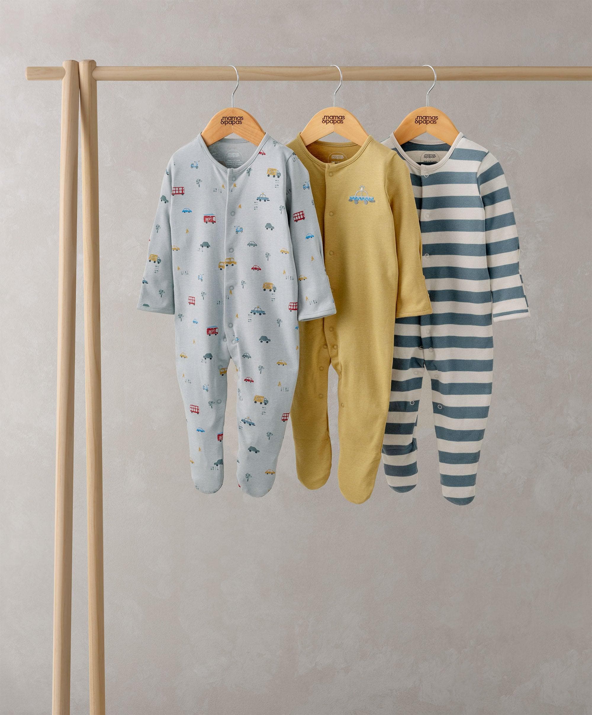 Handy 3-pack of 100% cotton sleepsuits in transport theme.