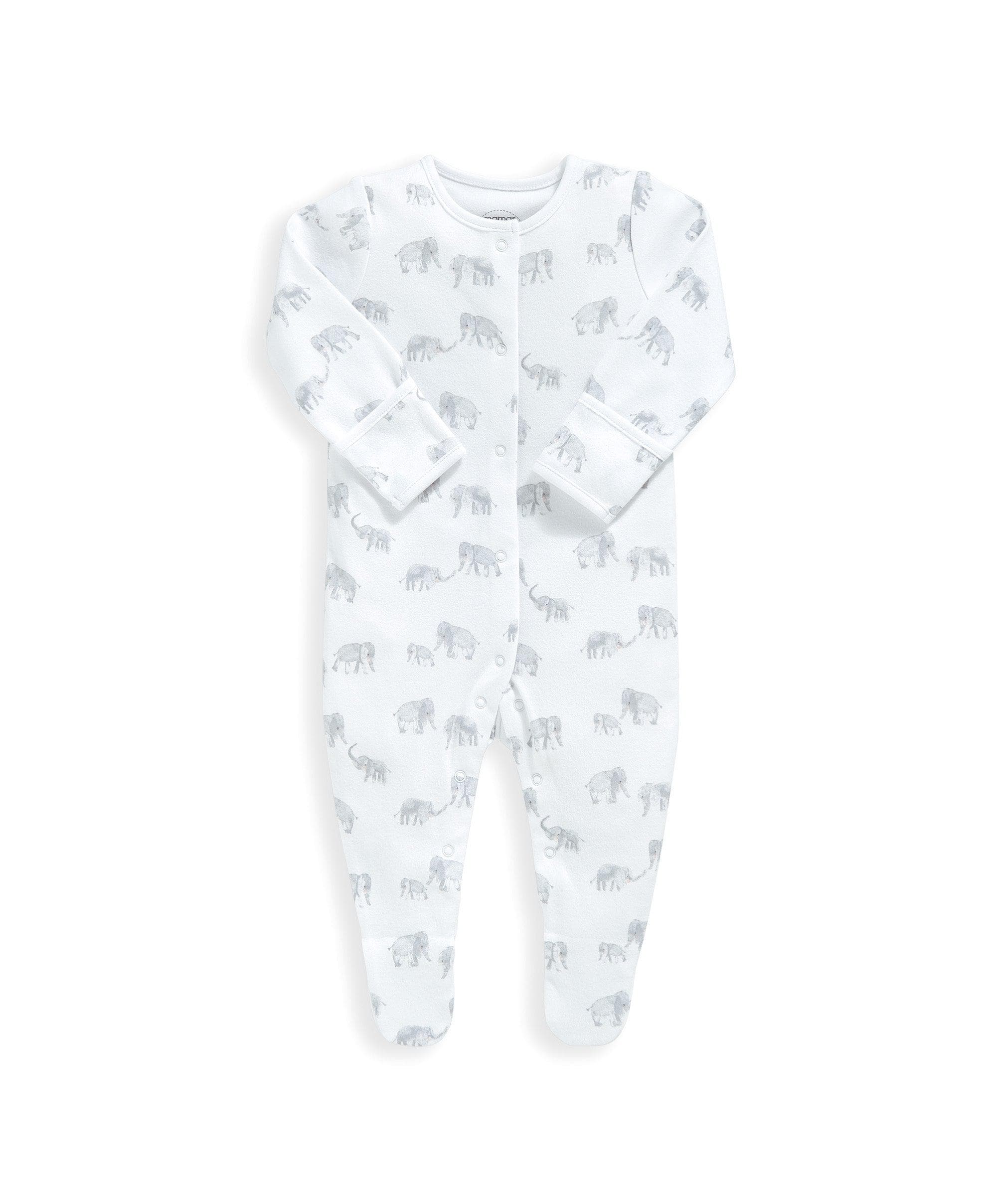 This handy 5-piece set of unisex bodysuits includes long sleeved all in one sleepsuit with integrated scratch mitts in adorable elephant print, a long-sleeved all in one sleepsuit with integrated scratch mitts in striped print and a short-sleeved bodysuit with embroidered detail, all made from super soft cotton thats gentle on newborn skin with popper fastening on the crotch for easy changing. Also includes an elephant print hat and elephant print bib, for easy co-ordinating.