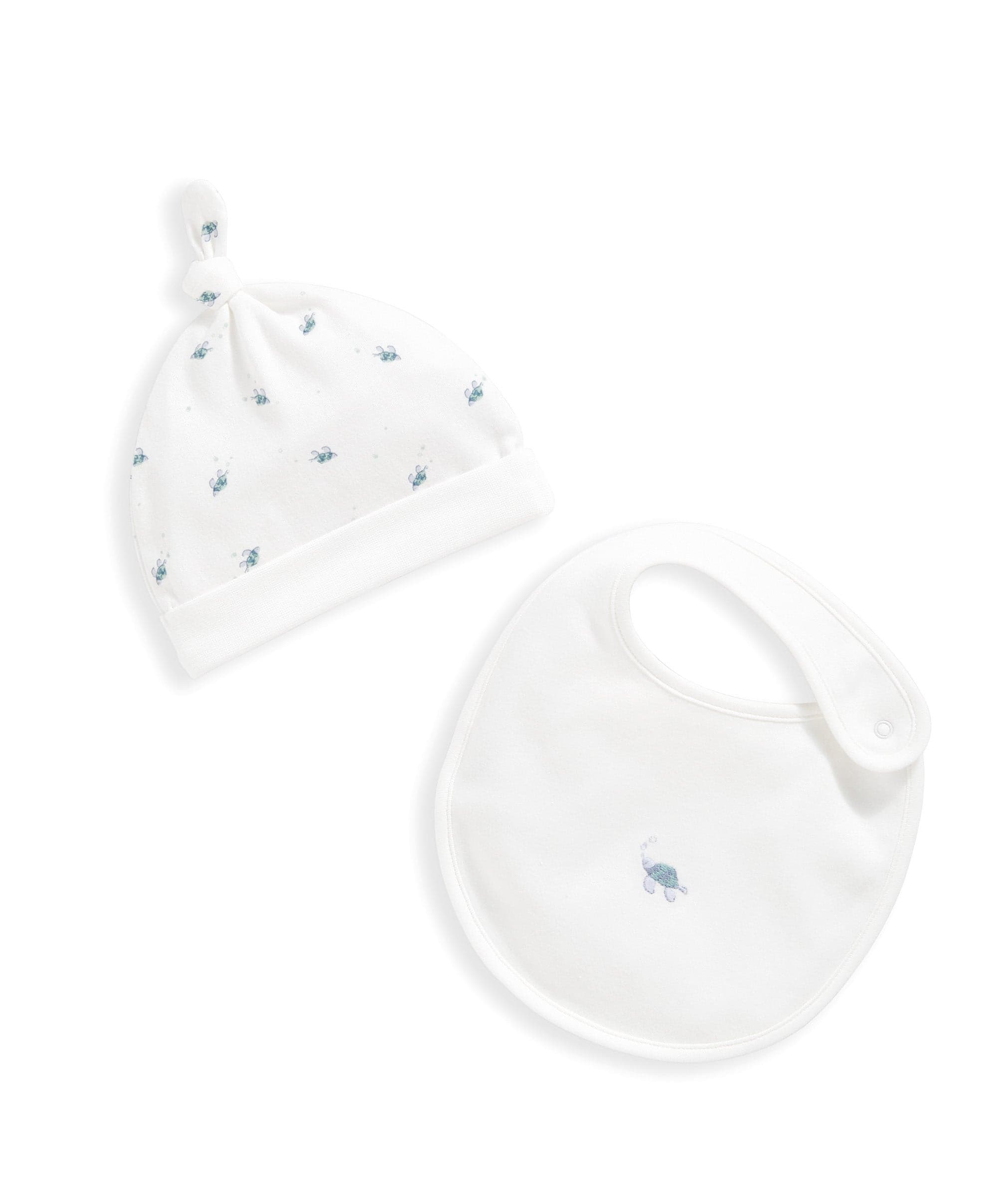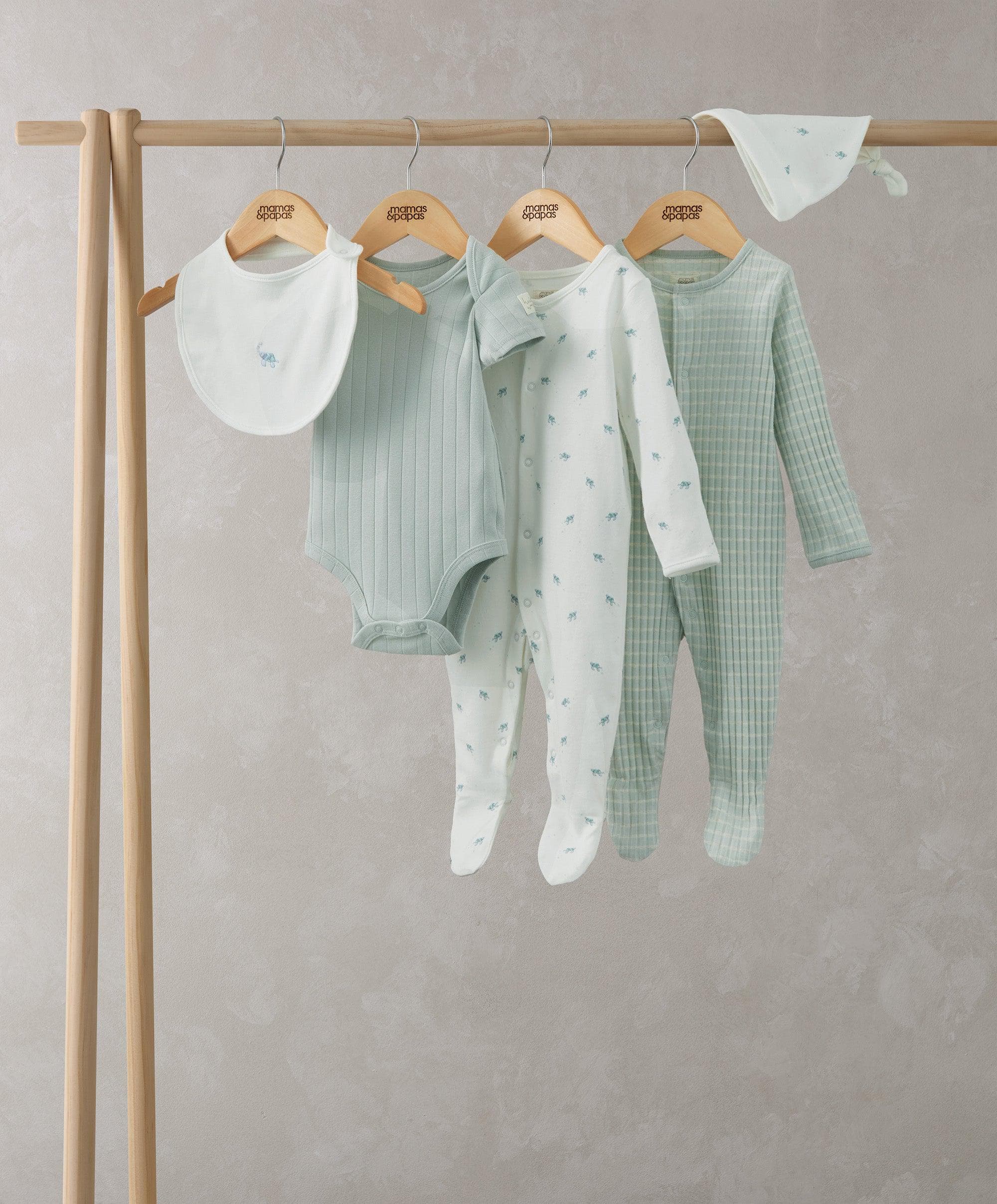 Handy 5-piece set for easy co-ordinating outfits. Includes all-in-one sleepsuit in cute turtle print with integrated scratch mitts, oatmeal and green stripe all-in-one sleepsuit with integrated scratch mitts, short sleeve bodysuit, bib with turtle embroidered detail and towel fabric on reverse and turtle print hat with knot detail.