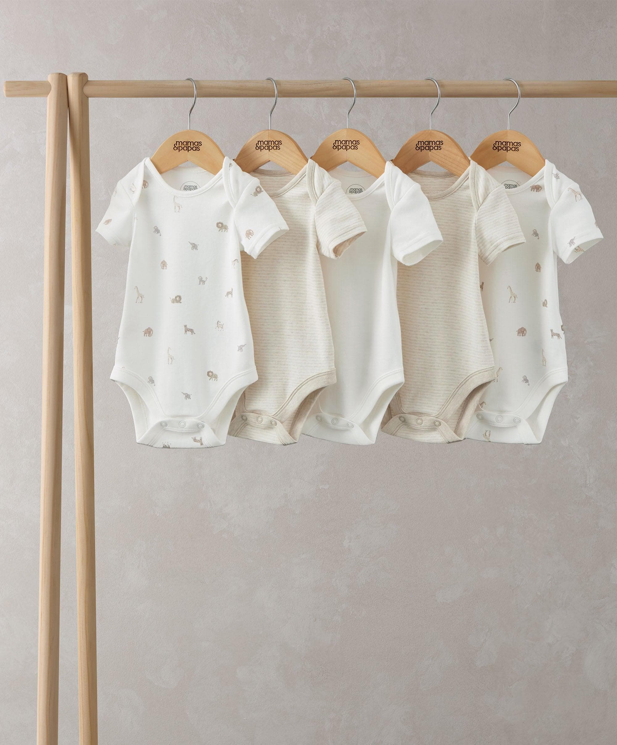 5-pack short-sleeved bodysuits. 2 animal print, 2 soft oatmeal stripe, 1 plain. Popper fastening on crotch. Made from supersoft 100% cotton.