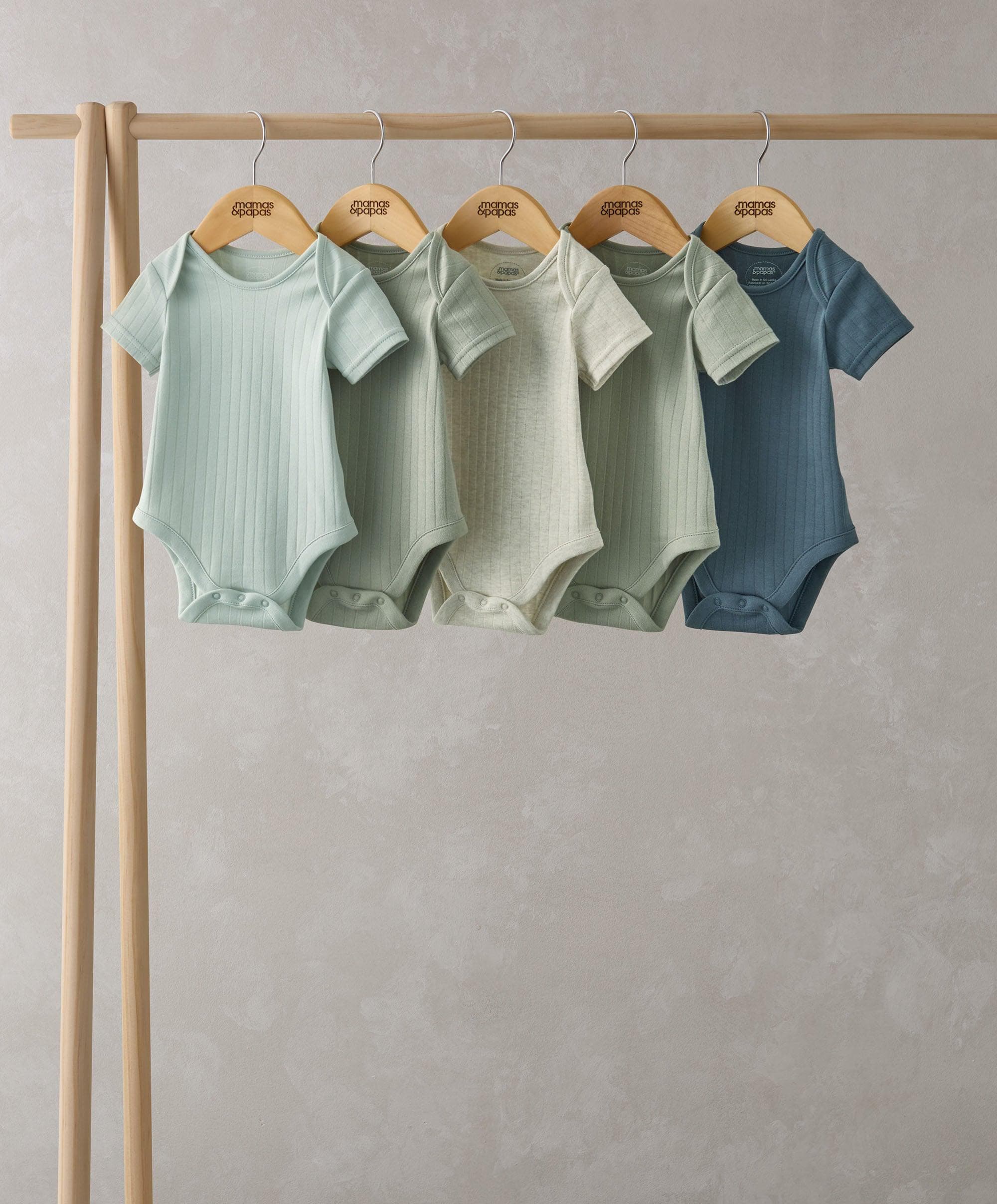 5-pack ribbed short-sleeved vests with envelope neckline and popper crotch fastening.