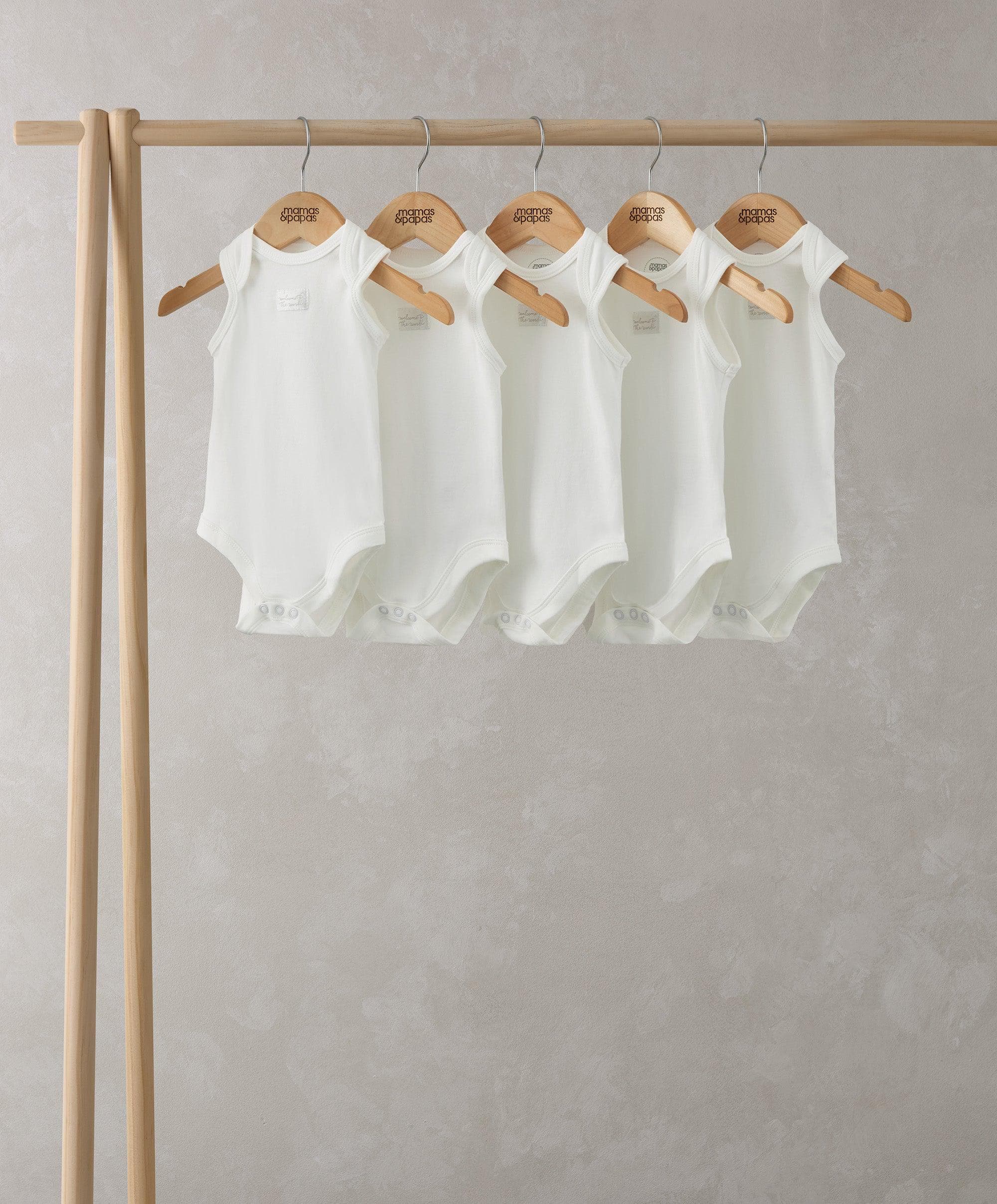 Handy 5-pack of pure white sleeveless bodysuits in supersoft organic white cotton that's soft and gentle on newborn skin. Popper fastening for easy changes and finished with Welcome to the World woven badge detail.