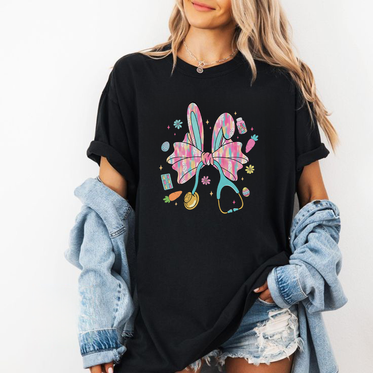 A Big Colorful Bow, Rabbit Ears, And Surrounded By Carrots, Easter Eggs, And Stethoscope Patterns. The Overall Style Is Lively And Casual T-Shirt. 9513746