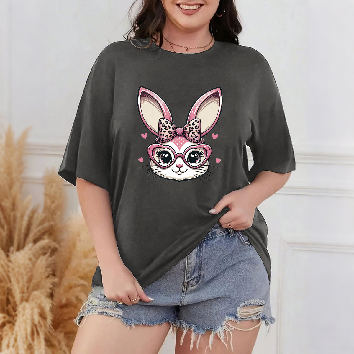 A Cartoon Rabbit Head Pattern, Wearing A Leopard Print Bow And Heart-Shaped Glasses, Surrounded By Pink Hearts. The Overall Style Is Sweet And Cute, A Casual T-Shirt.