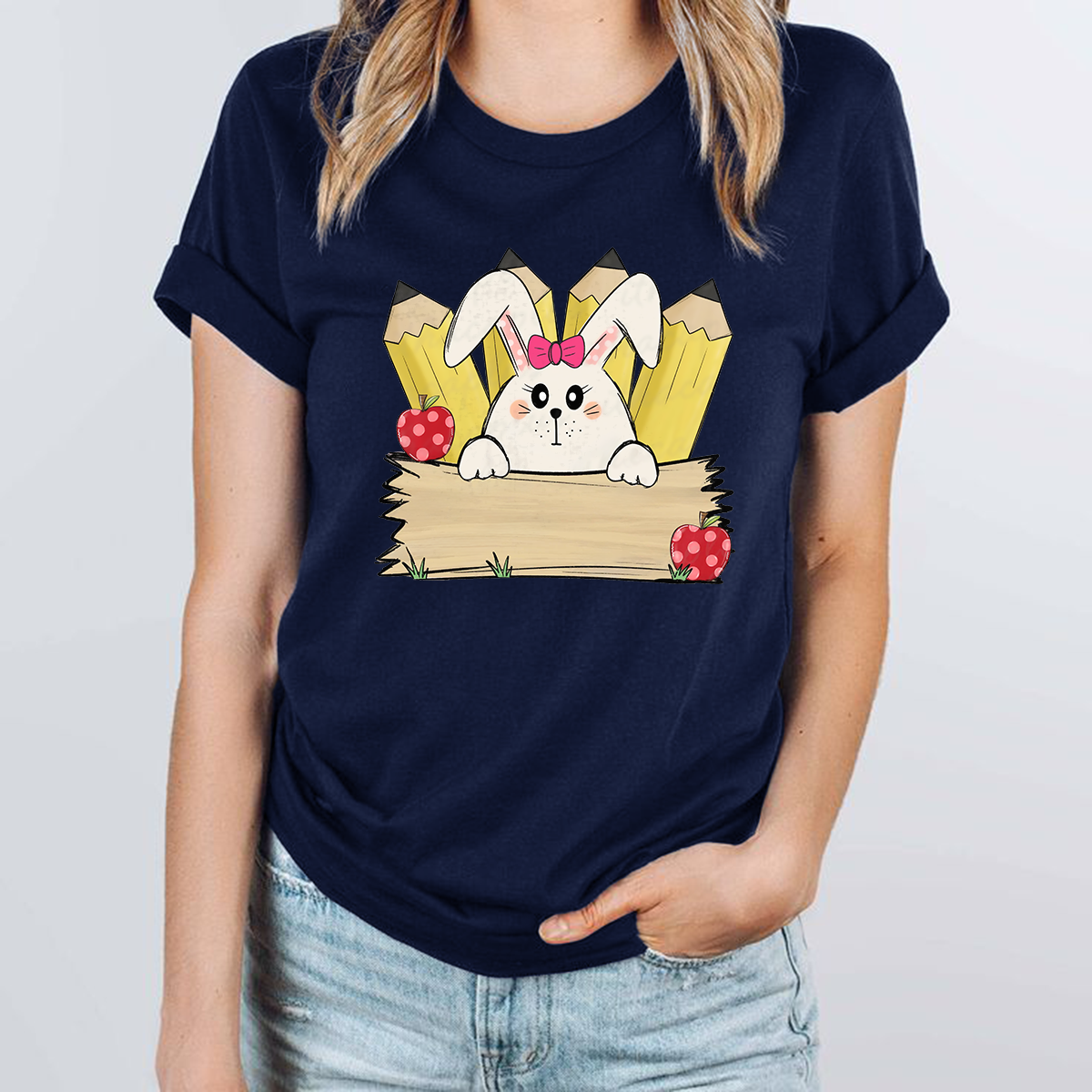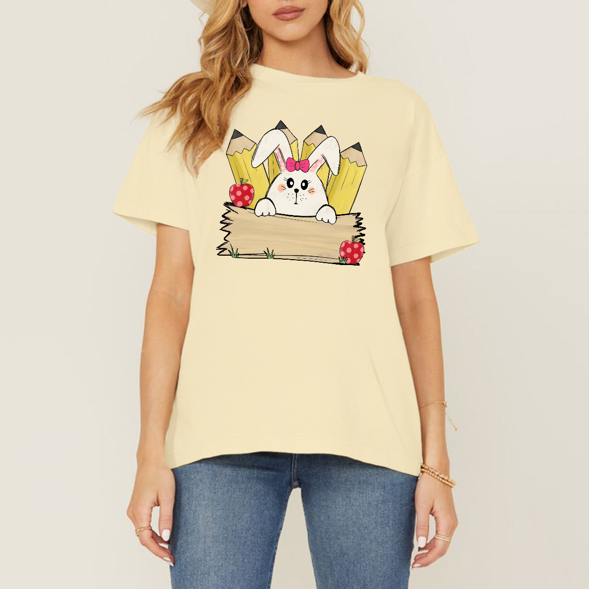 A Cartoon White Rabbit Wearing A Pink Bow Holding A Blank Board, A Yellow Pencil And A Red Strawberry With White Dots, A Childlike, Fresh Style, Casual T-Shirt 9514916