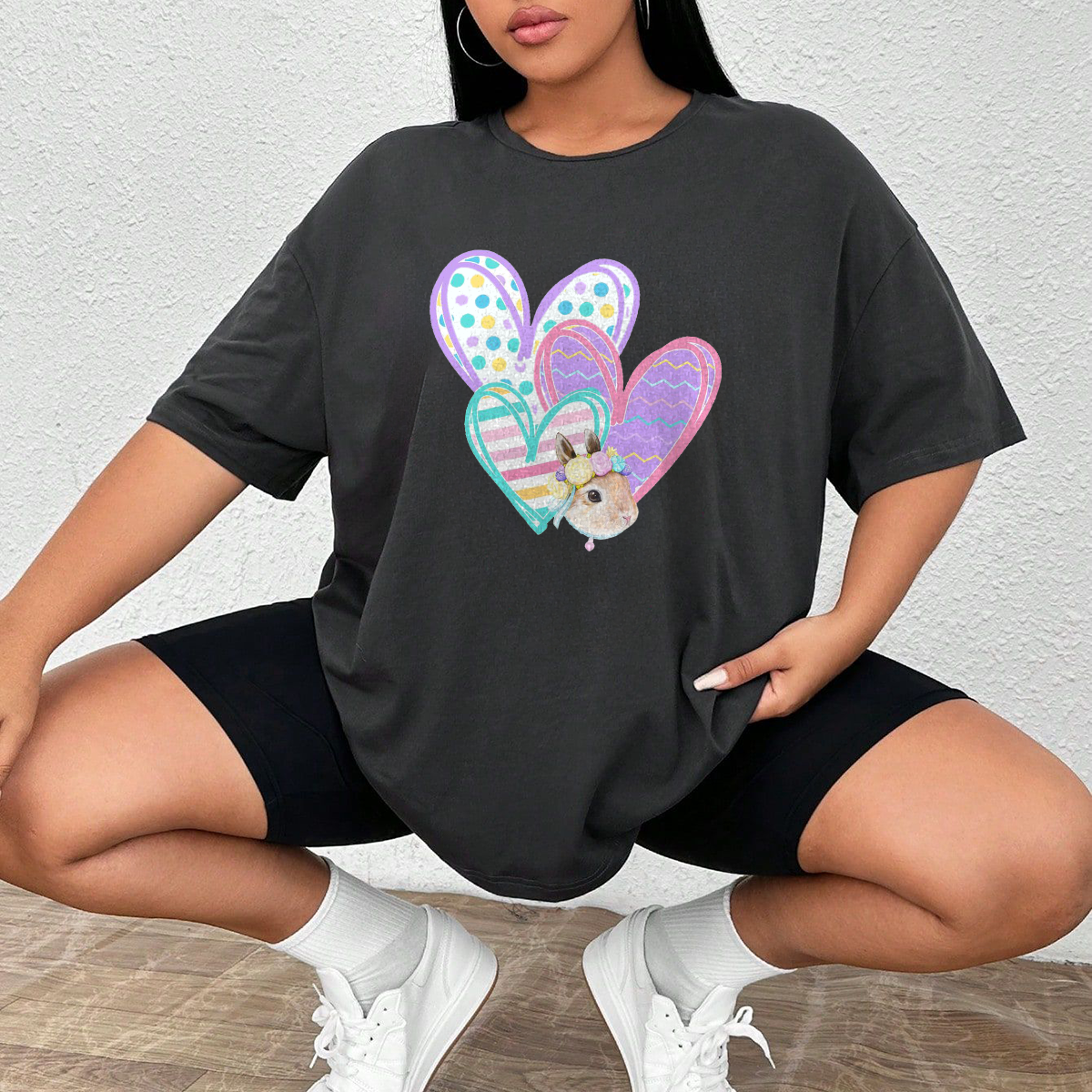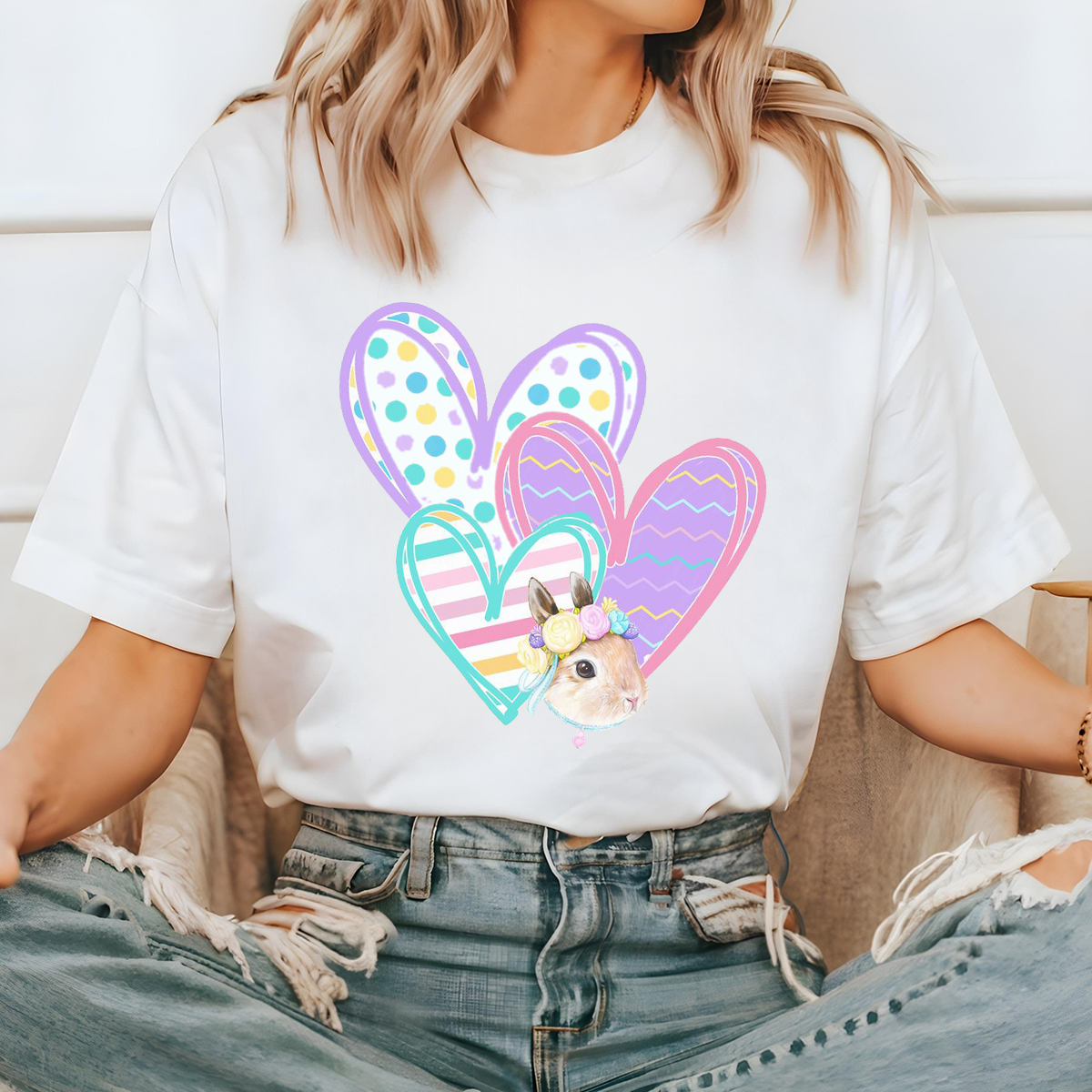 A Cute Little Rabbit, Surrounded By Several Decorative Heart-Shaped Patterns With Different Patterns Such As Polka Dots And Stripes, A Casual T-Shirt. 9513986