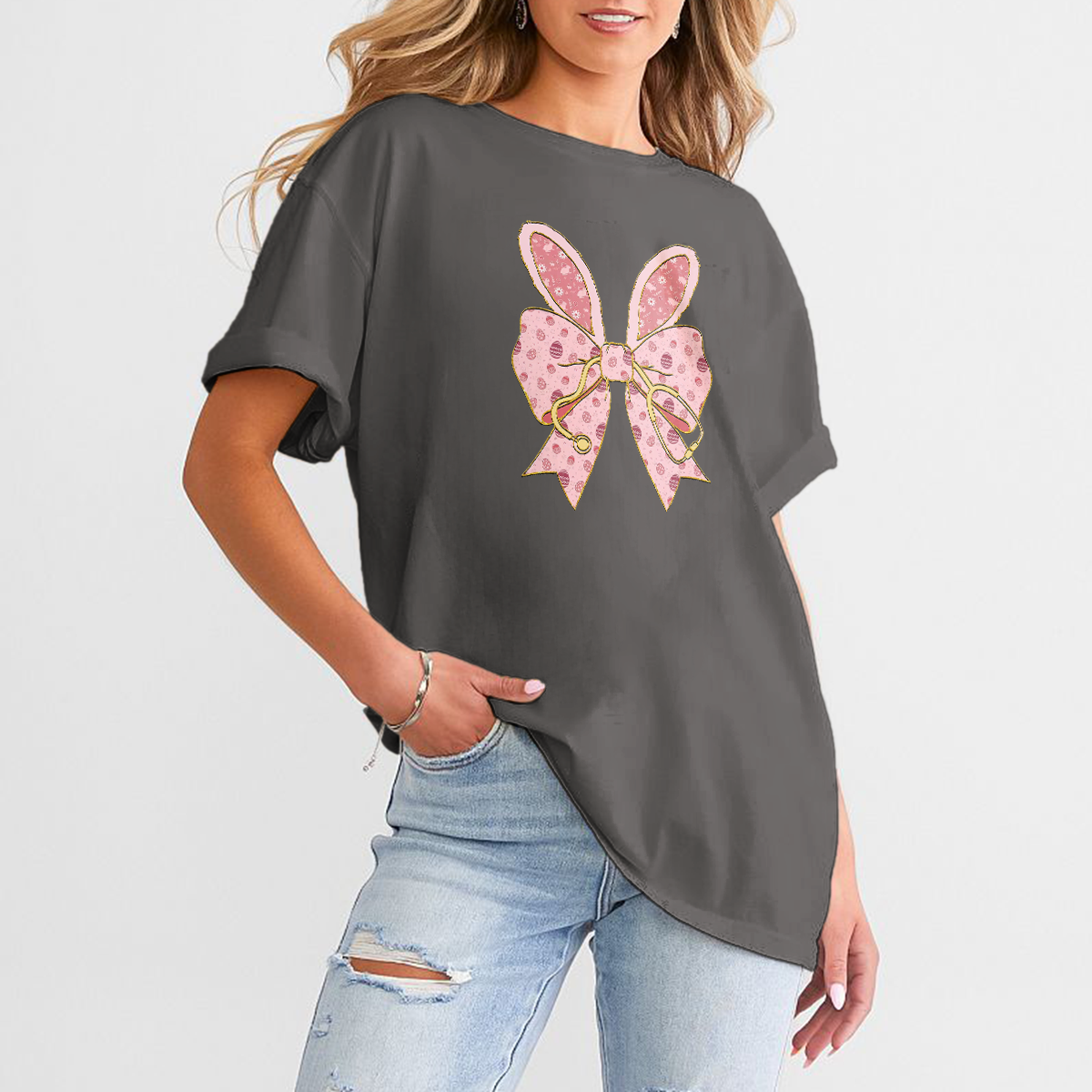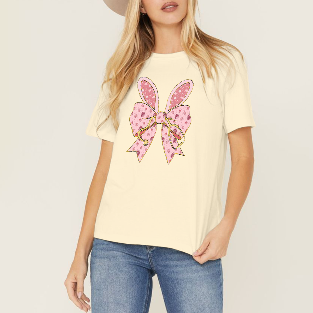 A Pink Bow Pattern With Bunny Ears And Pink Polka Dots, Hanging On A Golden Stethoscope And A Casual T-Shirt.