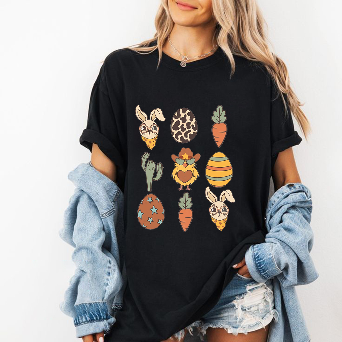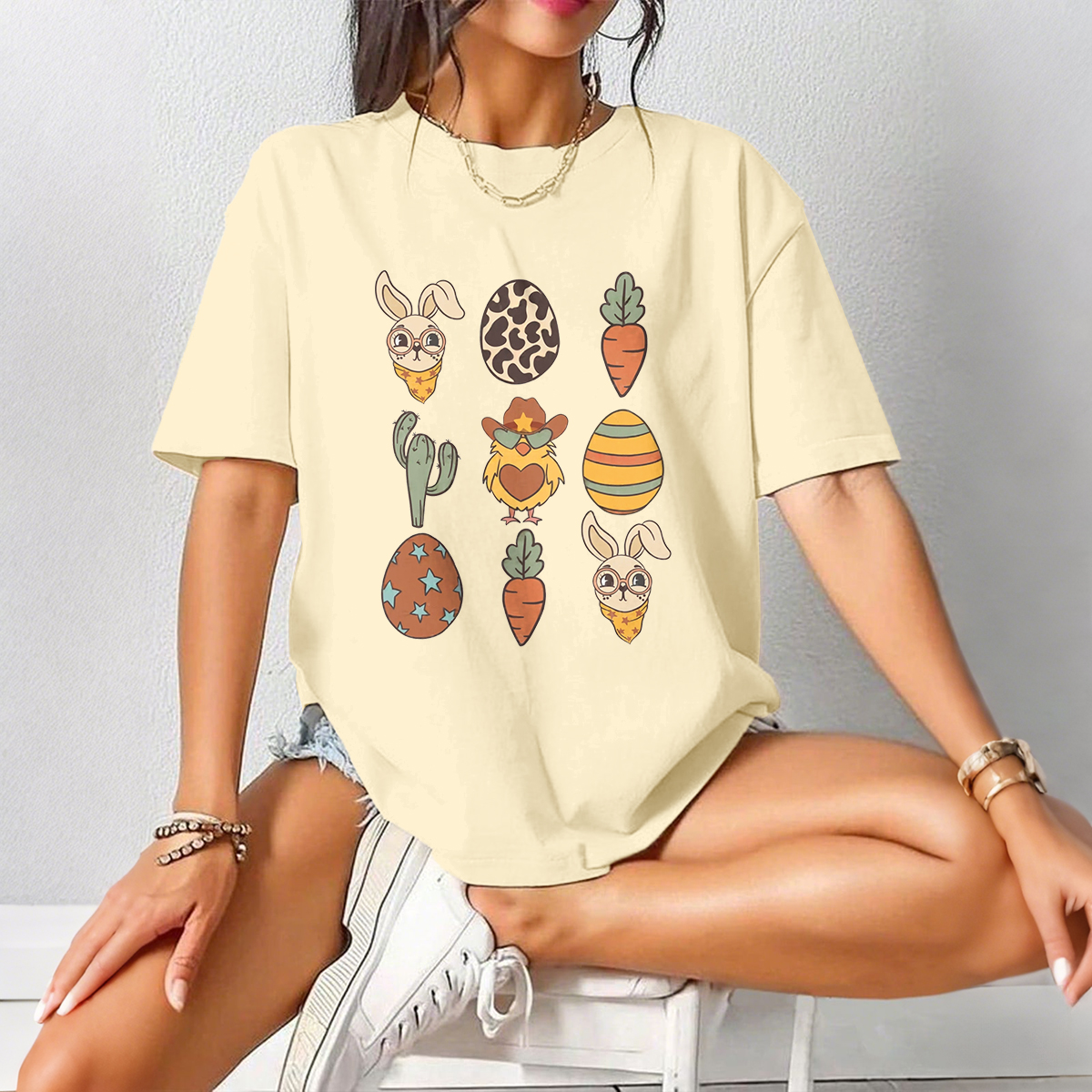 A Set Of Patterns, Including A Rabbit Head Wearing A Scarf, Leopard Print Eggs, Carrots, Cacti, Chickens Wearing Cowboy Hats, Striped Eggs, Etc. The Overall Style Is Cute And Casual T-Shirts.