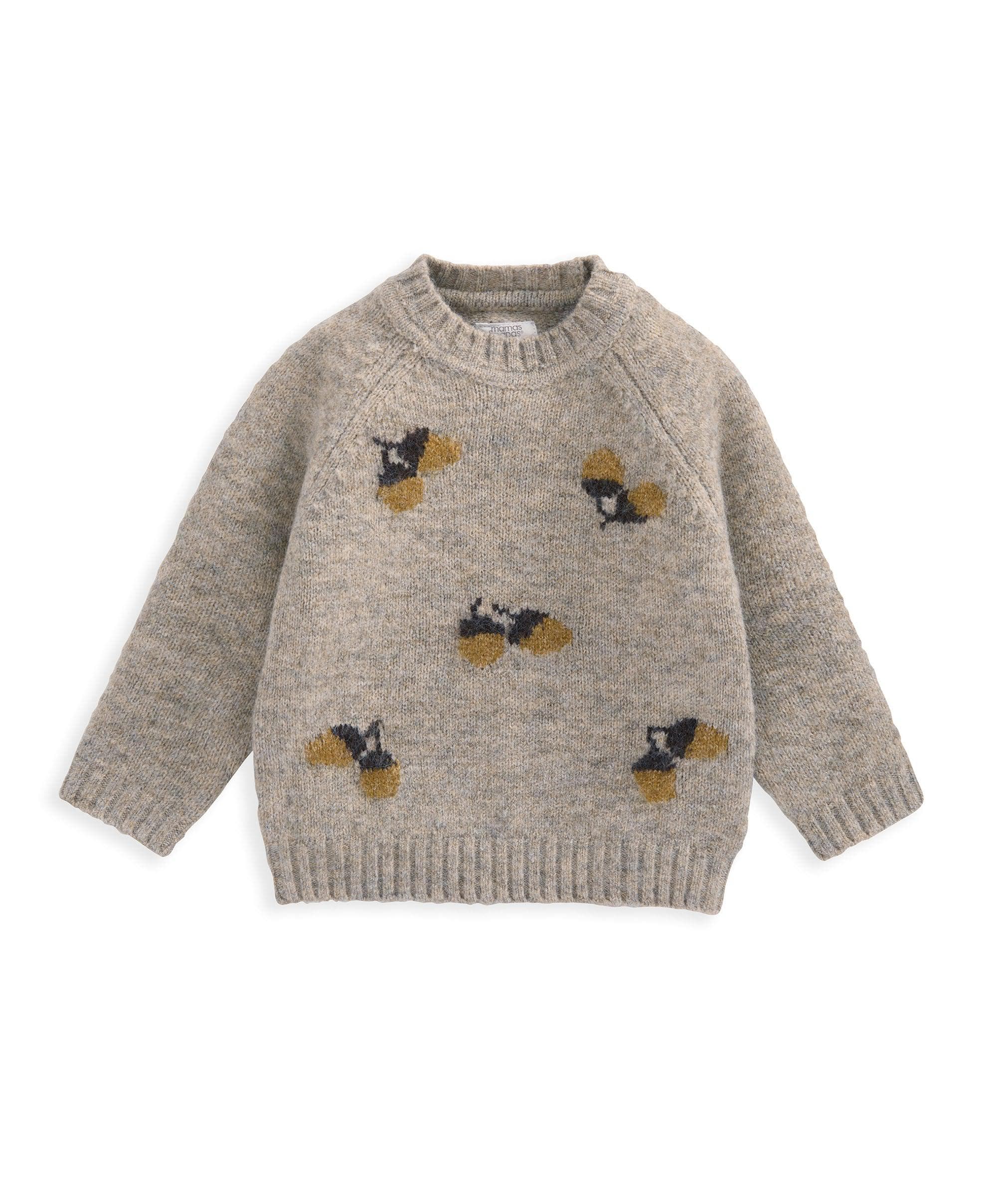 Long-sleeved knit jumper with acorn print. Raglan sleeves with deep cuffs. Back fastening with 3 mock wood buttons