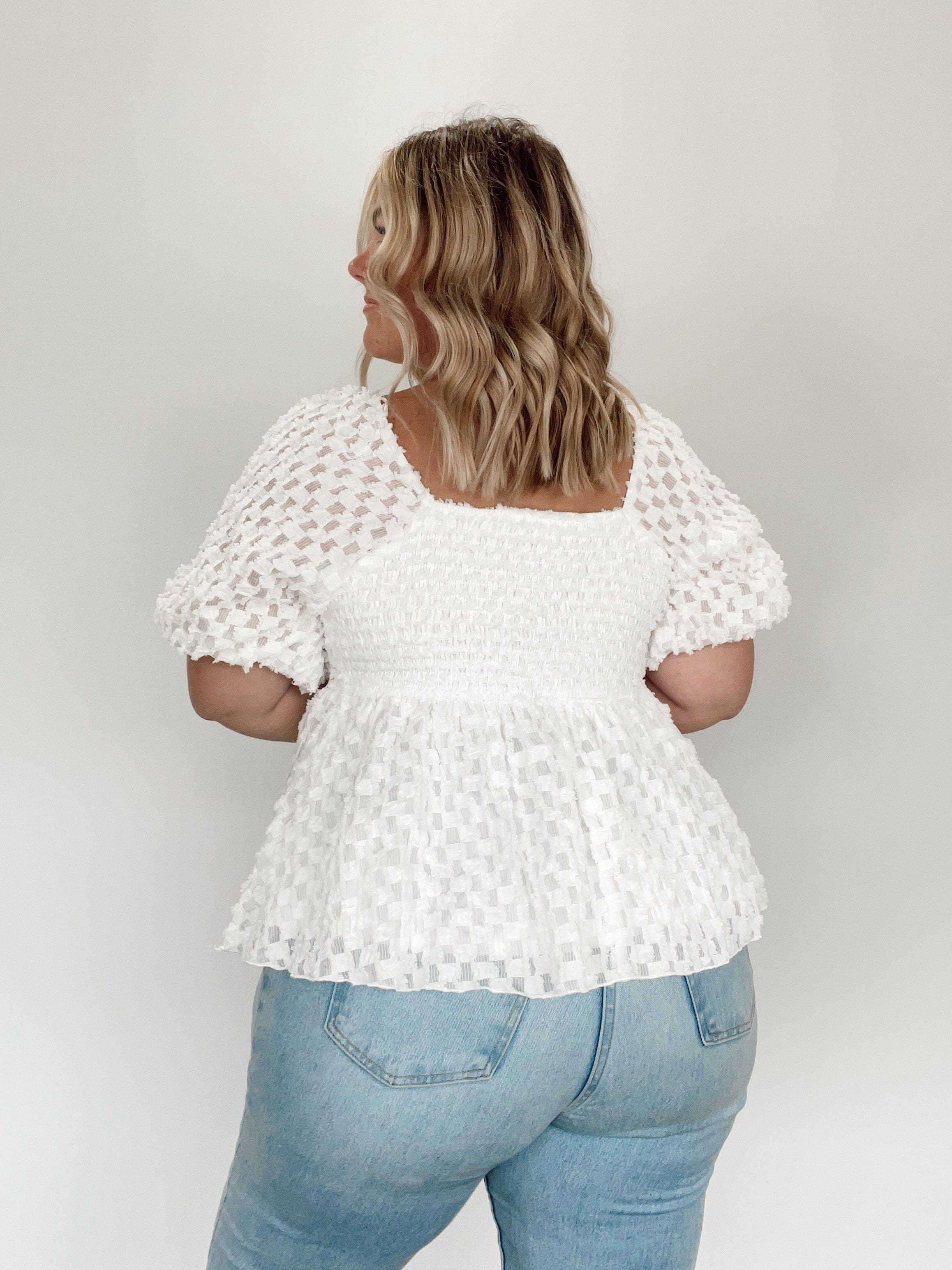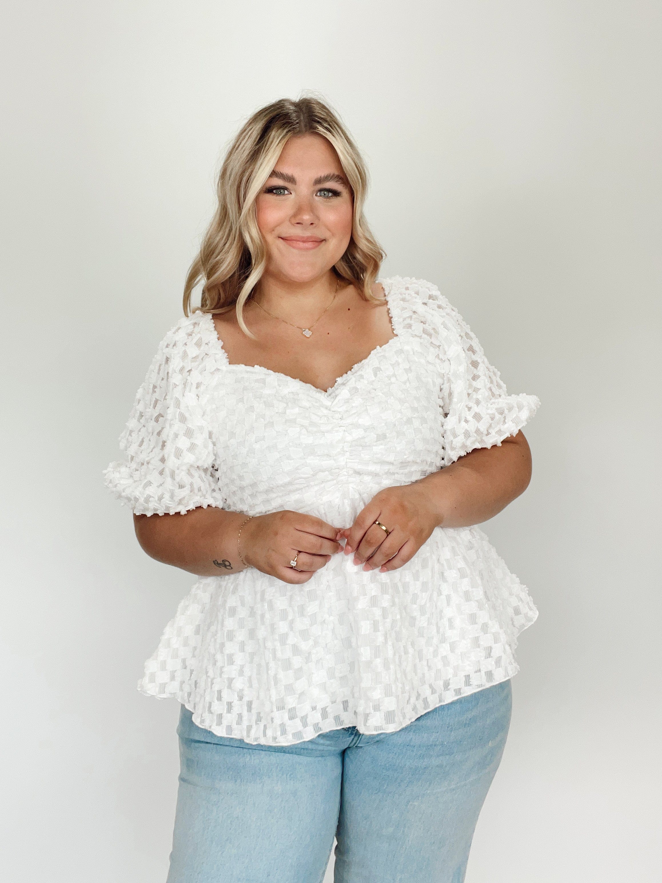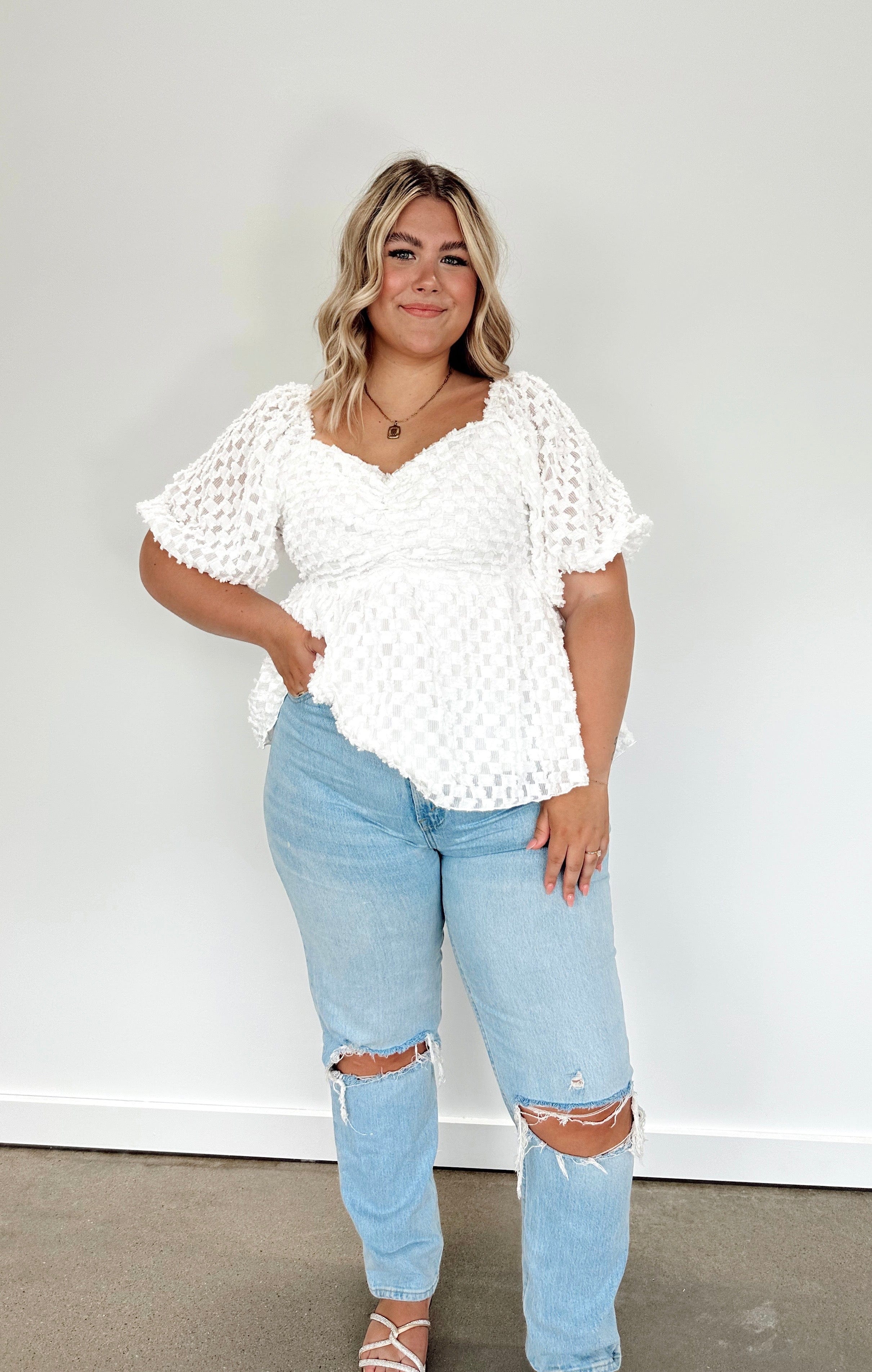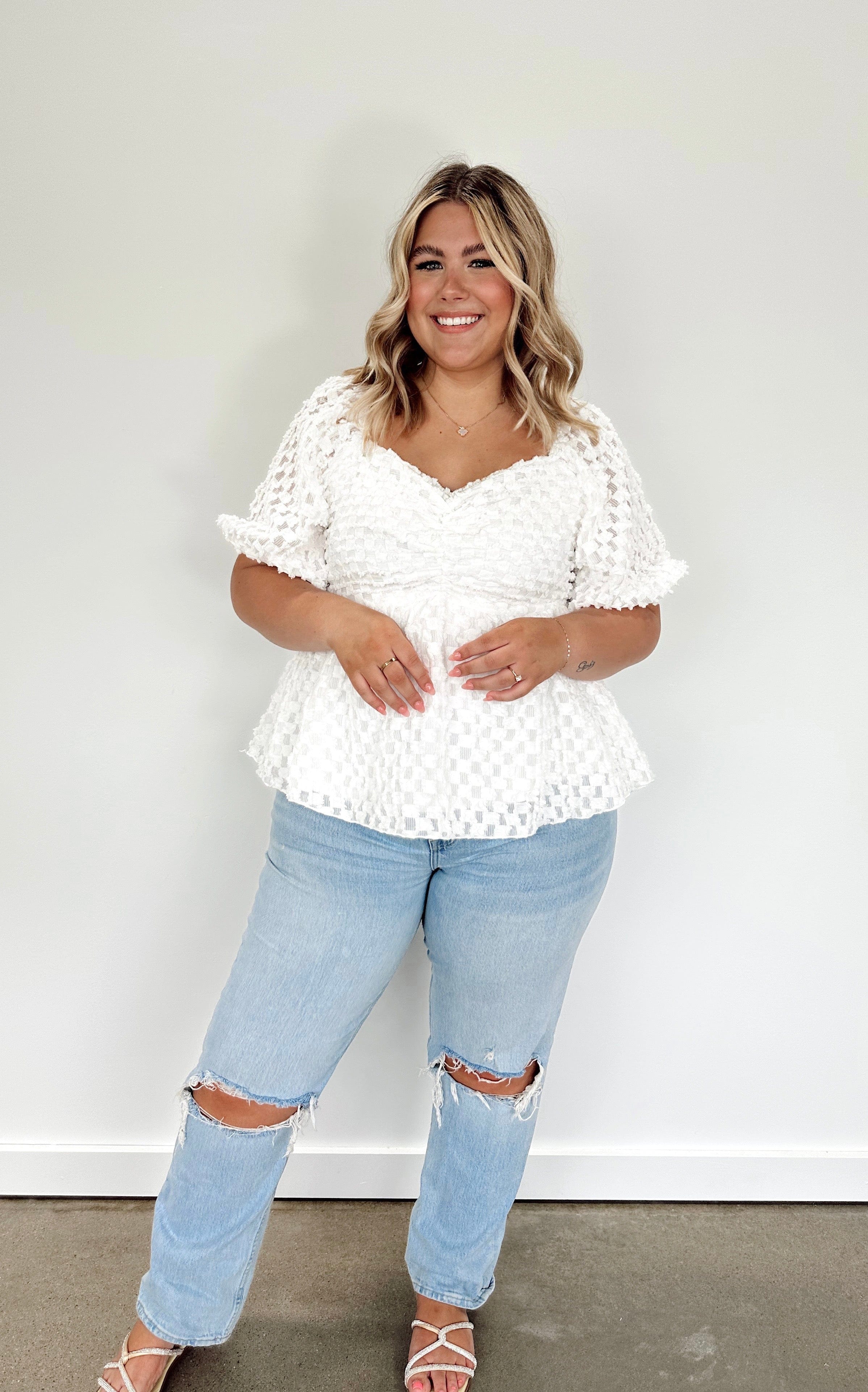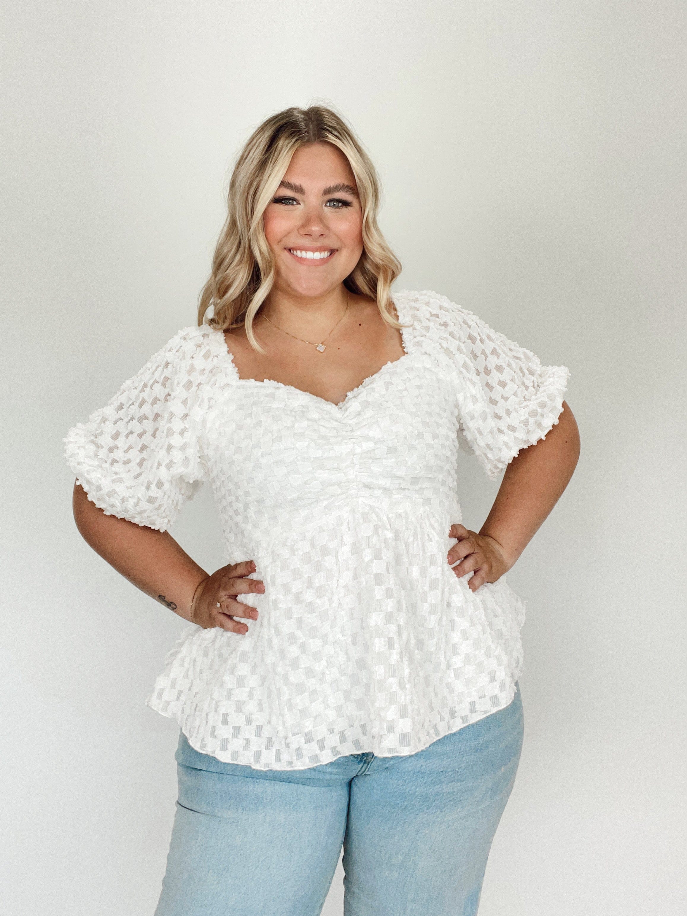The American Sweetheart Top, crafted from ultra soft fabric, is an ethereal piece of art. Featuring a stretchy smocked back panel, sweetheart neckline, and charming checkered pattern, it flaunts soft frayed details for a hint of playfulness. Its babydoll fit, puff sleeves, and light, airy feel bring an angelic quality sure to turn heads. An ideal choice for warm spring and summer days, its girly look is sure to lend charm to any occasion.