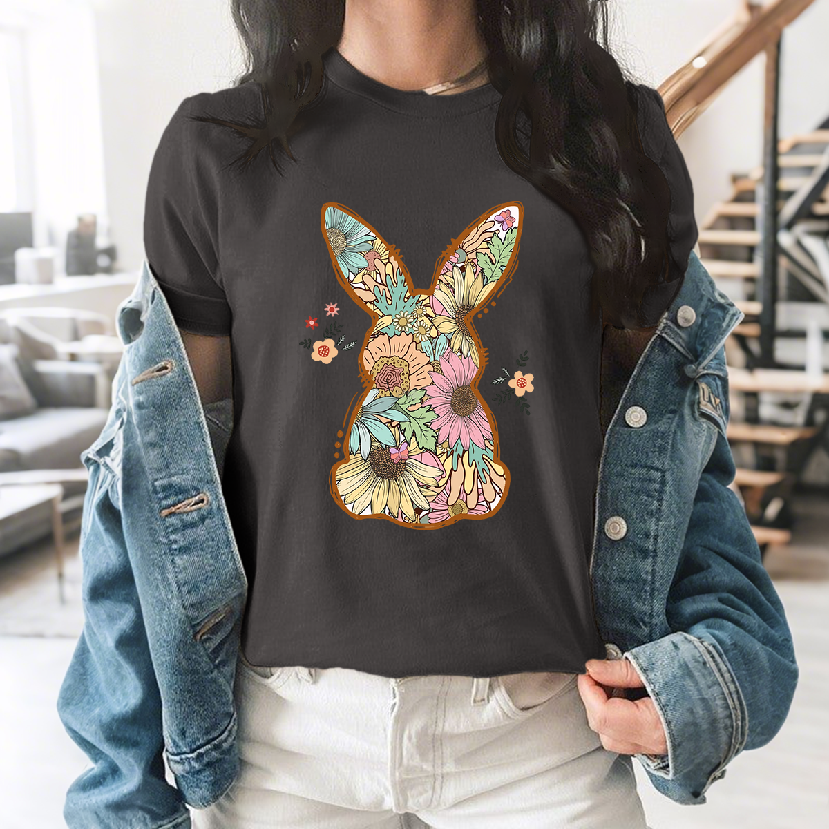 An Illustration Based On The Outline Of A Rabbit, With Floral Patterns Of Various Colors Filled In And Some Small Flowers And Leaves Dotted Around It, A Casual T-Shirt.