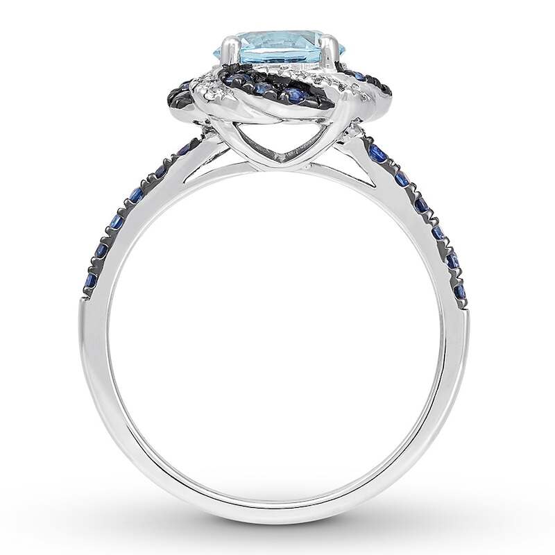 A mesmerizing display of color makes this engagement ring a truly stunning symbol of love. Ribbons of round lab-created blue sapphires and shimmering round diamonds swirl outward from the round-cut aquamarine center, while more lab-created blue sapphires decorate the band. The 14K white gold ring has a total diamond weight of 1/15 carat.