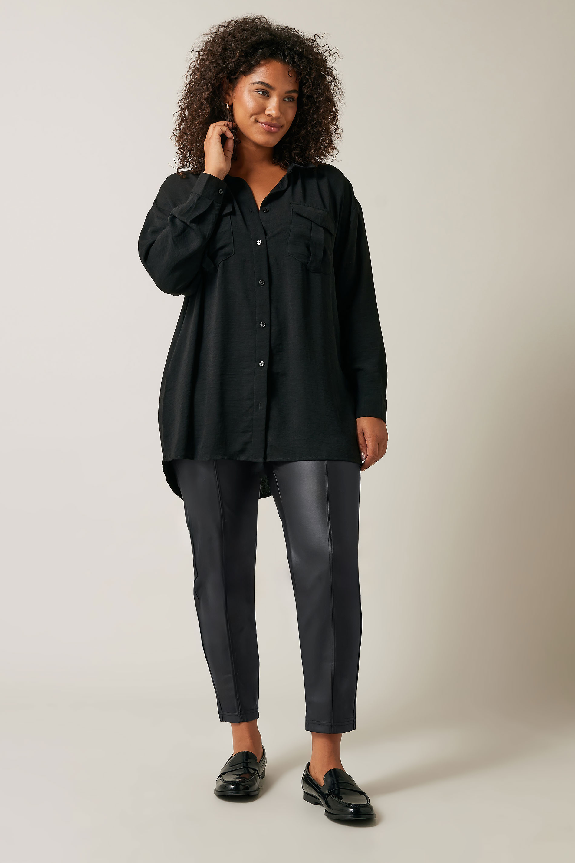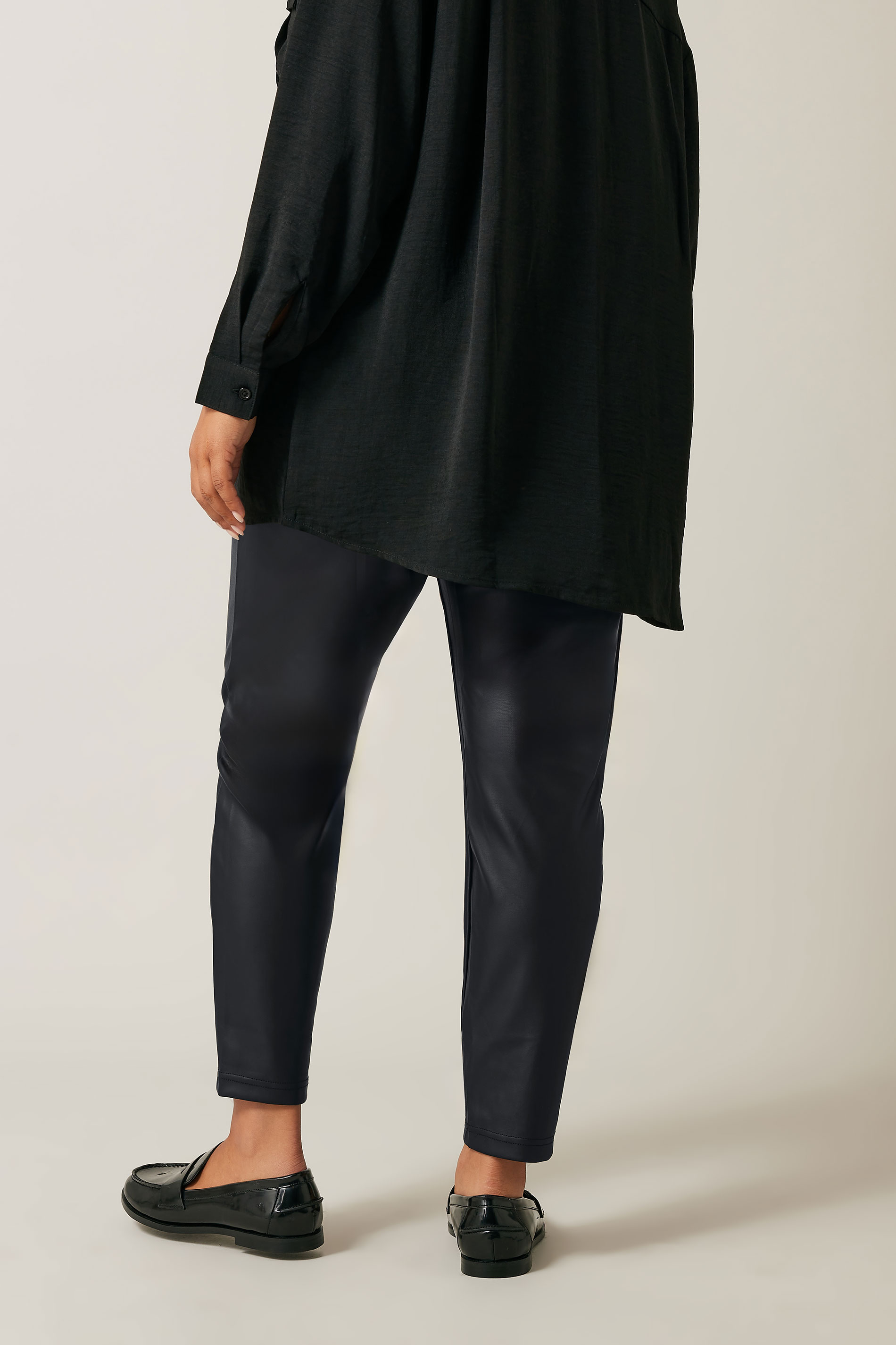 Experience the perfect fusion of edgy style and comfort with Avenue Black Leather Look Stretch Trousers. Crafted to mimic the allure of leather, these trousers offer a sleek and versatile addition to your wardrobe. The stretch fabric ensures a flattering fit while the leather-like finish adds a touch of urban sophistication, making these trousers a bold choice for any occasion.