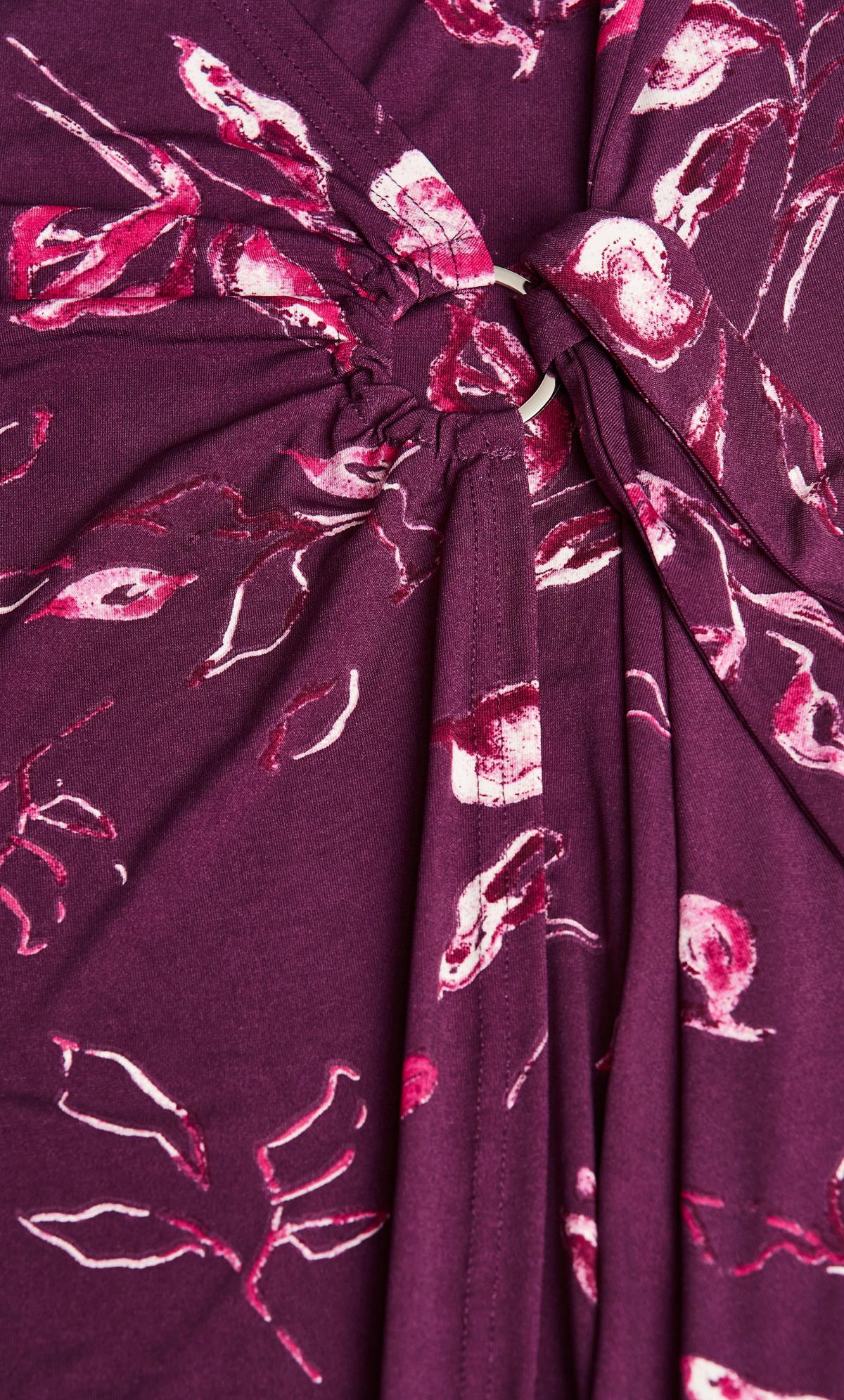 - Faux wrap silhouette with self-tie and ring detail