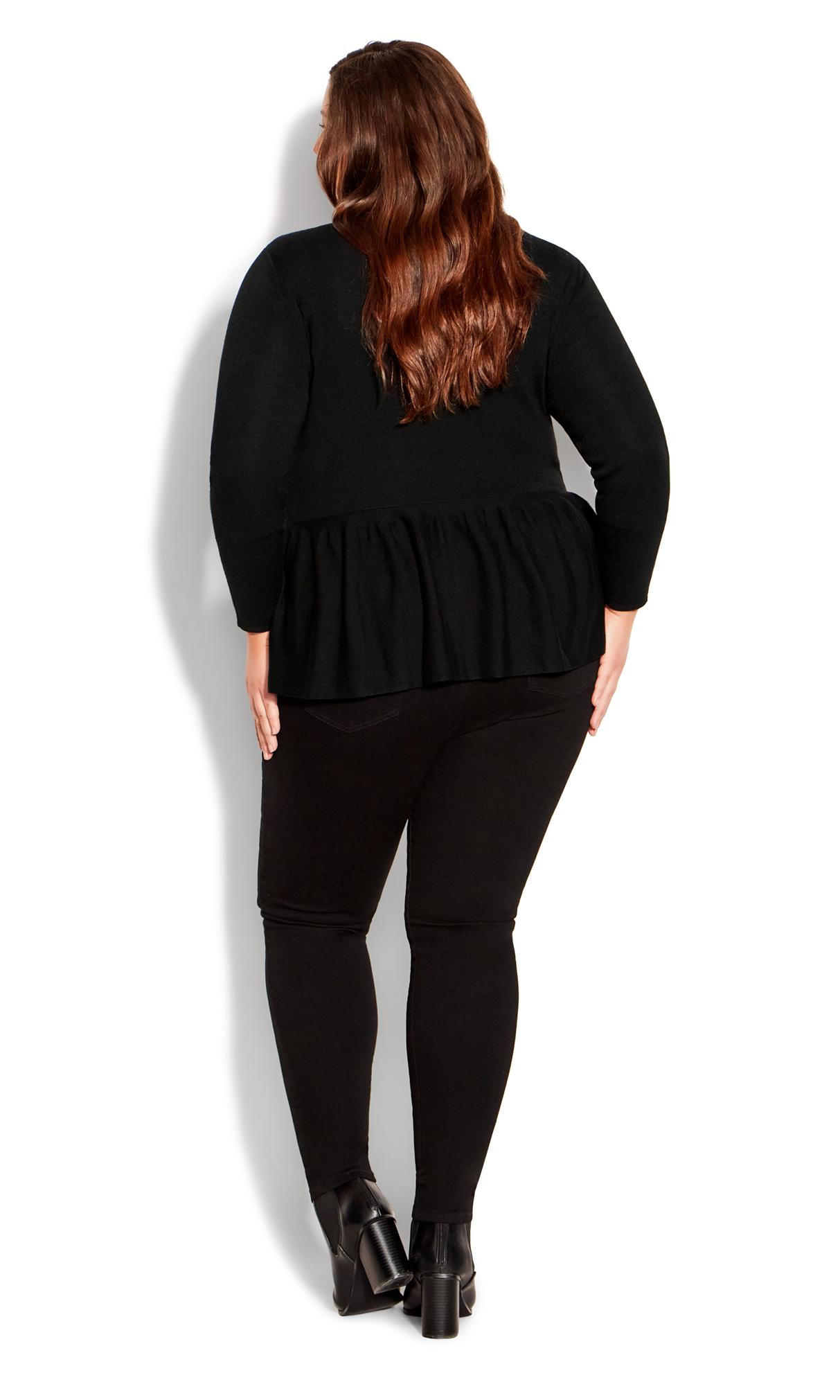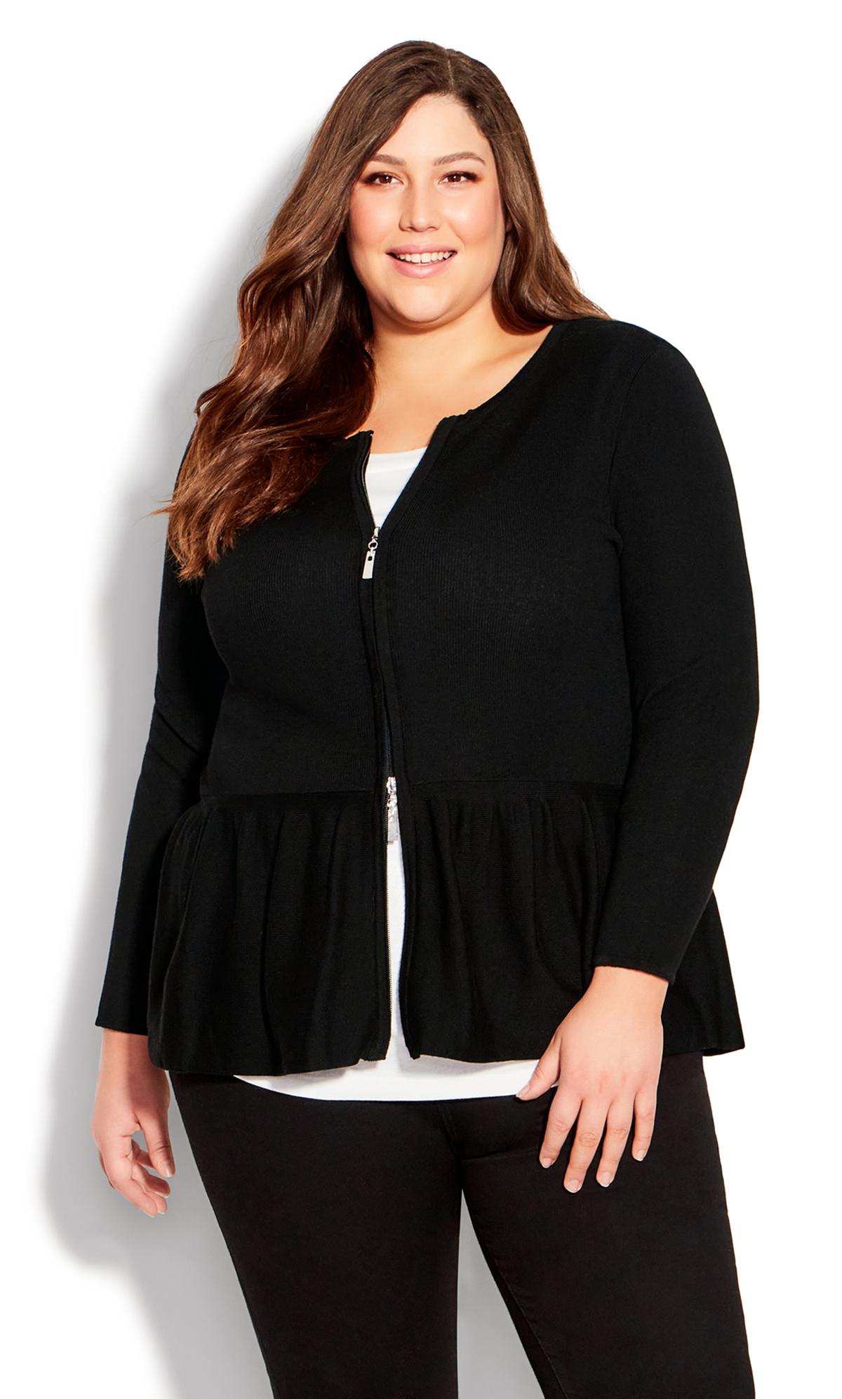 Add flair to your cozy style with Avenue's Black Zip Front Frill Cardigan. The classic black hue meets a modern zip front and playful frill detailing, creating a charming and stylish layer. With its versatile design, this cardigan effortlessly blends comfort and fashion, making it a must-have addition to your wardrobe.