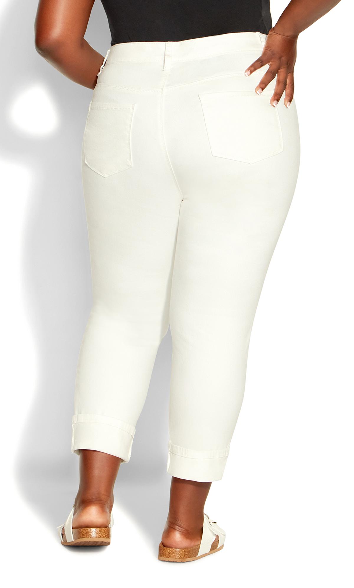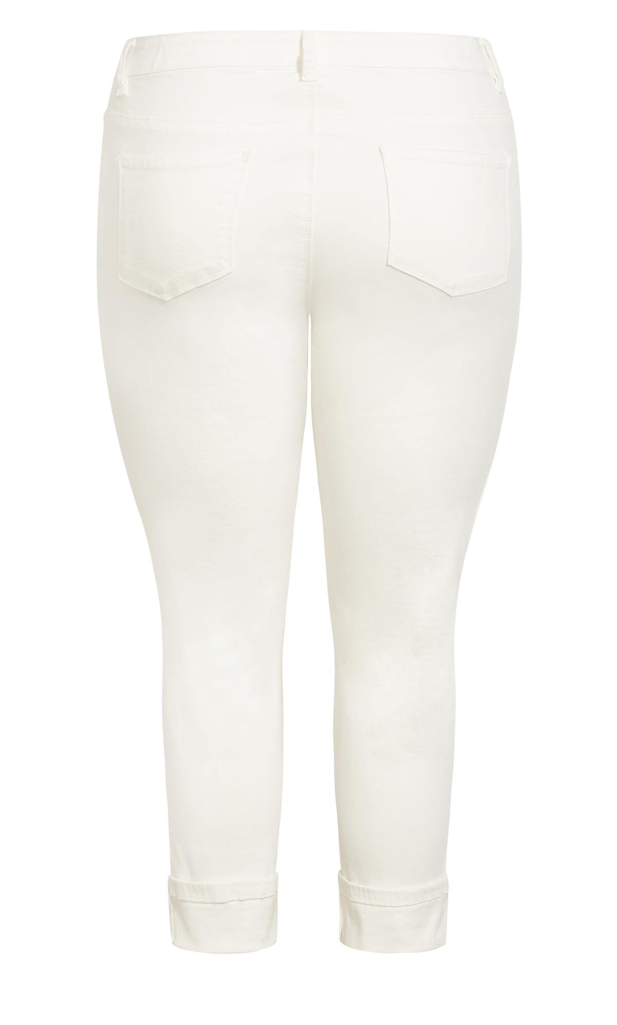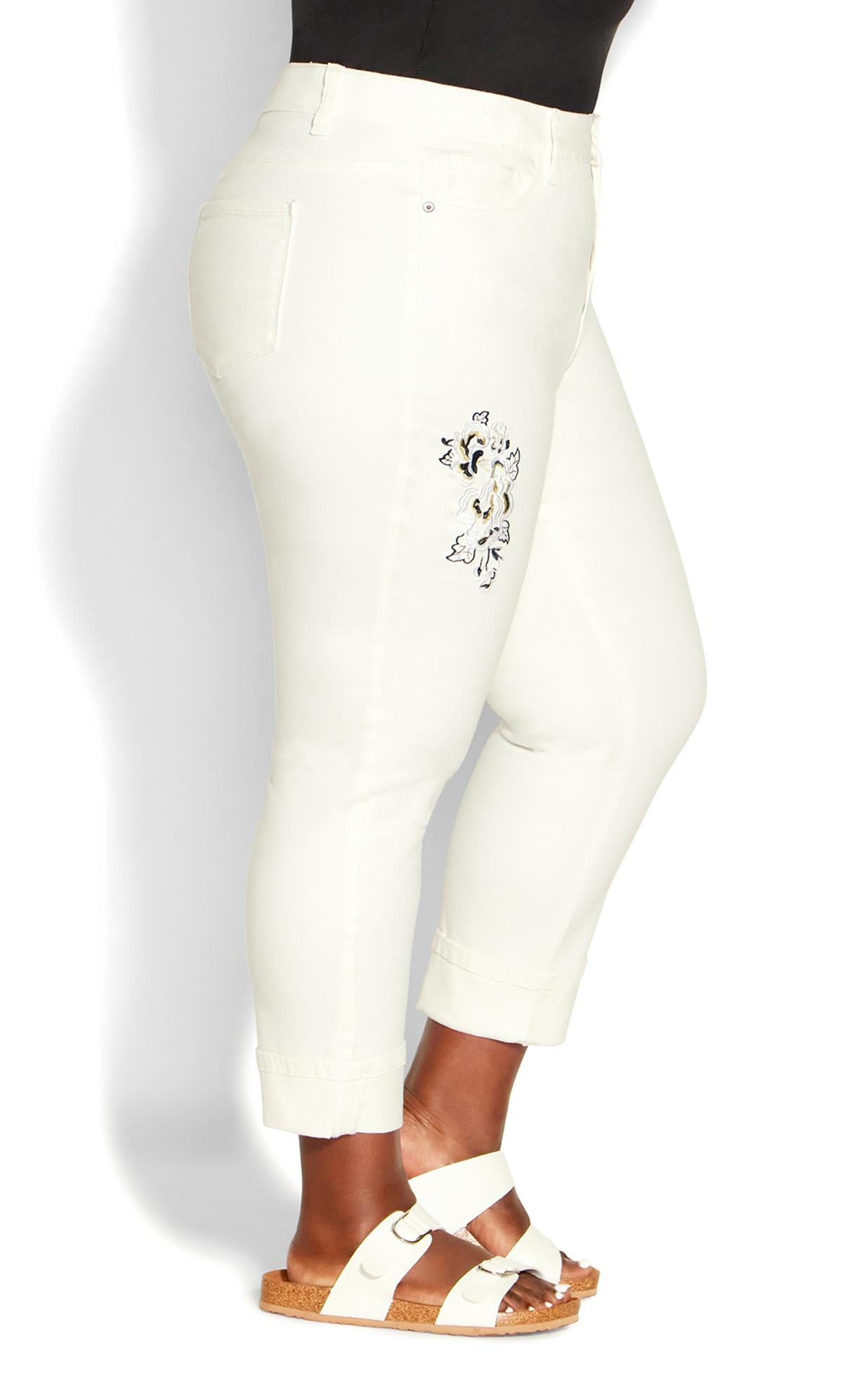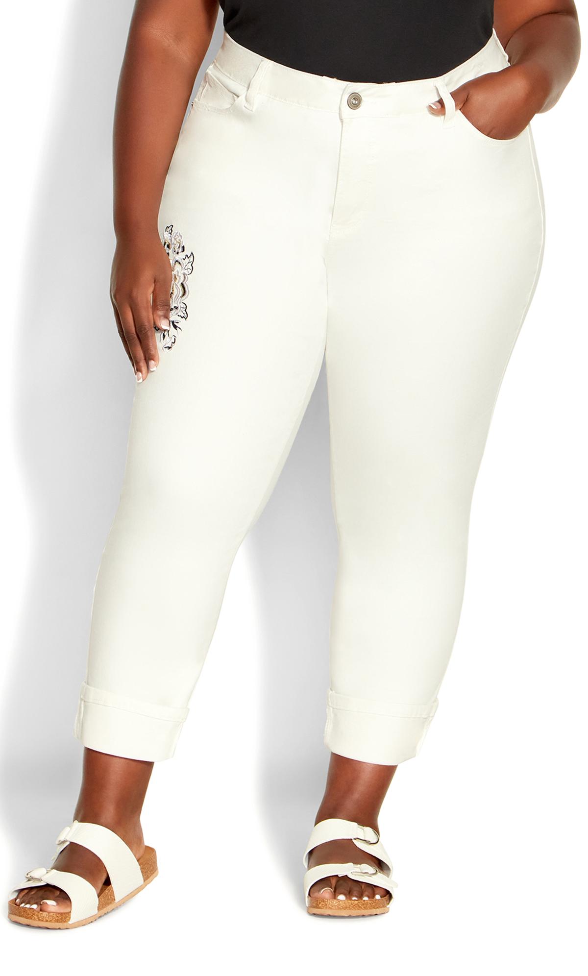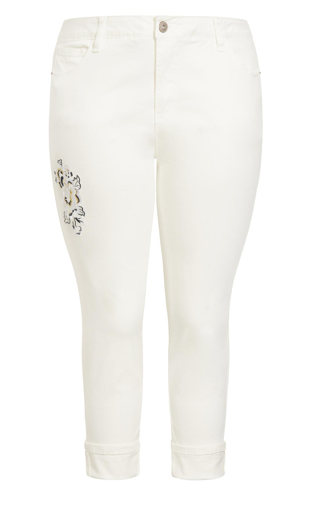 Show off your style with the Embroidered Turn Up Denim Crop. Perfect to complete any outfit, these white jeans add a crisp touch to your wardrobe with their straight leg fit and turned up hemline. The embroidery thigh detail is a dreamy touch for a classic silhouette.