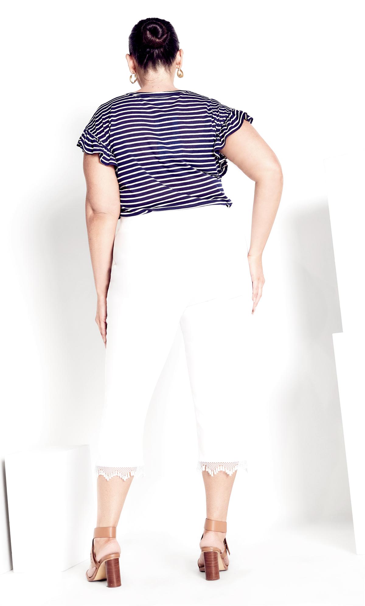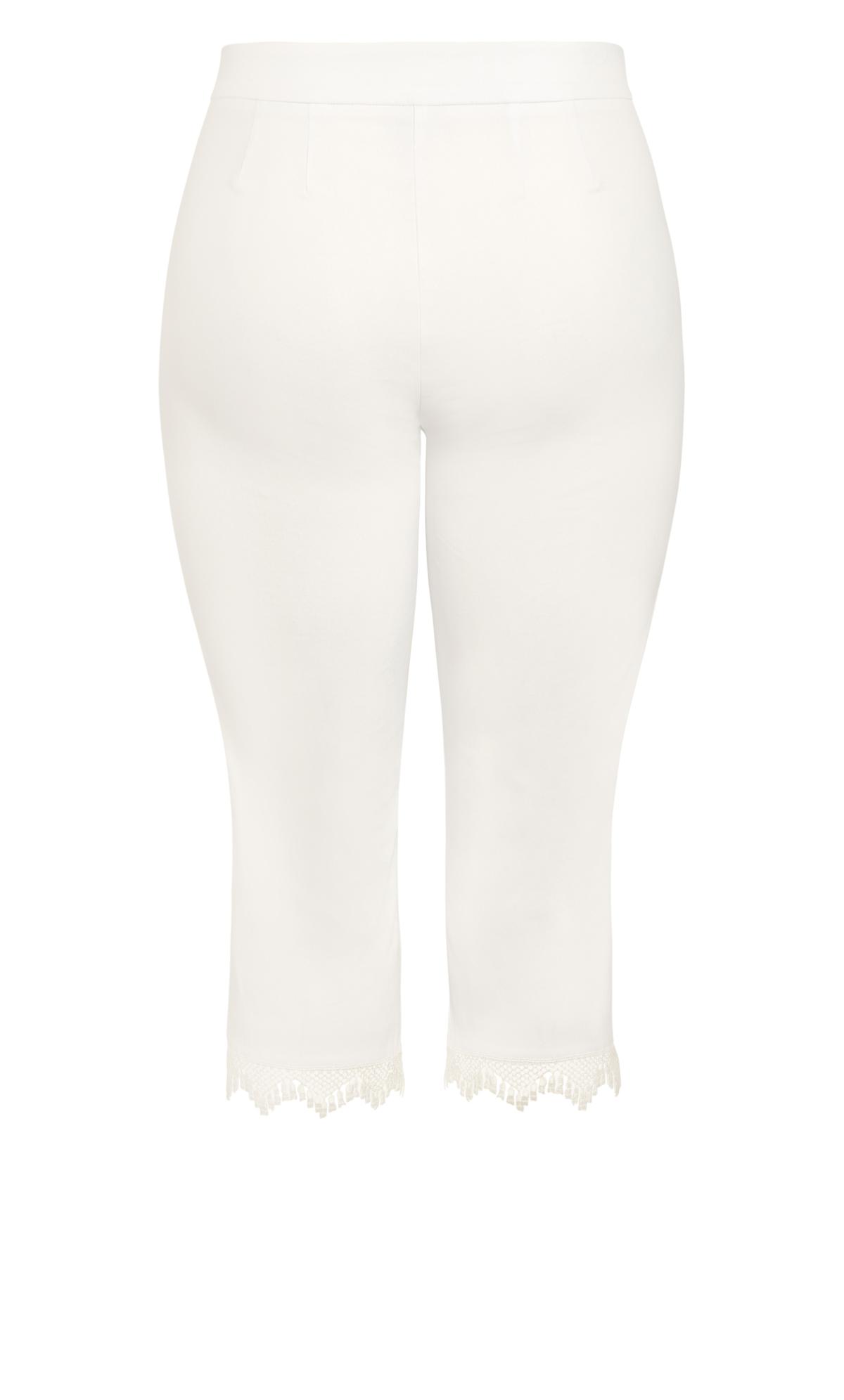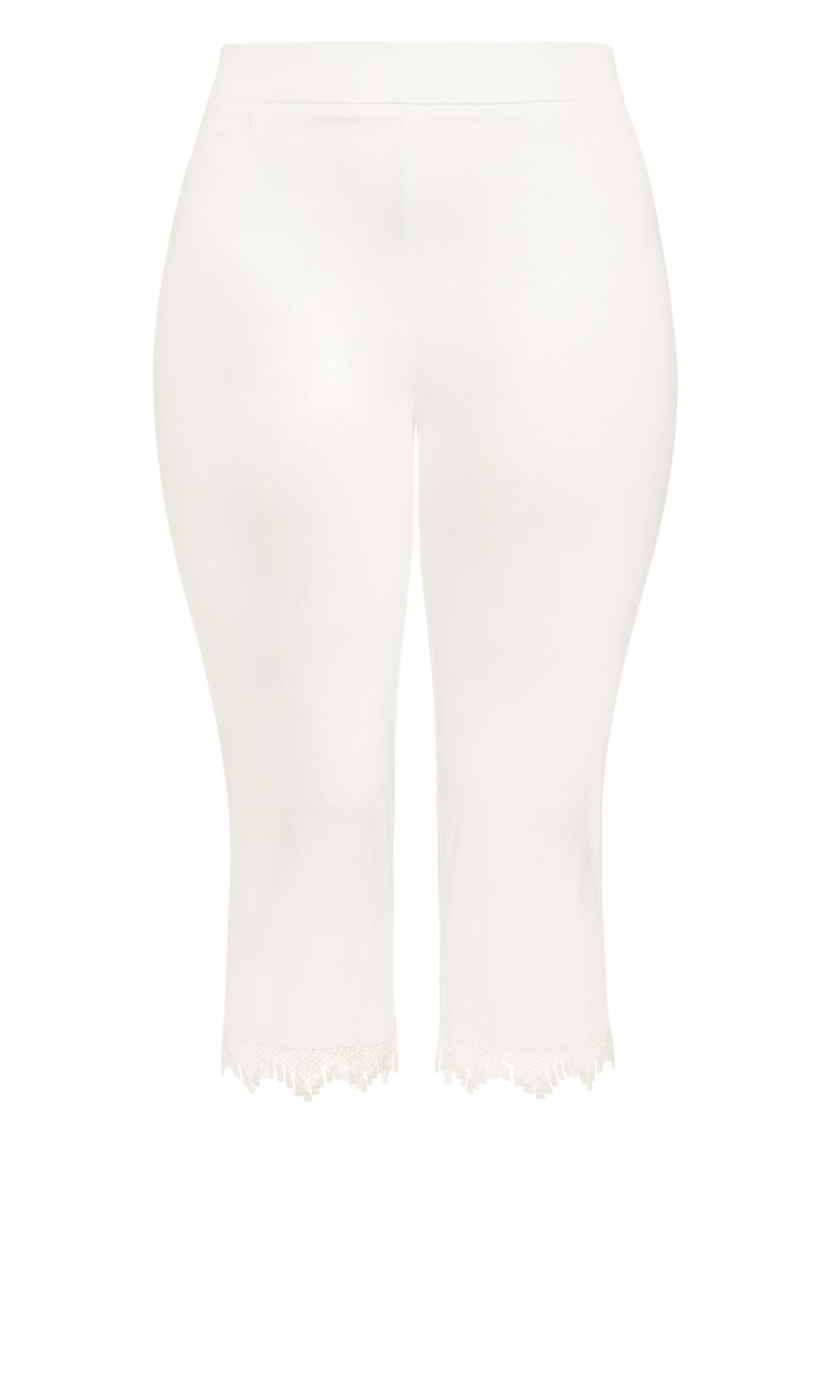 Elevate your everyday style with Avenue White Lace Trim Cropped Leggings. The delicate lace detail adds femininity to the classic white design, perfect for casual outings. Experience comfort and style in one chic package.