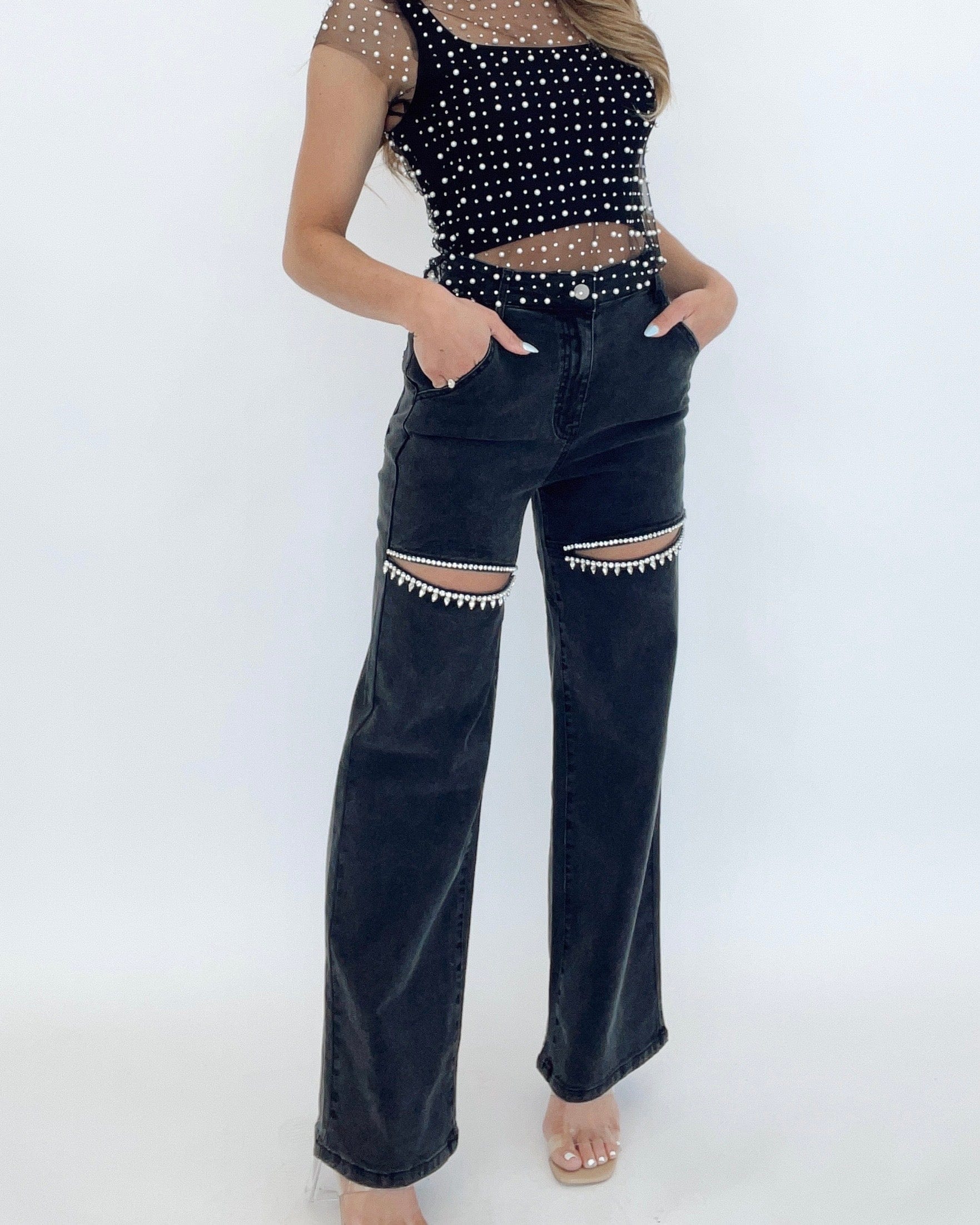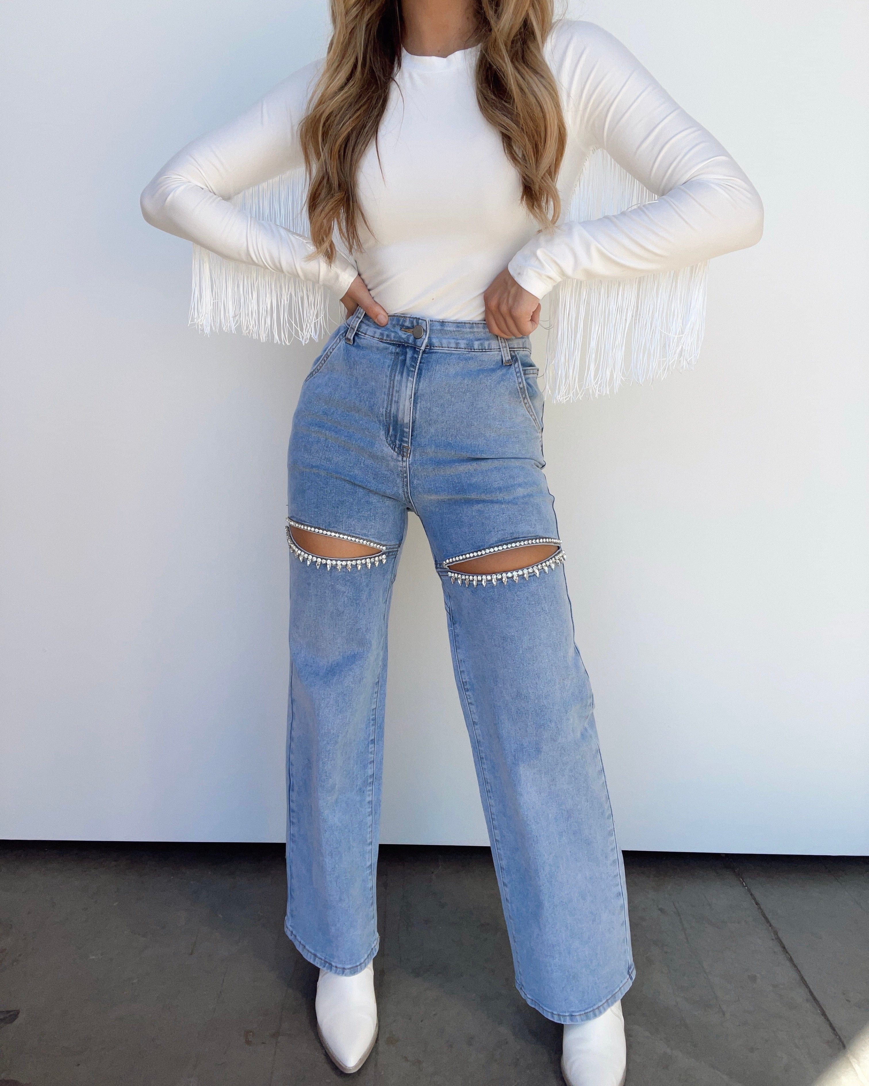 Elevate your wardrobe with our Ballerini Denim jeans. They feature subtle rhinestone details, front cutout details, and a button and zipper closure for a secure fit. Boasting a classic light wash that can be dressed up or down, these jeans are a must have for any concert or festival. The flare fit ensures a trendy look with an elevated glam factor that will make you shine.