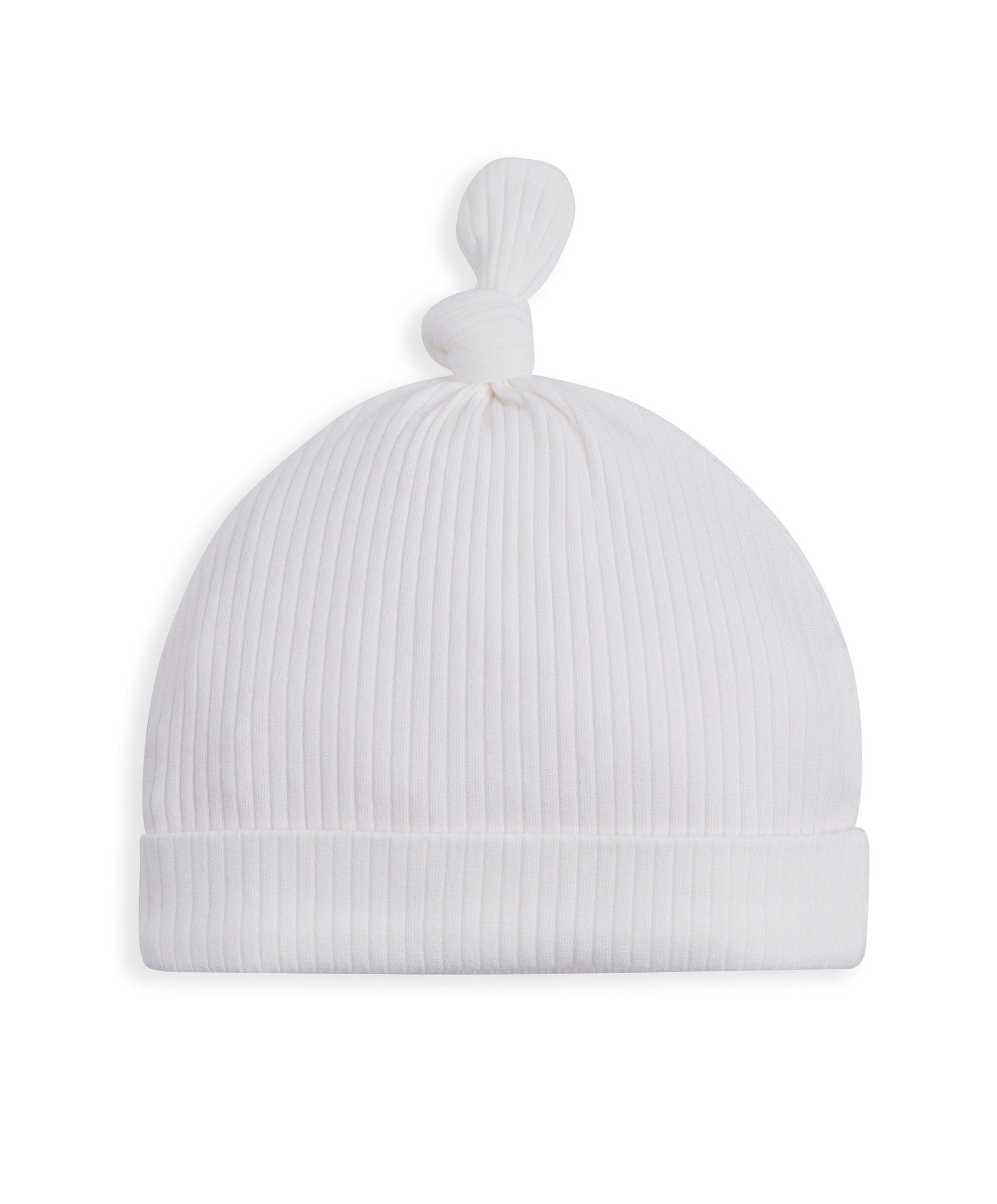 Keep your little one's head nice and cosy with this organic cotton white baby hat. Crafted from the softest ribbed cotton, it?s finished with a classic knot detail on the top.