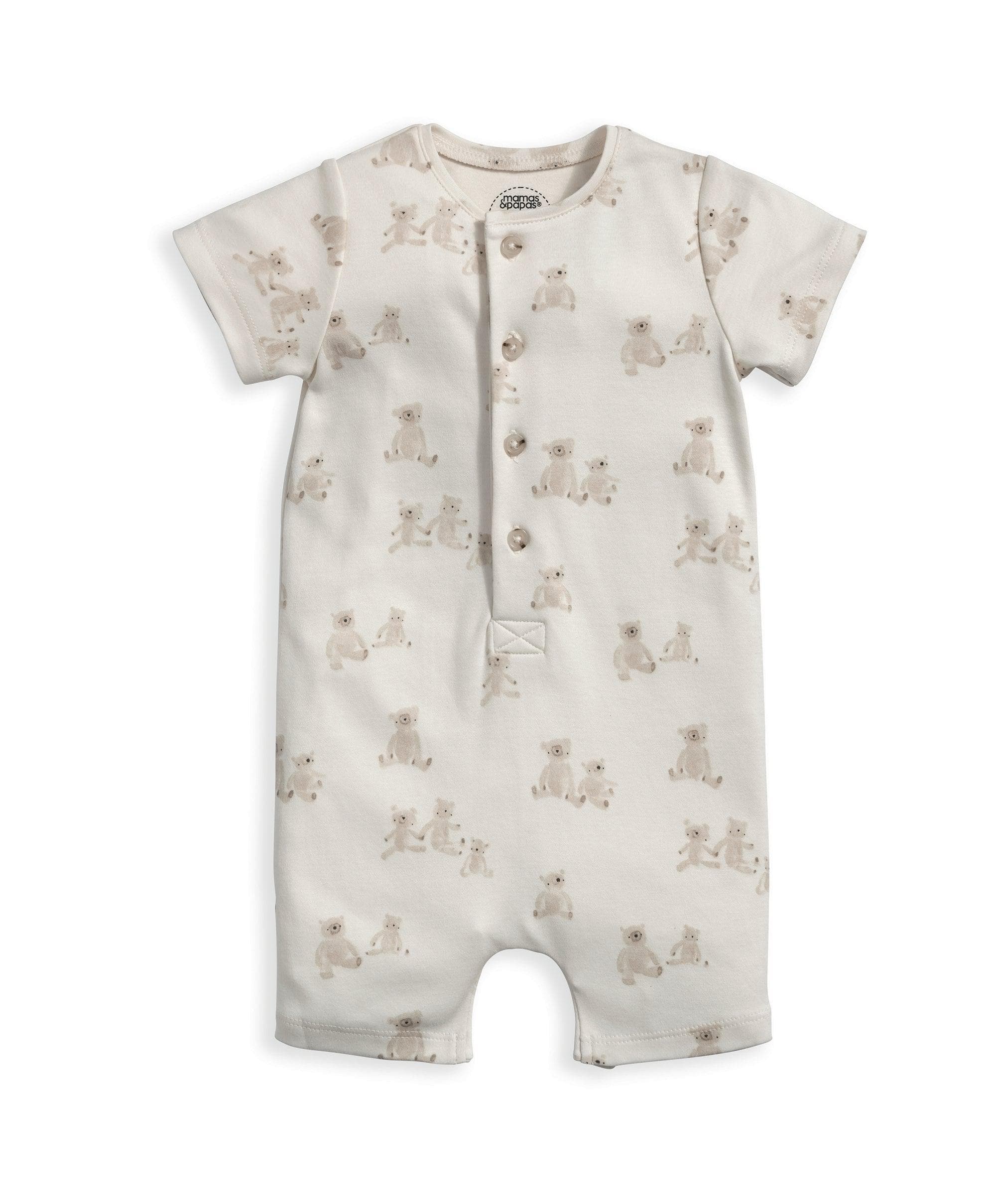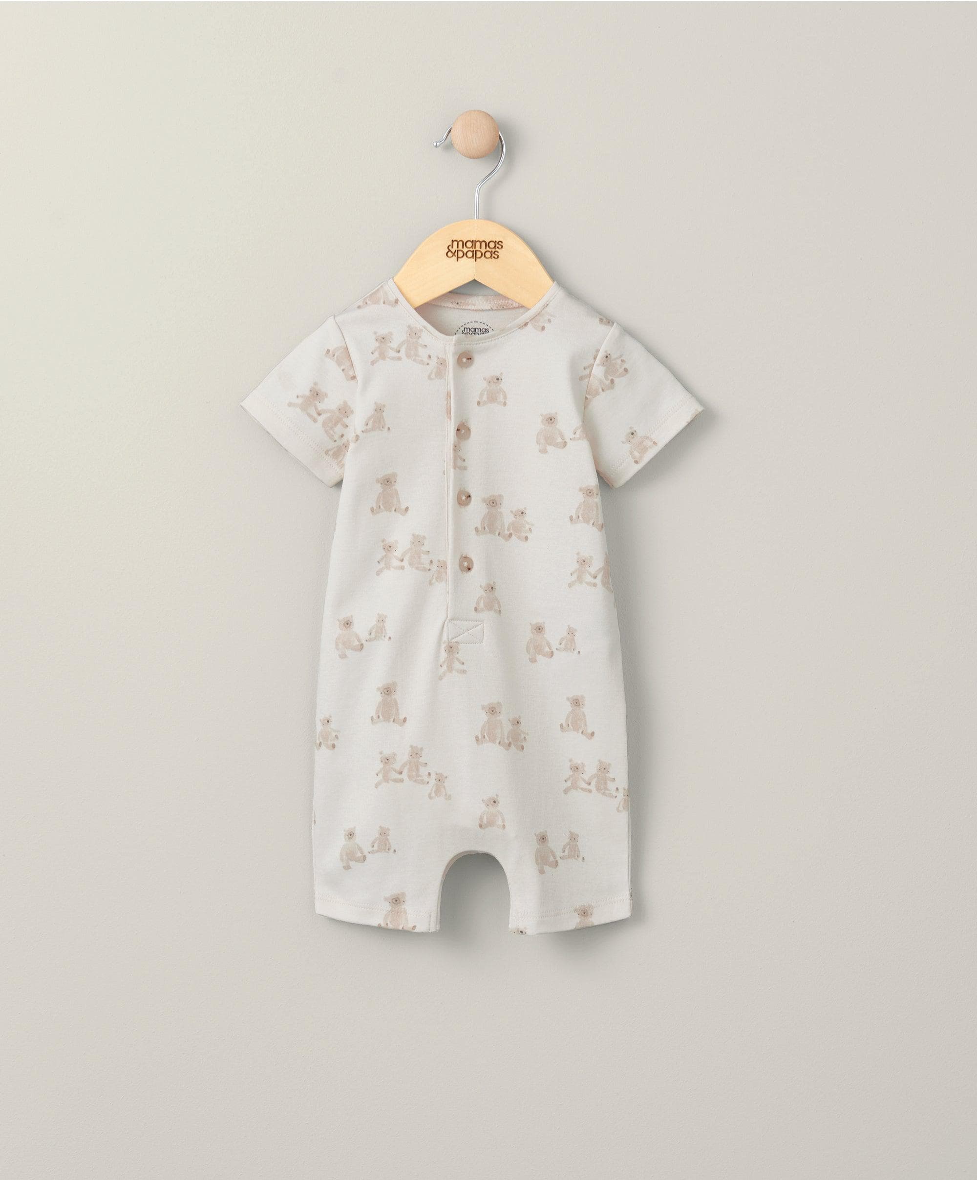 Short-sleeved shorts romper in an adorable bear print. With button fastening down center front neck and additional popper crotch fastening for easy nappy changes. Made from supersoft cotton that's gentle on newborn skin.