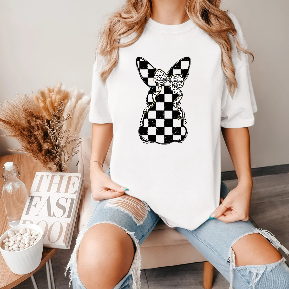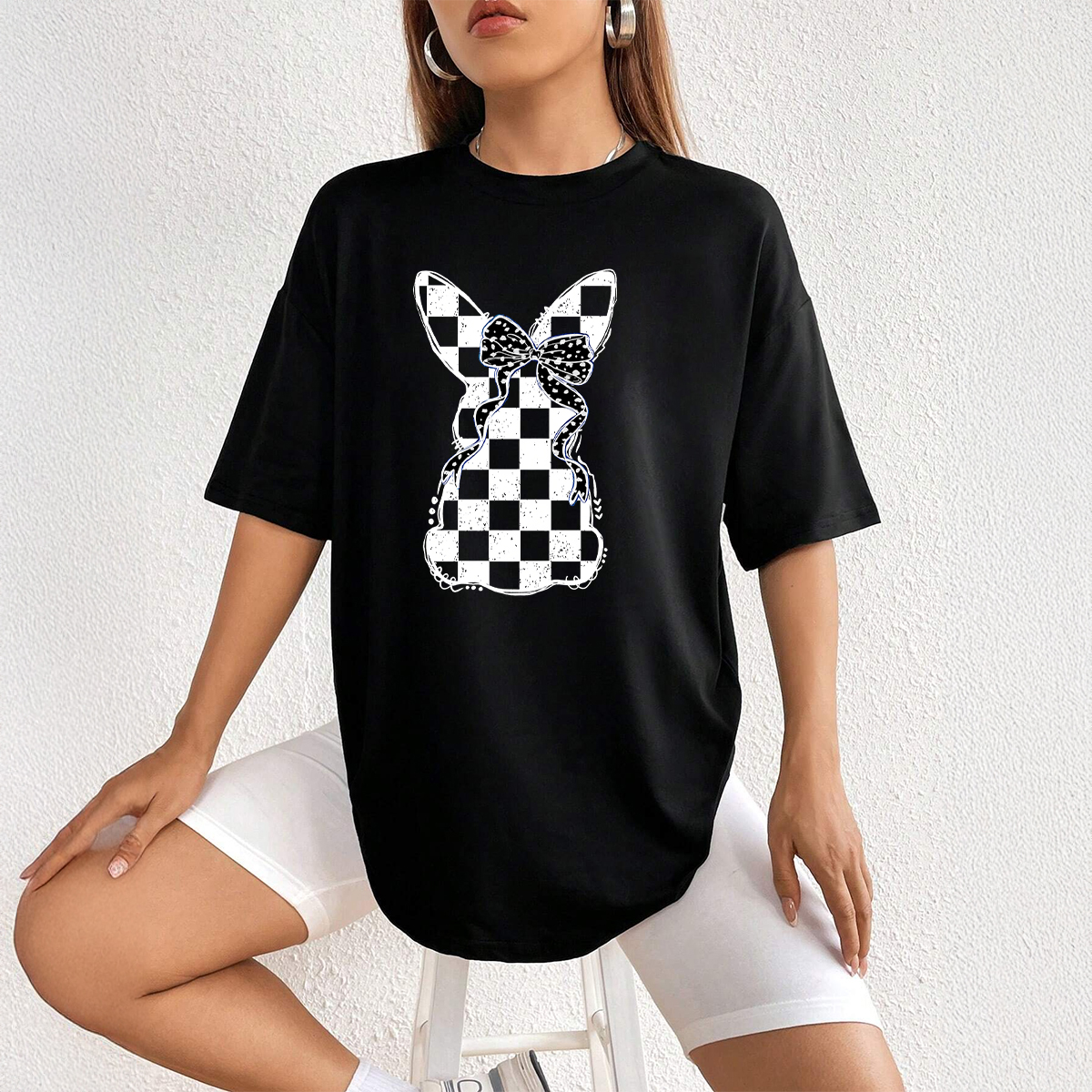 Black And White Checkerboard Easter Bunny Printed Round Neck Short Sleeve T-Shirt