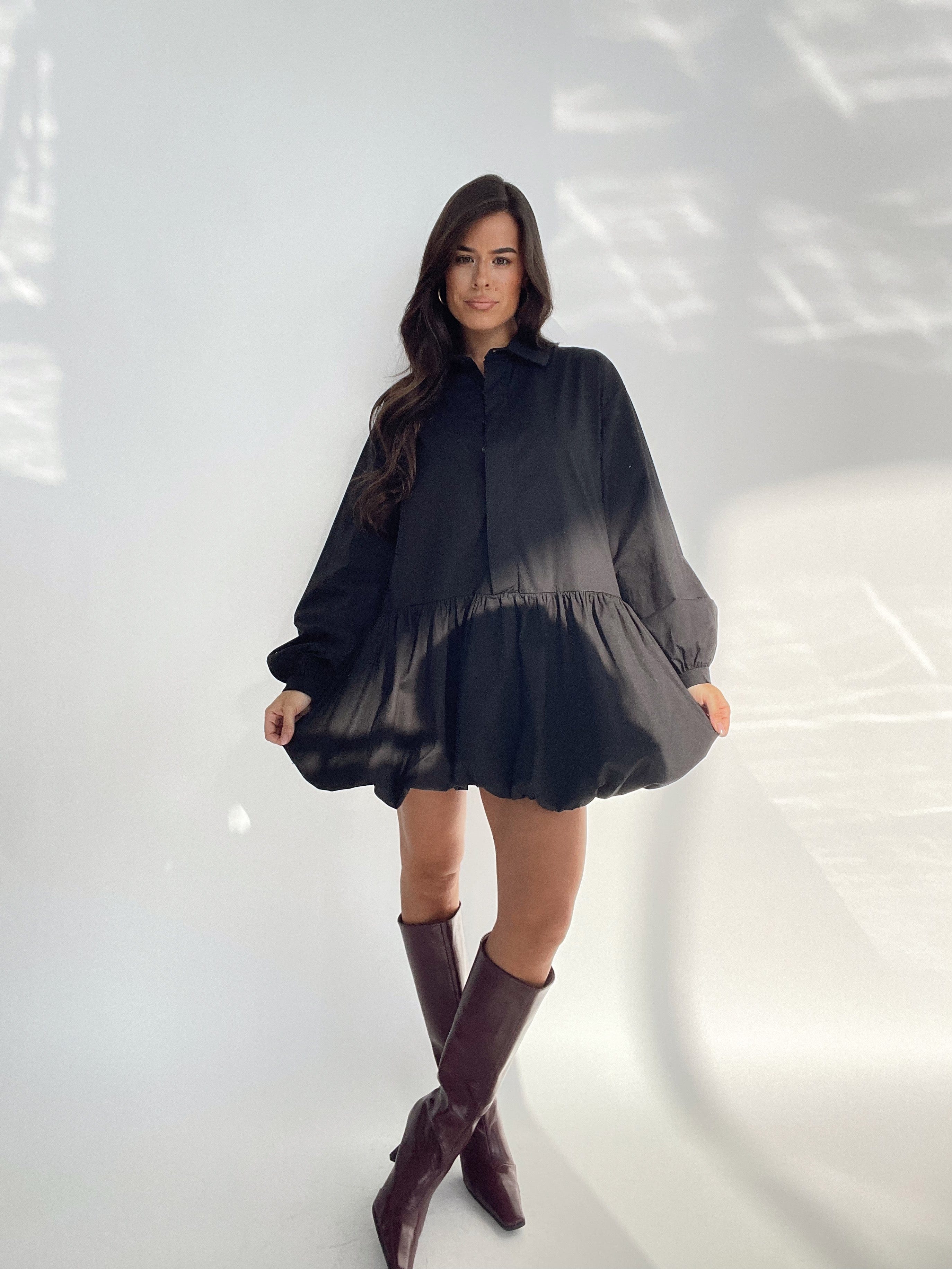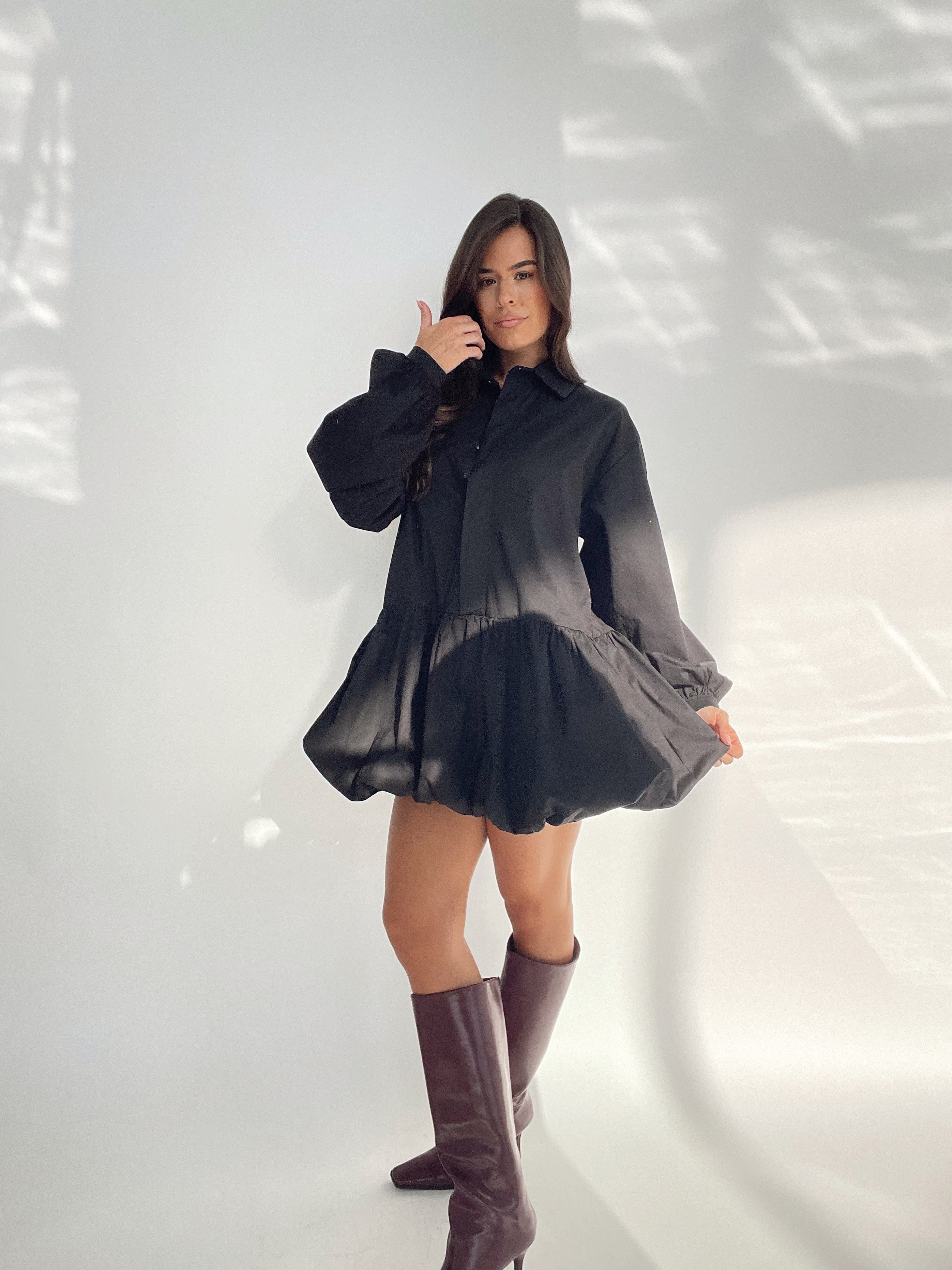 This Black Bubble Skirt Shirt Dress is a versatile and stylish choice for any occasion. The bubble skirt adds a touch of fun and whimsy, while the mini dress length keeps it trendy. Made from high-quality materials, this dress is comfortable and easy to wear. Perfect for a day out or a night on the town.