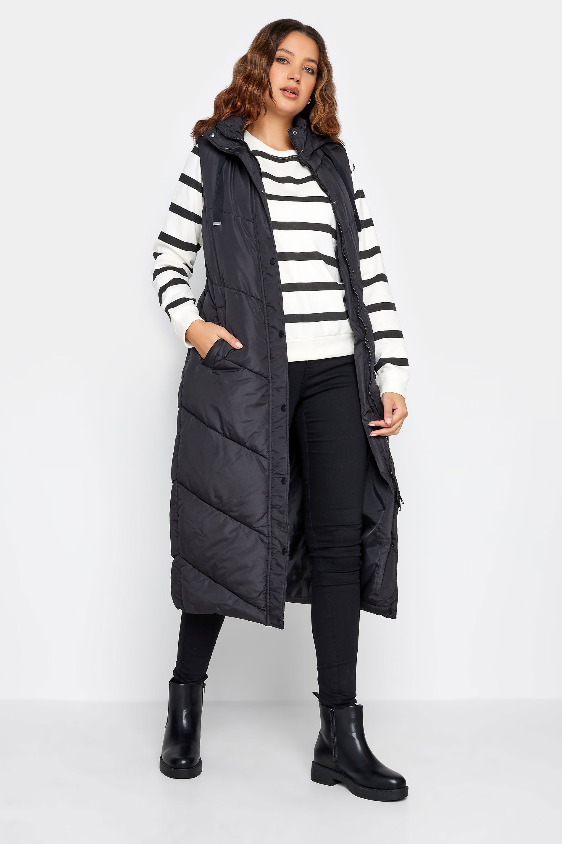 Upgrade your everyday looks this season with this new-in longline gilet. Made from a comfortable woven fabric, it features a hood and drawstrings, popper fastenings and two side pockets, complete in a chevron quilted design. Simply layer over a jumper and jeans for the perfect transitional look.