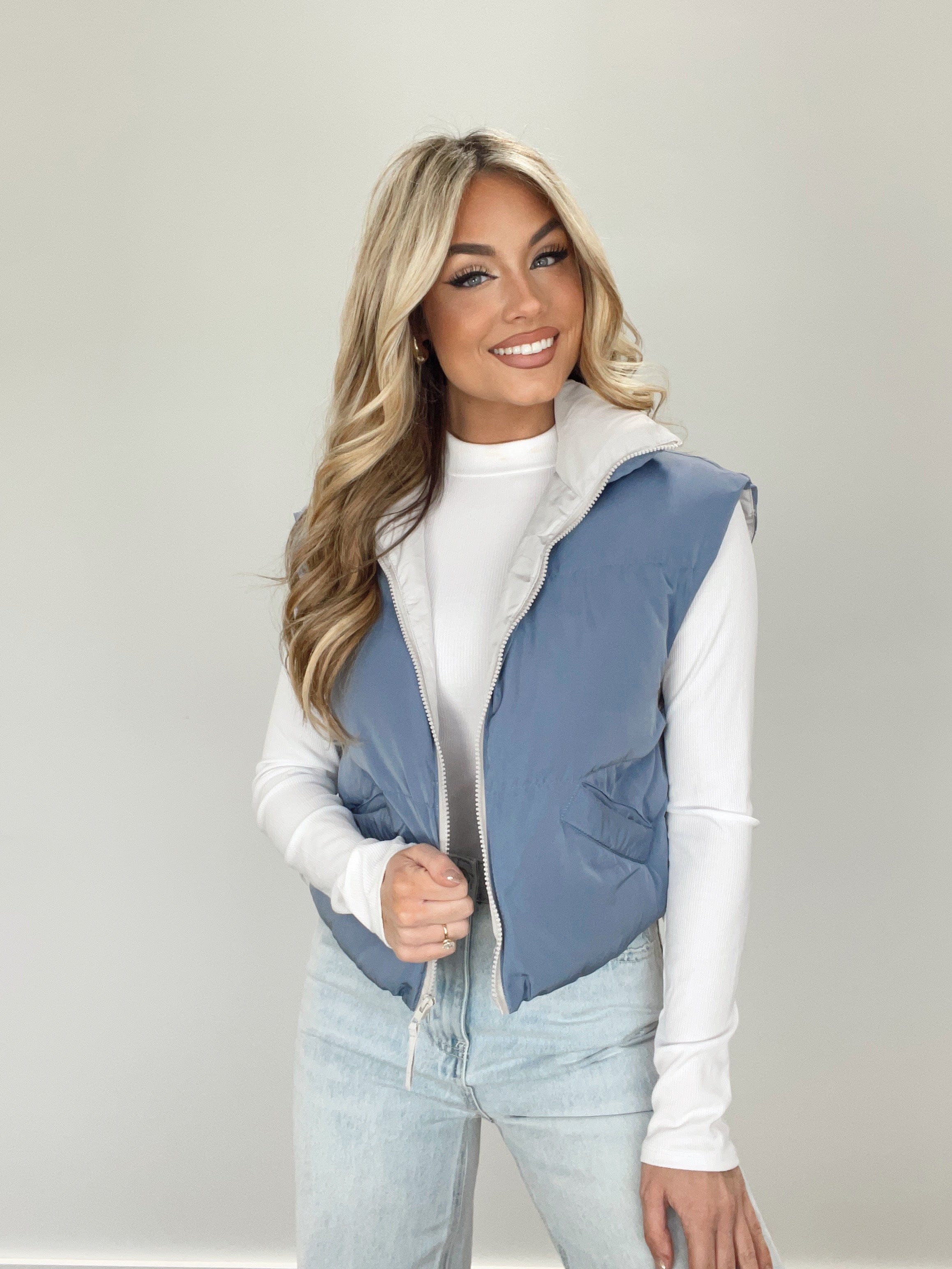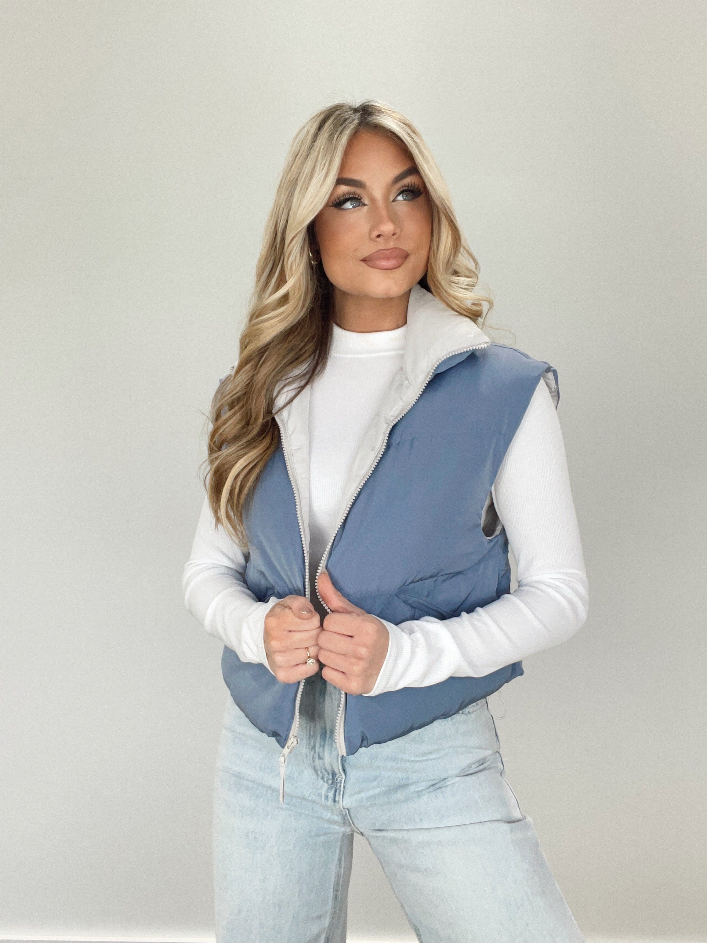 Introducing our Blue Puffy Vest - the perfect puffer for your winter wardrobe. With a trendy two-tone design, collared neckline, and zipper closure, this elevated piece will keep you warm and cozy during all your errands and shopping trips. Adjust the drawstring waistline for a snug fit and layer over any outfit for a cool and stylish look. Don't forget to grab some hot cocoa while you're out and about.
