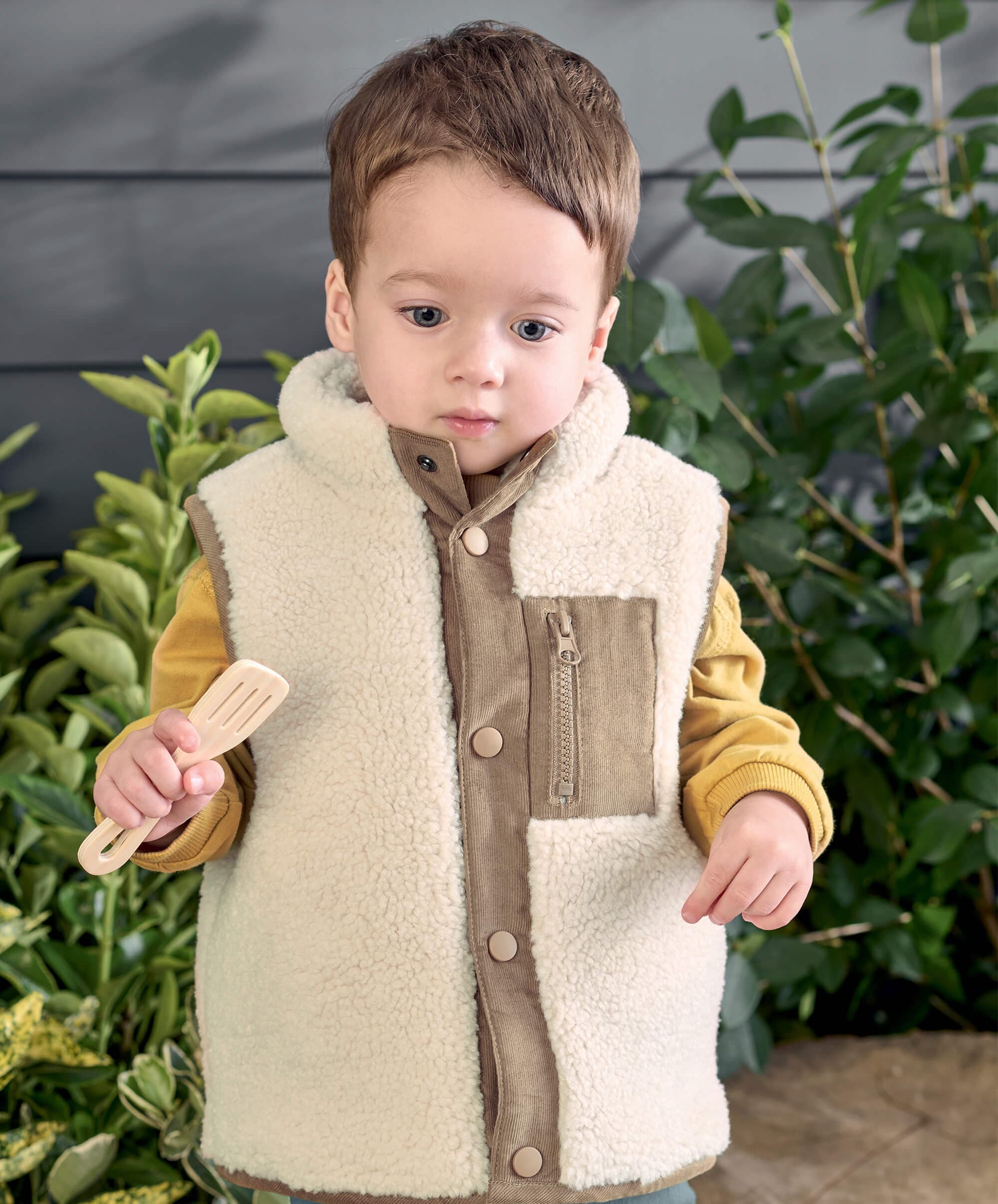A seriously stylish and practical piece! Boys' cream borg gilet, with easy zip fastening. Finished with contrast colour piping and pocket. Jersey lined for extra warmth. Perfect for layering.