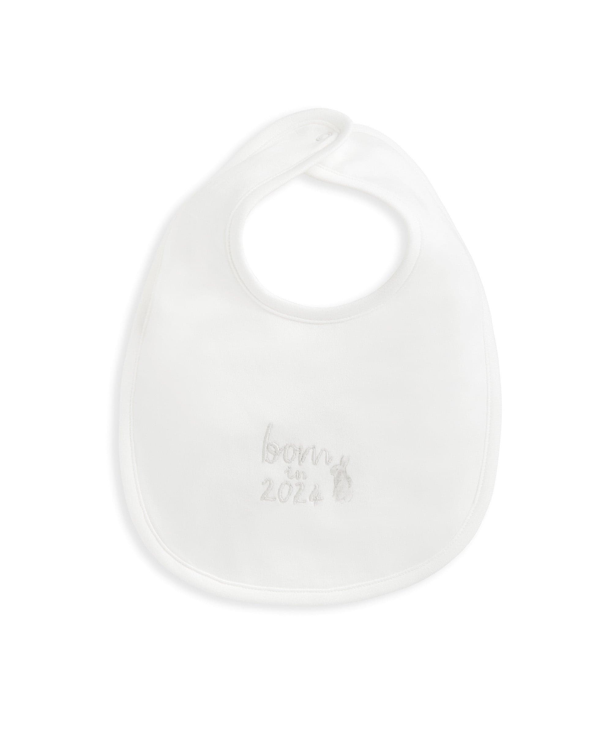 Adjustable bib with 'Born in 2024' embroidery and ring popper fastening.