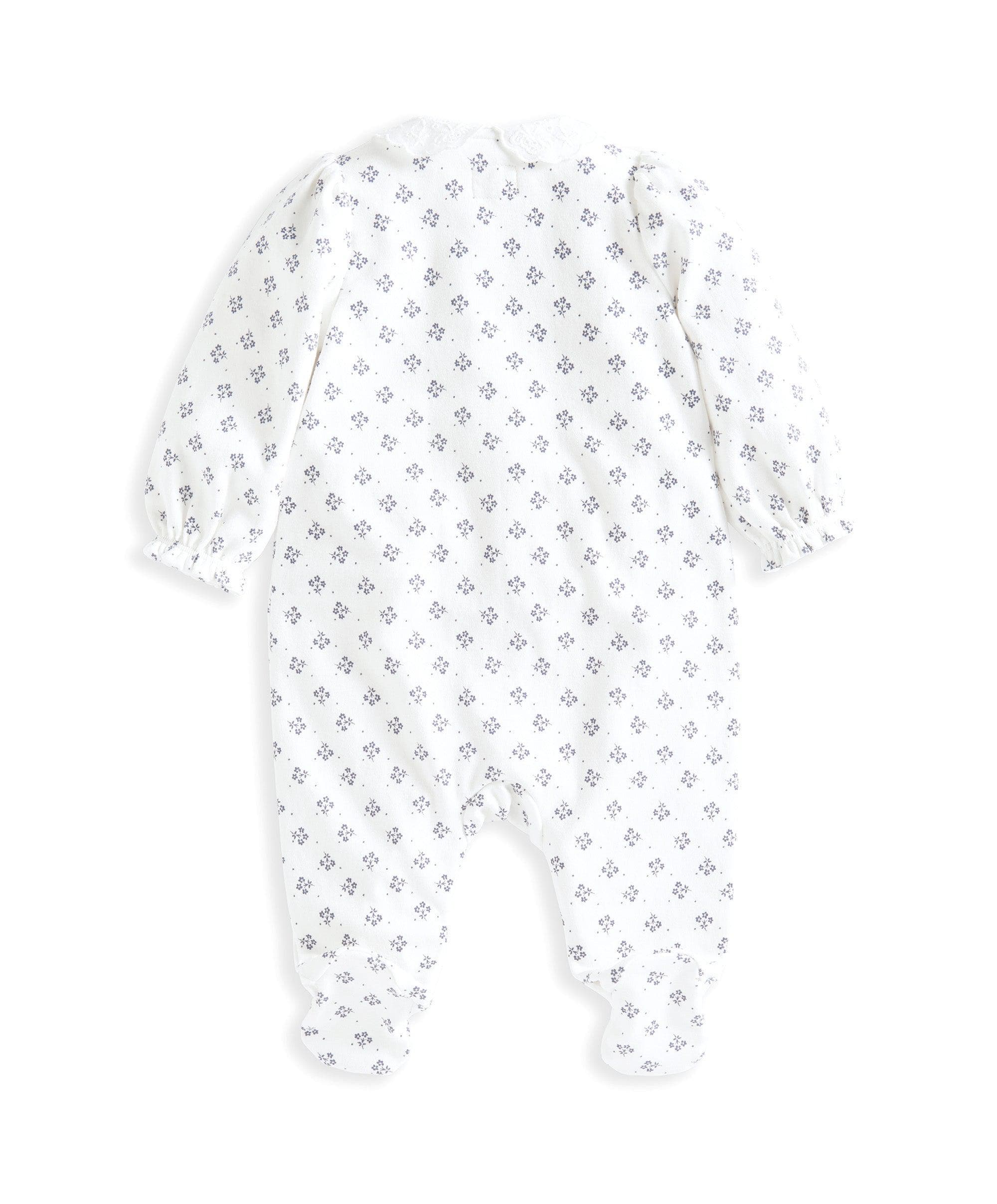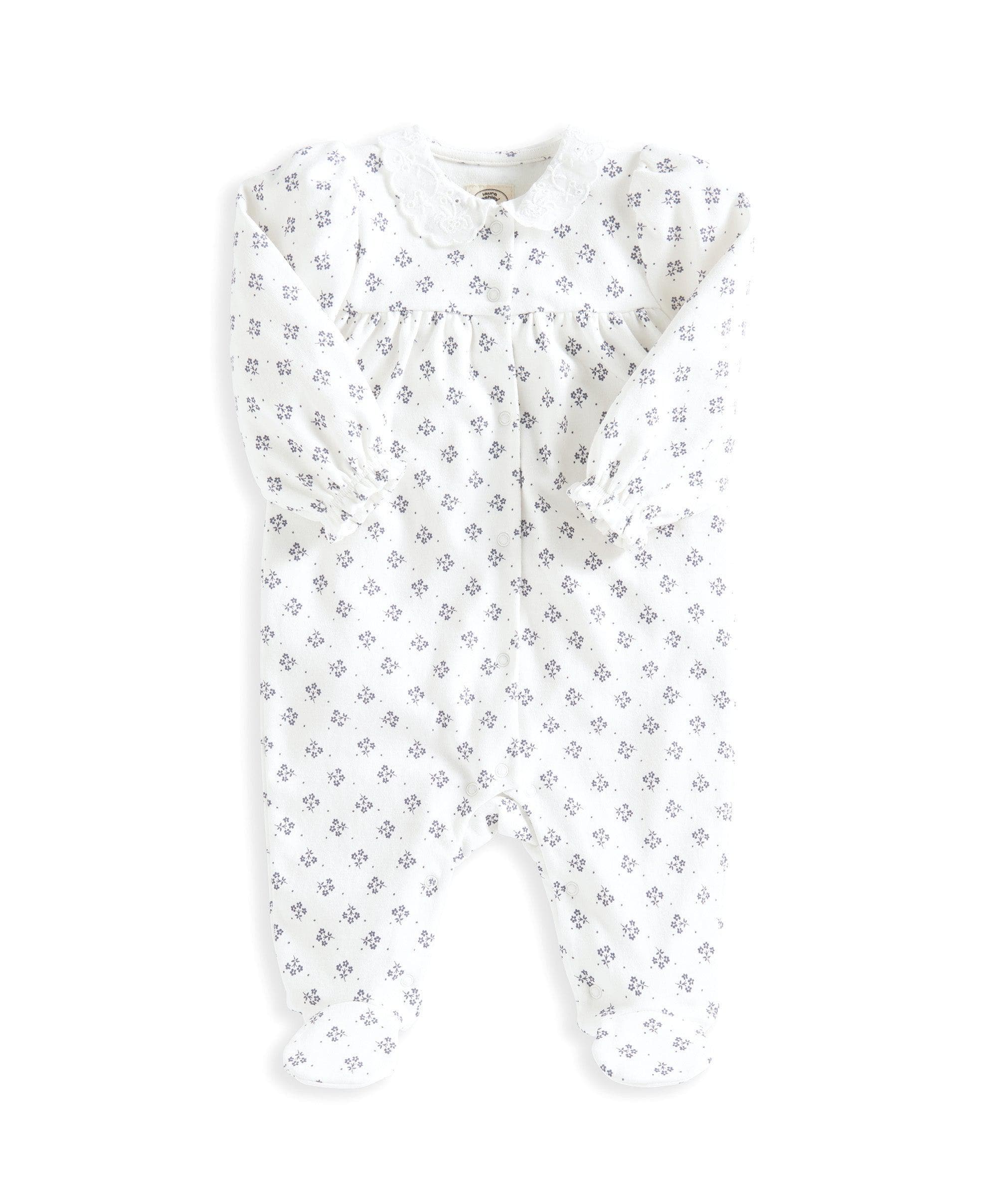 With its iconic heritage Laura Ashley 'Jess' print and pretty broderie collar, this sleepsuit is beautiful as well as practical. With long sleeves for warmth, elasticated cuffs for comfort and ease of fit and popper opening at both the front and along the gusset for easy dressing/undressing and quick nappy changes, this bodysuit is a functional item of clothing with all the hallmarks of this beautiful unique collaboration with Laura Ashley