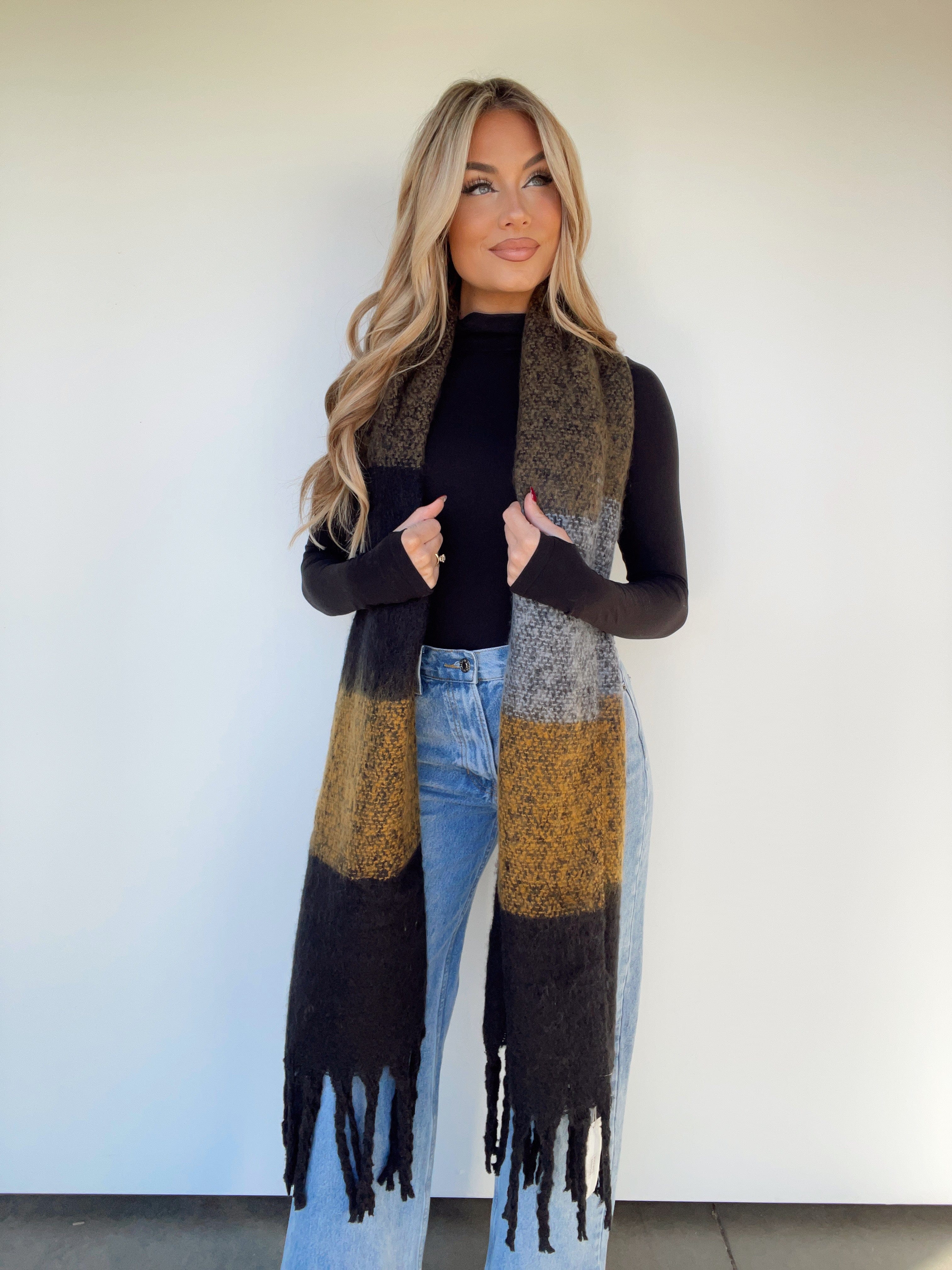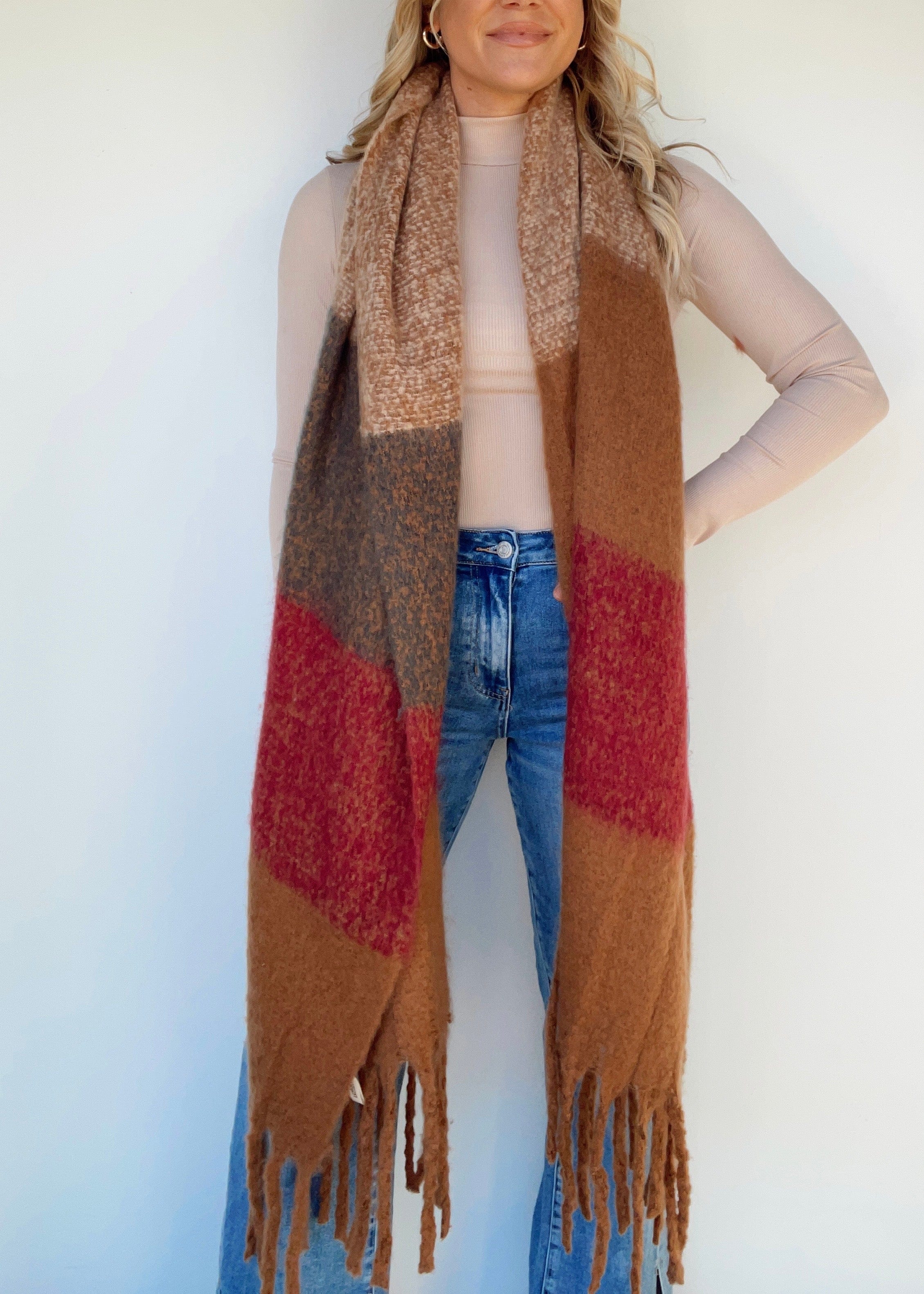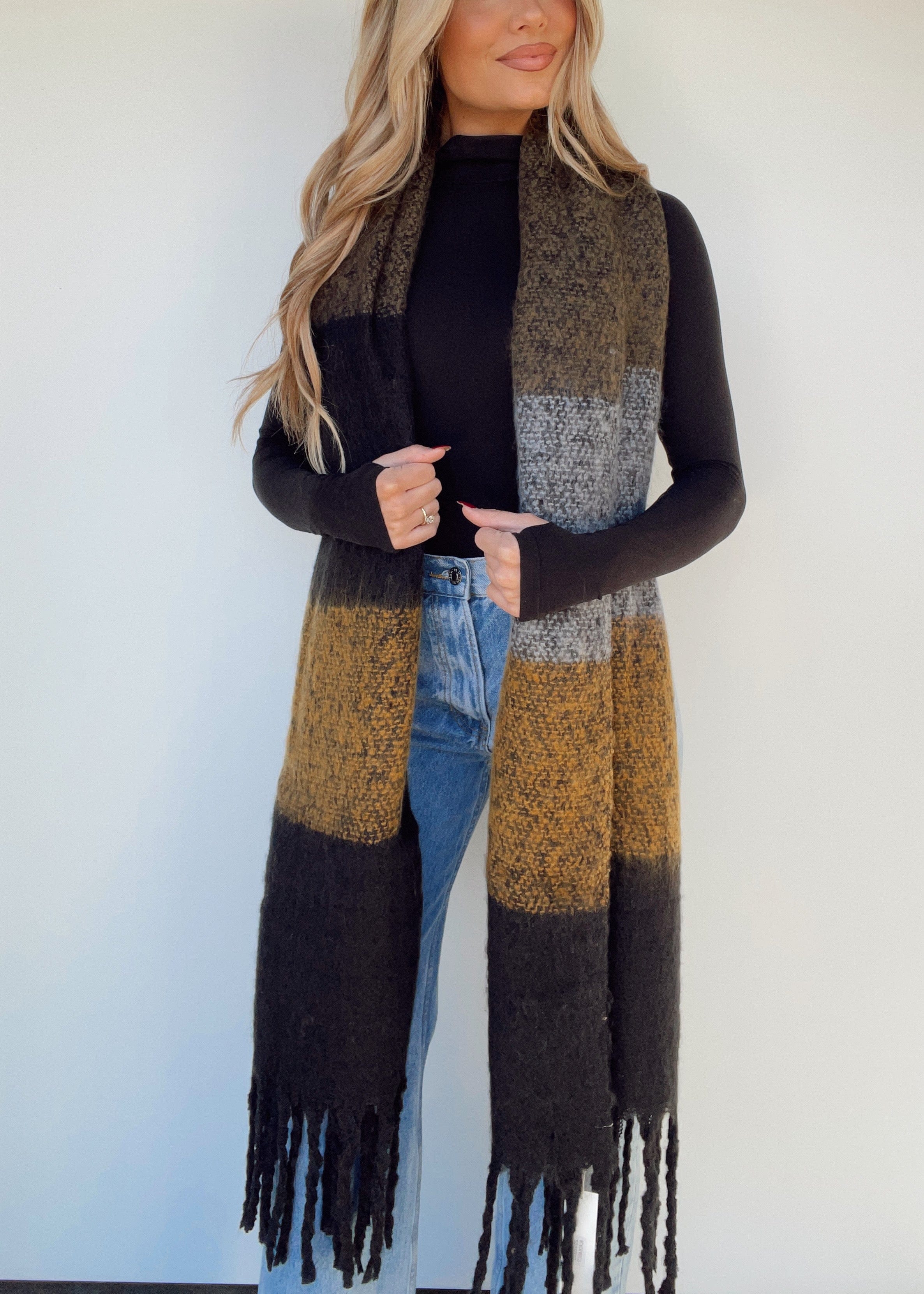 Stay cozy and elevate your winter look with this snuggly striped scarf. Featuring is a luxurious brushed fabric, long length, and fringe detailing, it's the perfect accessory to bundle up with on cold nights and chilly days. Take luxury to a new level with this contemporary and trendy piece.