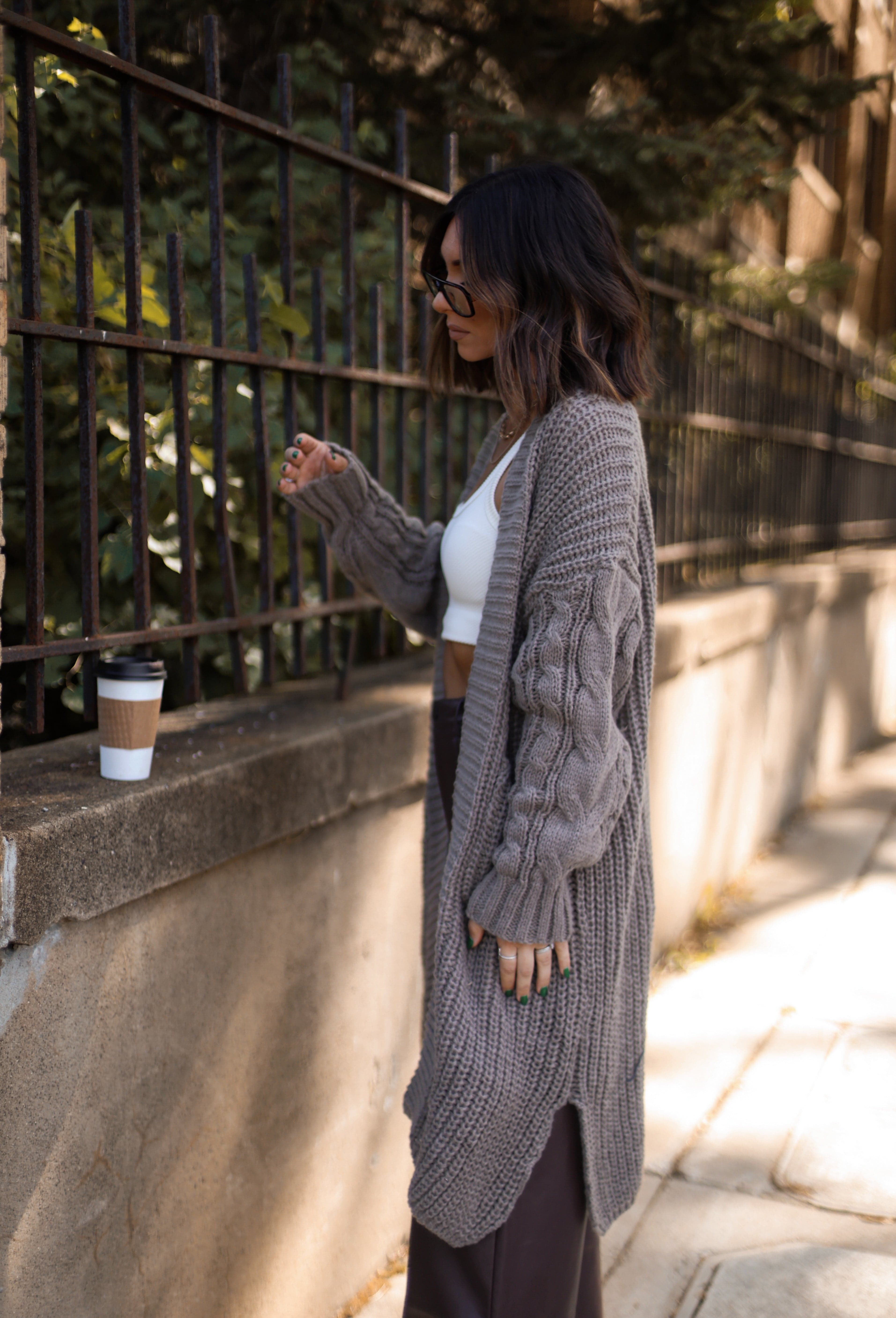 Get bundled up in this cozy knit cardigan, perfect for colder weather. Long enough to keep you warm and stylish all season long!