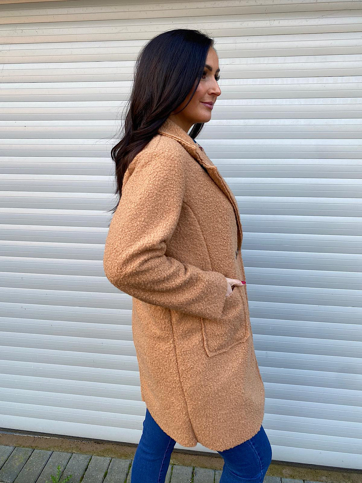 The Boucle Button Up Jacket Gigi offers a sophisticated look with everyday practicality. Crafted with a soft boucle fabric, this jacket is comfortable and stylish. It features two front pockets, providing plenty of space for all your essentials.