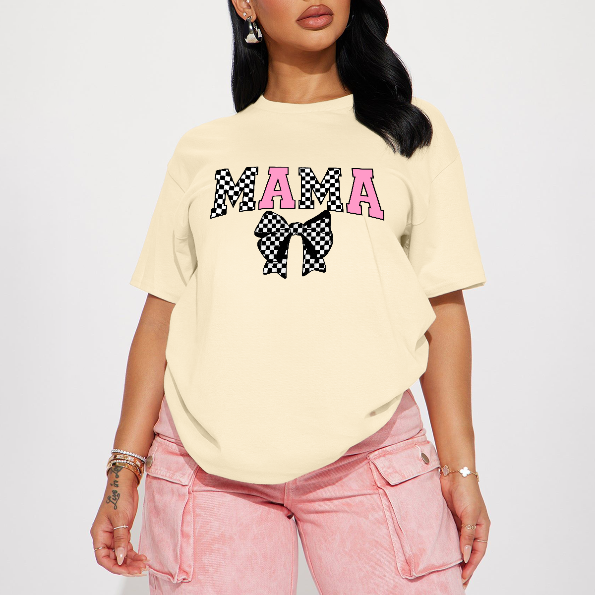 Casual T-Shirt With The Word "Mama" In Pink And Black Letters And A Bow With A Black And White Checkerboard Pattern.