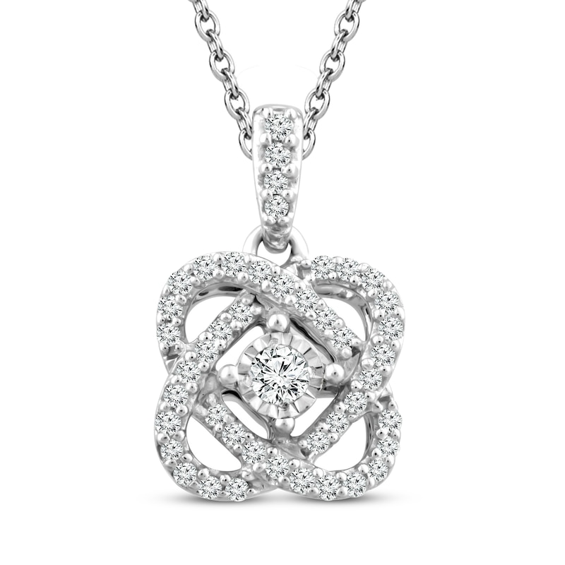 From the Center of Me? collection, this enchanting diamond necklace serves as a beautiful reminder that through life's twists and turns, love keeps you centered. Featuring a stunning round center diamond and surrounded by an interwoven swirling design of diamonds, the pendant has a total diamond weight of 1/10 carat. The pendant is crafted of sterling silver and hangs on an 18-inch cable chain that secures with a spring ring clasp.