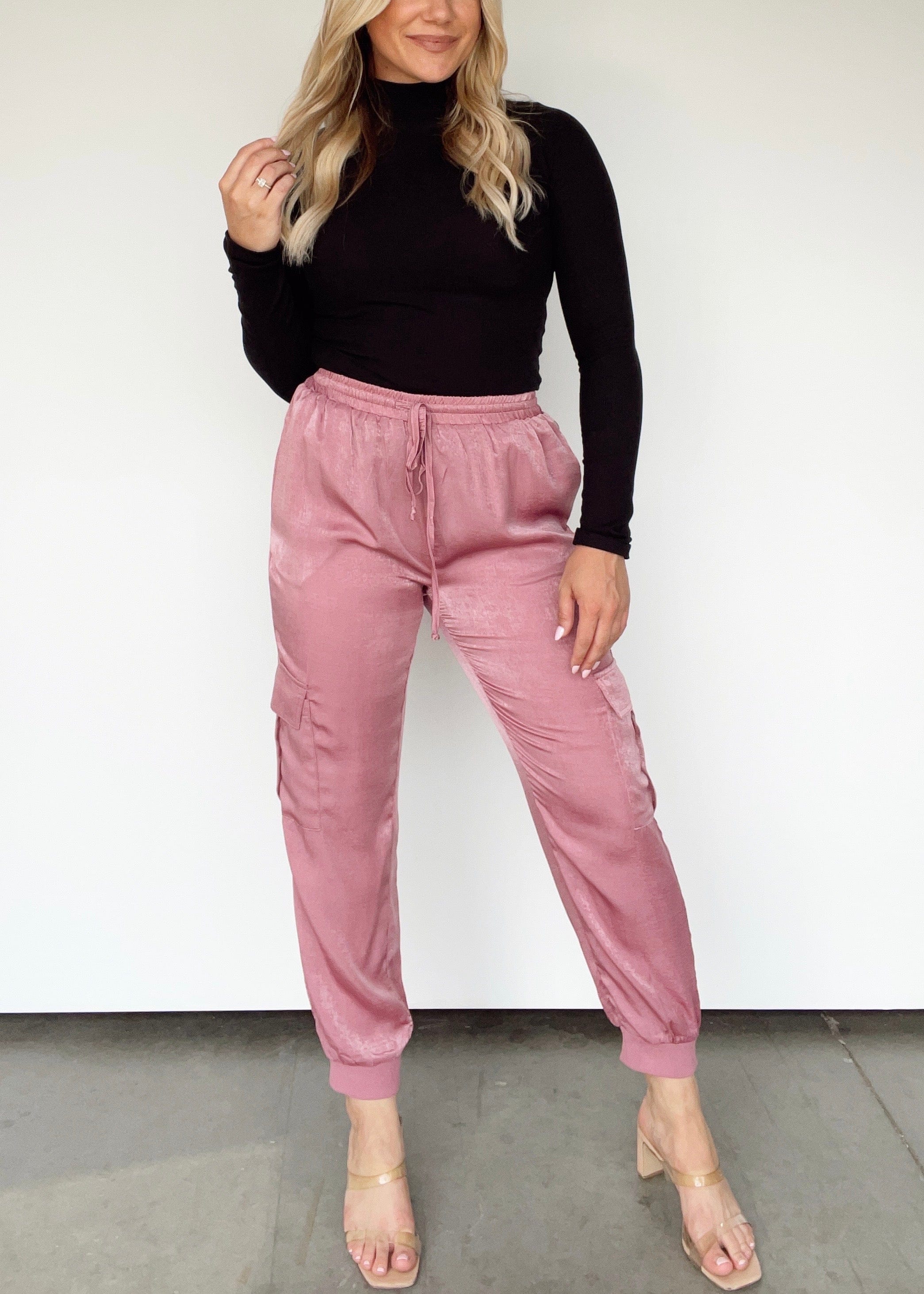 Our Chasing You Cargo Pants bring a luxurious, elevated touch to your wardrobe. Crafted from satin-soft fabric offering unbeatable comfort, these trendy, stylish pants feature a stretchy adjustable drawstring waistband and high-waisted fit for a chic jogger-style silhouette. A pop of color adds a creative flair, while the versatile design ensures these pants can effortlessly transition from day to night.