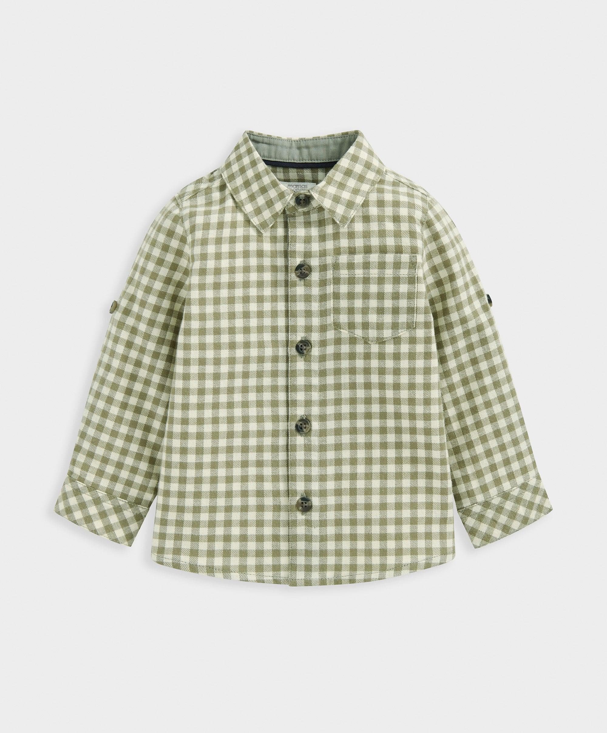 Check shirt with deep cuff detail. Bagged out collar. Printed square patch pocket. Contrast buttons on cuffs. 100% softly brushed woven cotton.