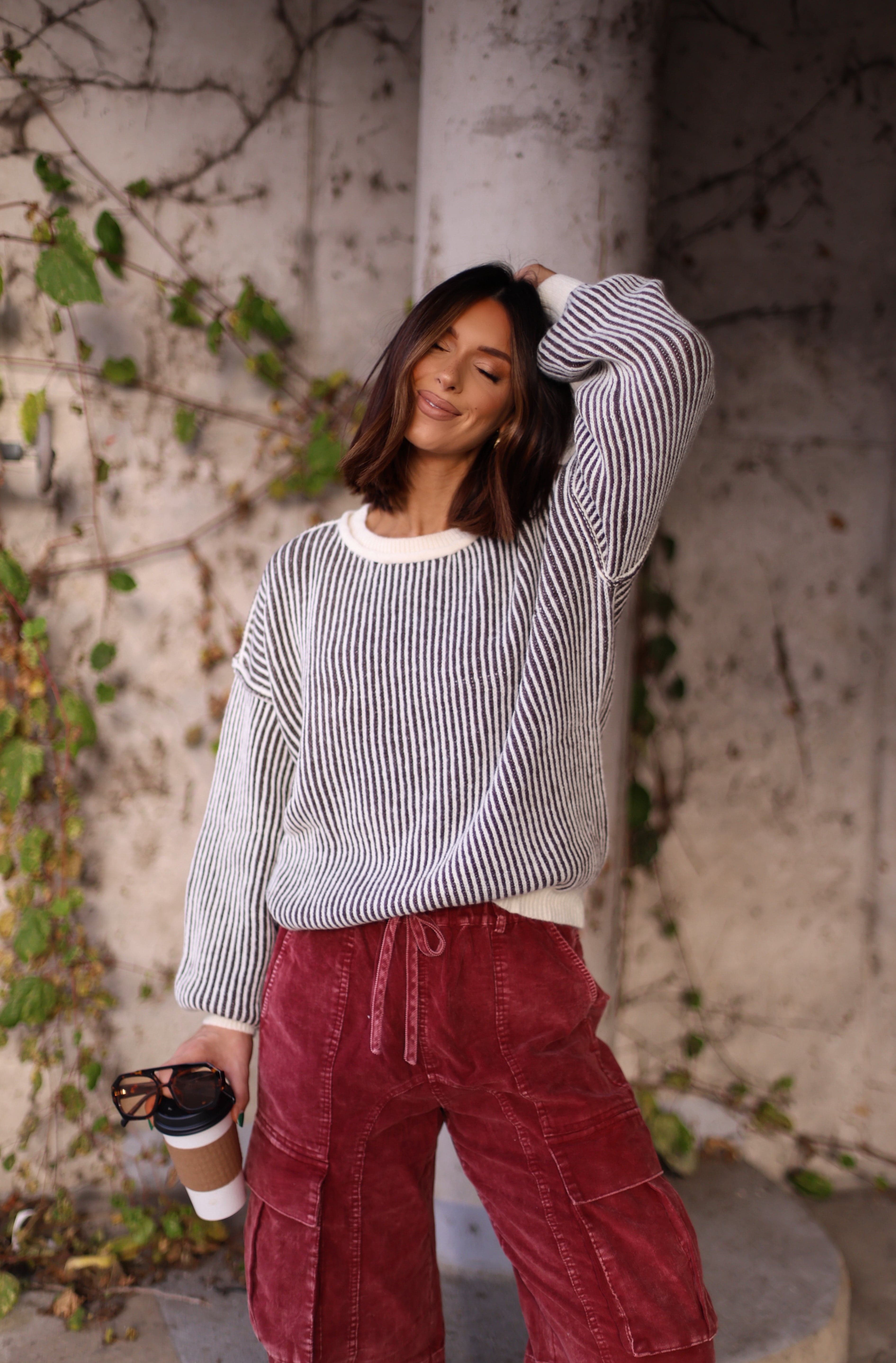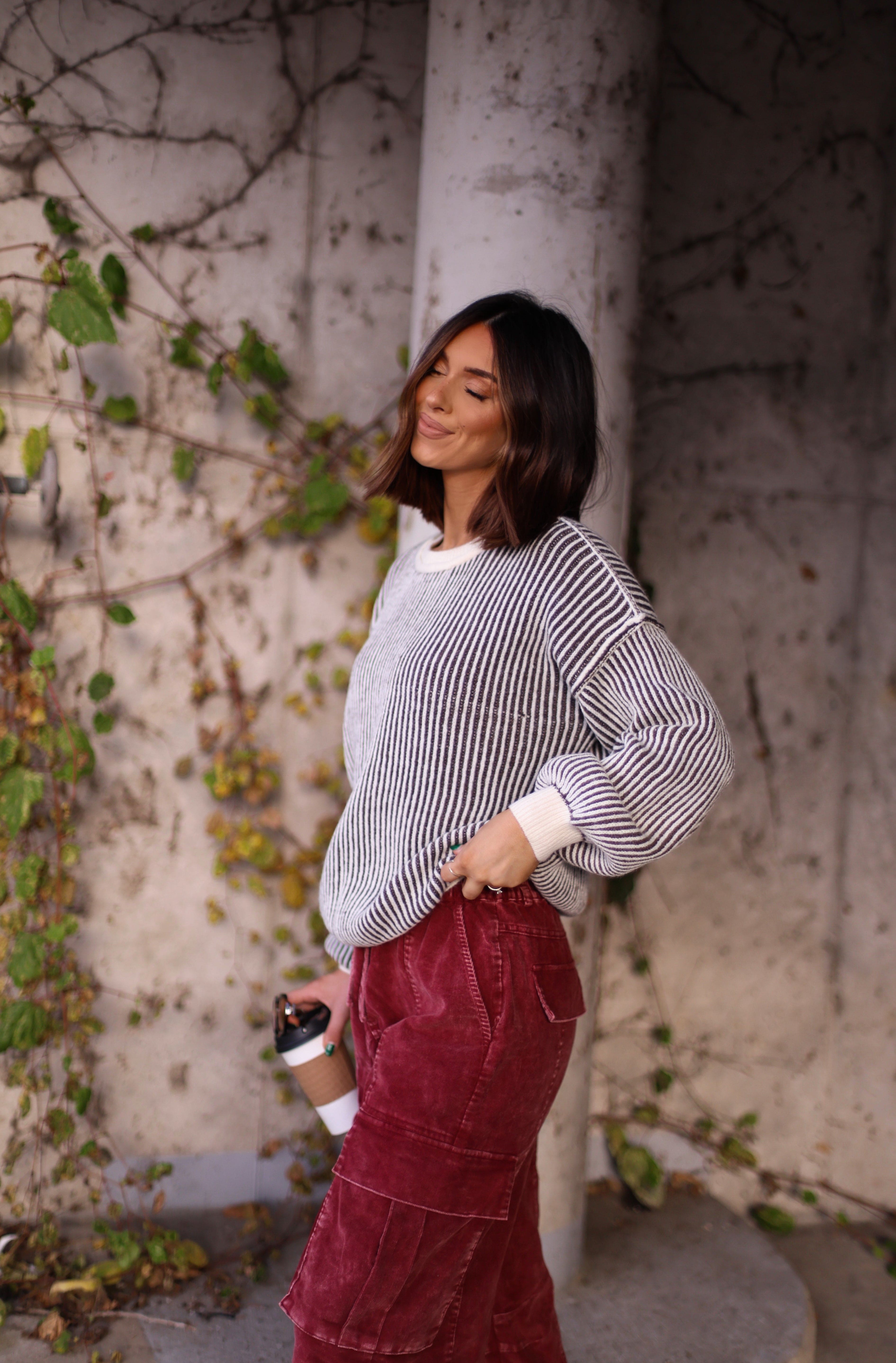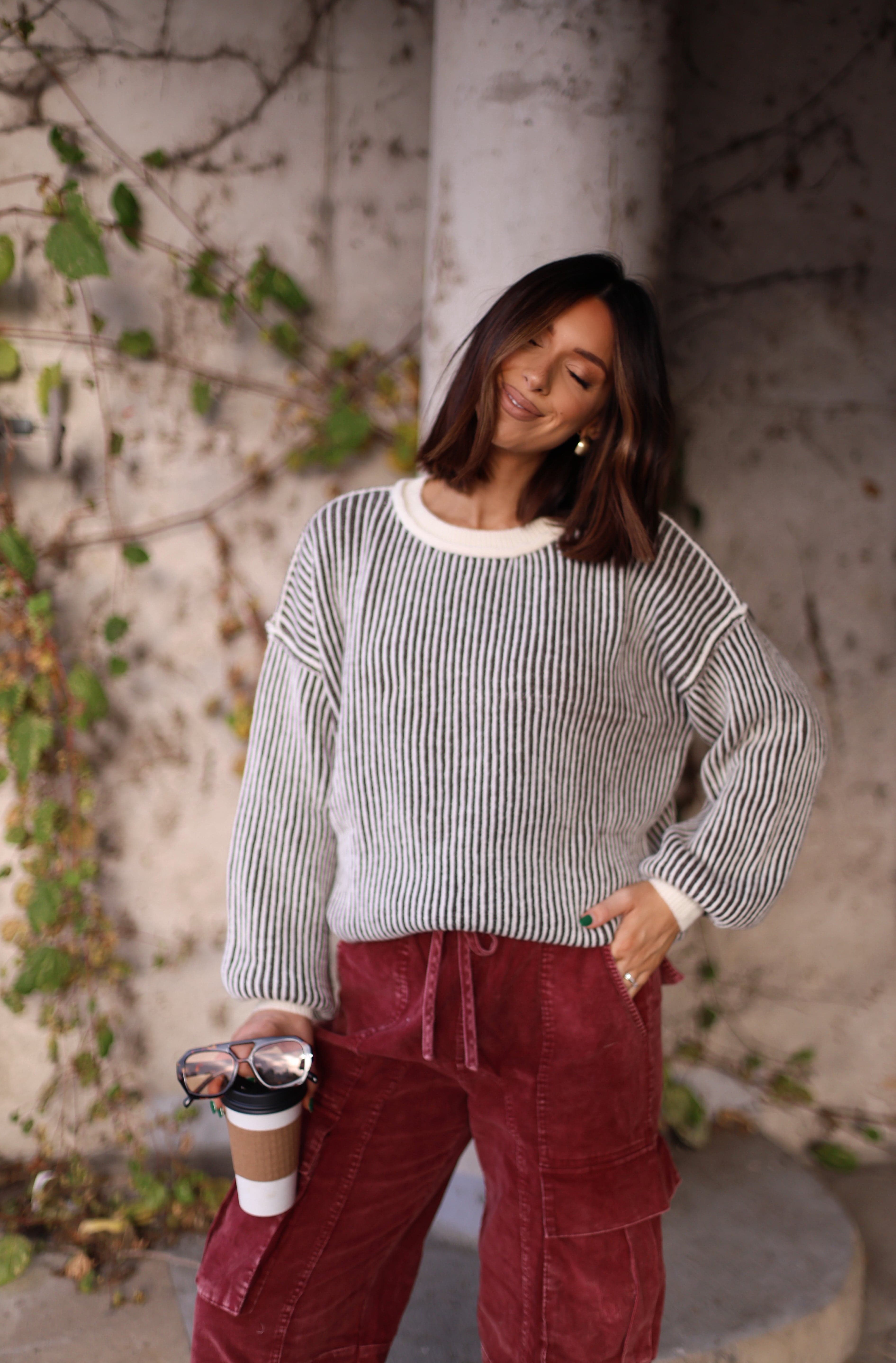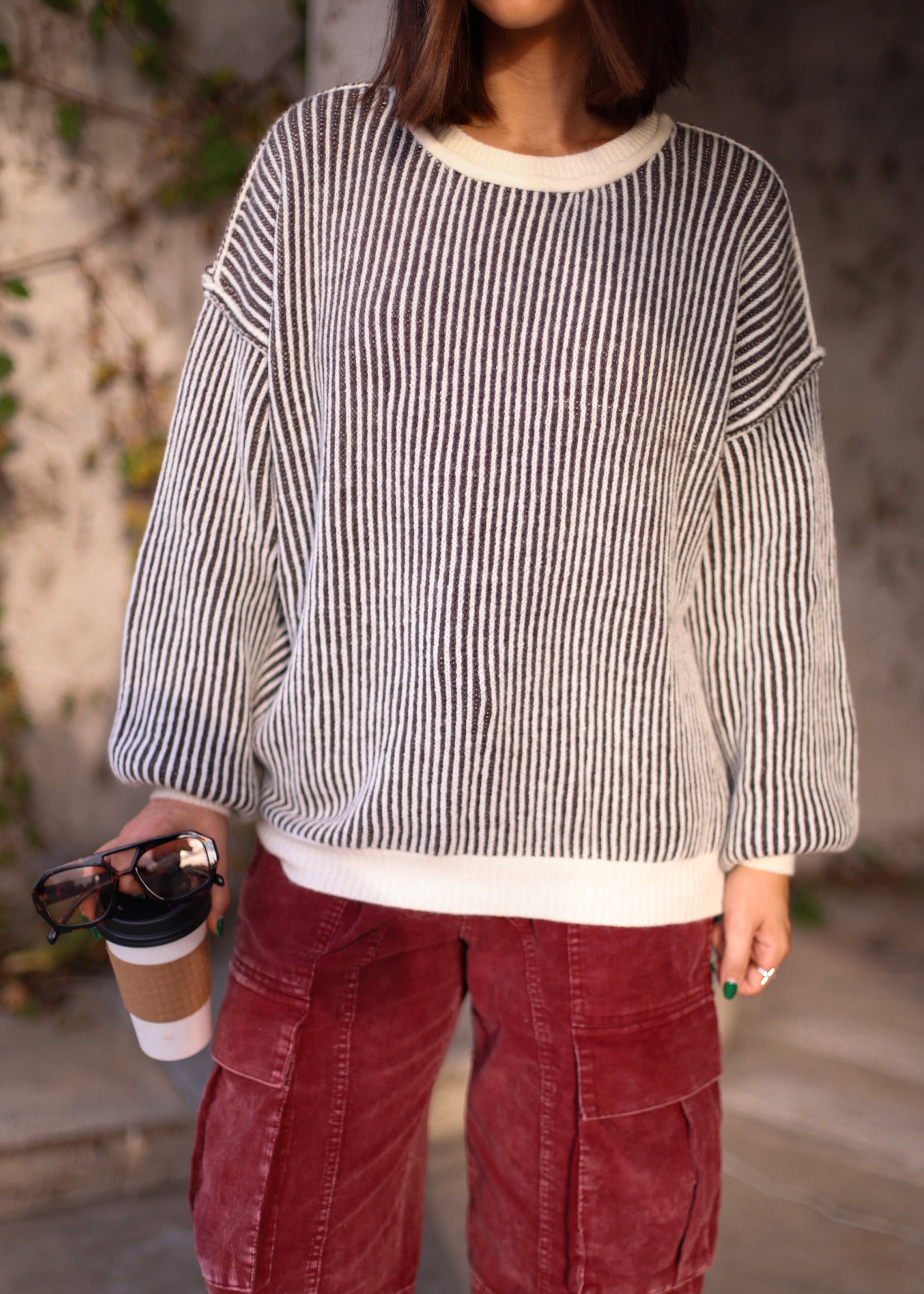 The Chenille Comfort Sweater features a trendy vertical stripe design, providing a modern and stylish look. With an oversized and loose fit, this sweater offers unbeatable comfort, making it perfect for a casual Saturday coffee run. Stay warm and cozy in style with this must-have piece!