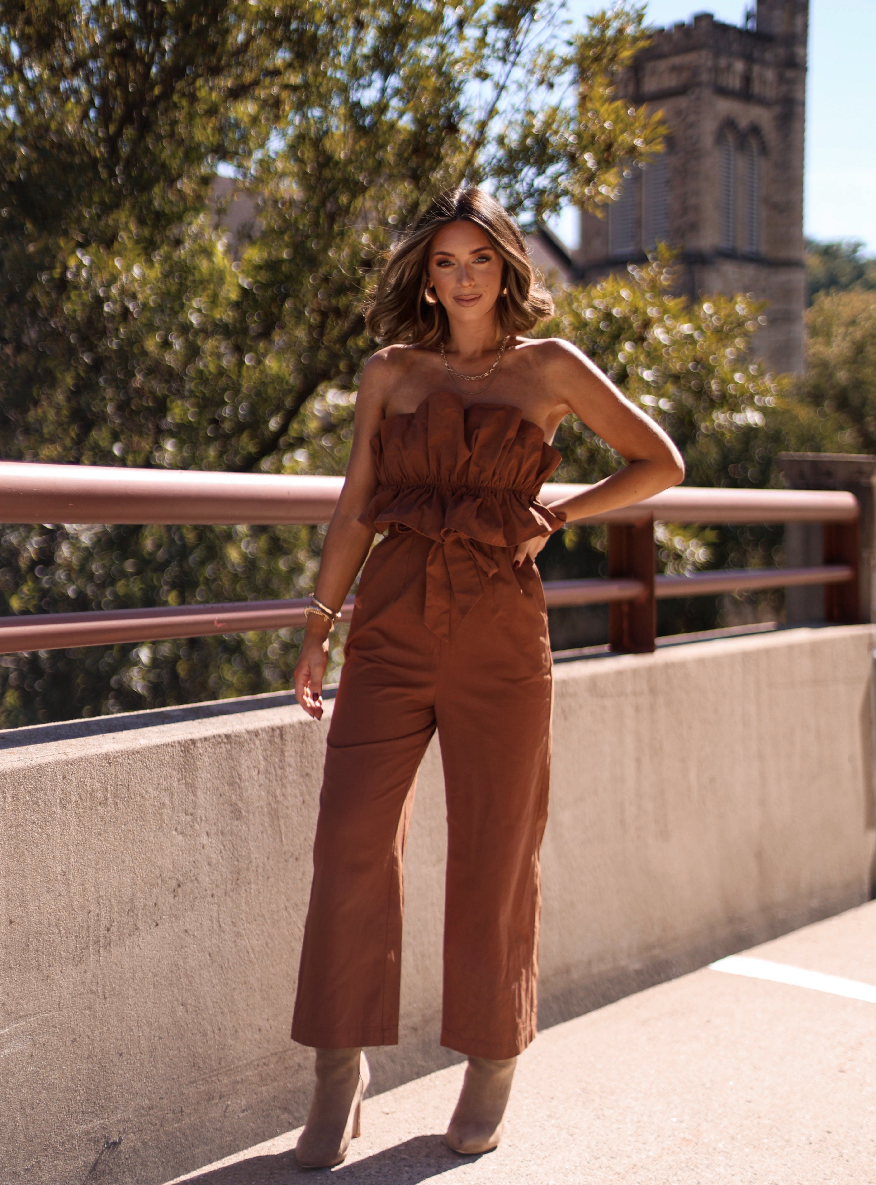 Introduce an air of sophistication to your look with this chic, strapless Express Your Love Jumpsuit. Crafted from soft fabric with an elevated neutral hue, this iconic piece is sure to become a timeless transition piece for the season. With subtle tie details and pocket accents, it exudes style and comfort, making this jumpsuit a must-have for an effortlessly classy look.