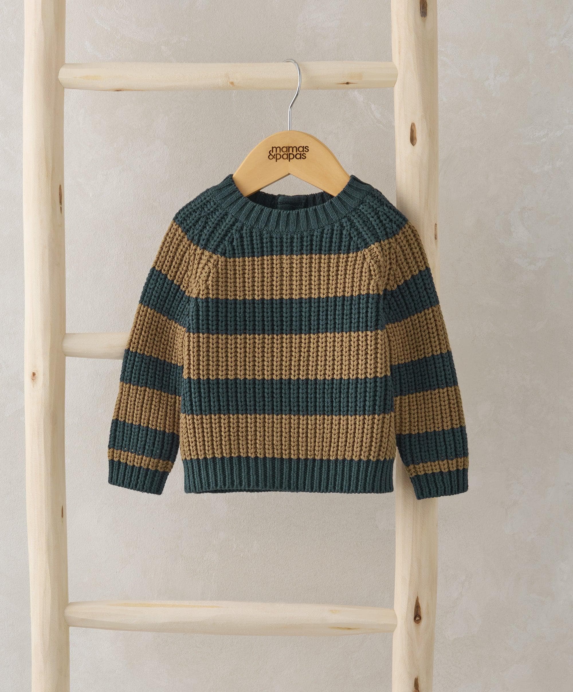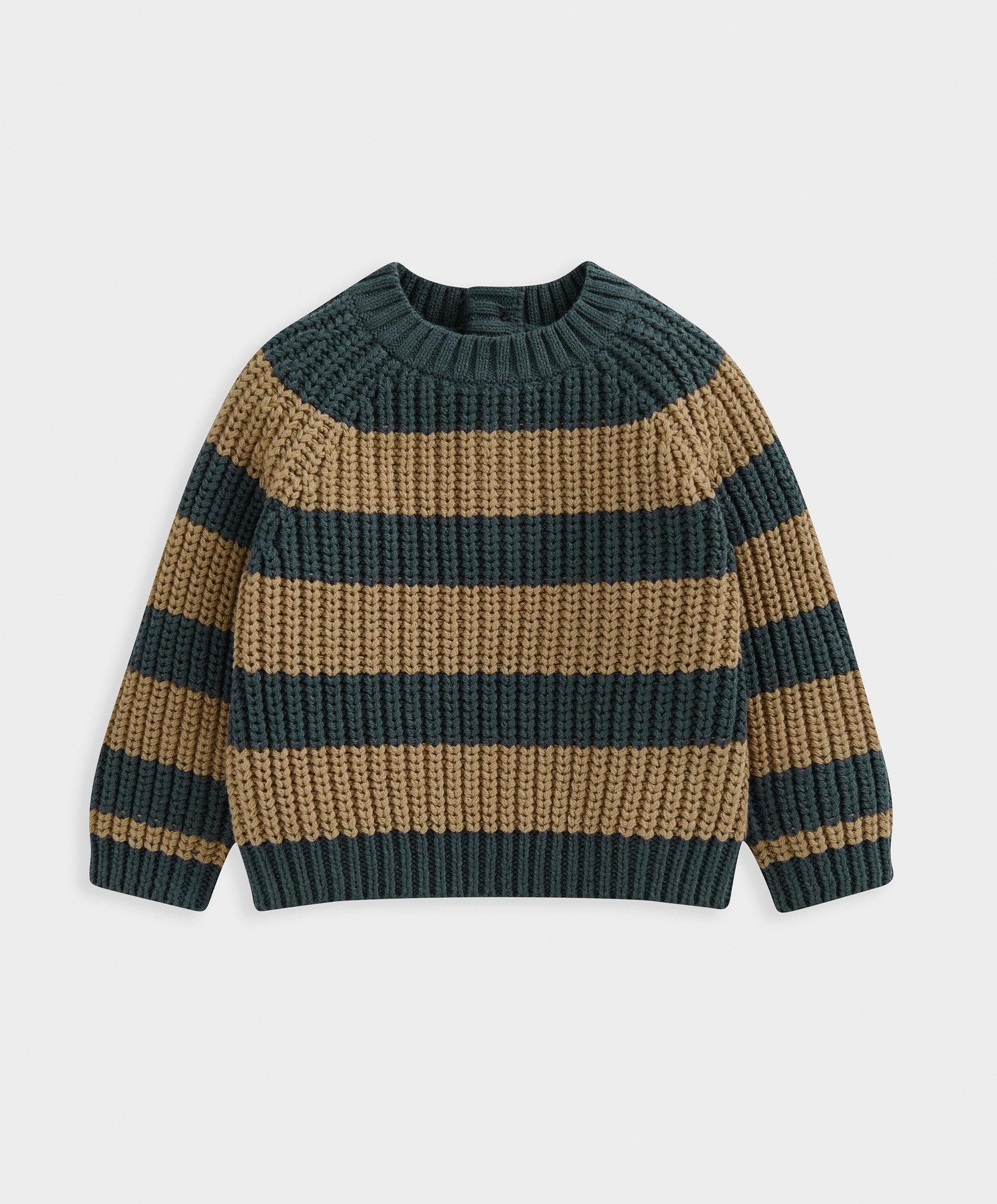 Knitted striped jumper with raglan sleeves. Ribbed neckline hem and cuffs.