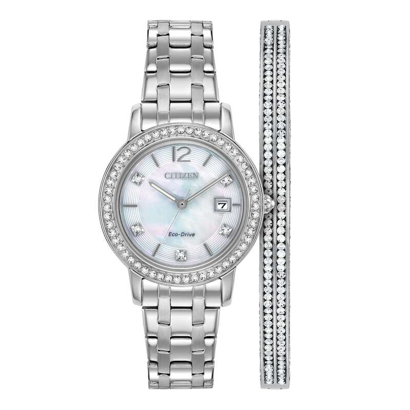 This lovely women's box set from Citizen includes a stainless steel watch with shimmering crystals set in the bezel. The lustrous mother-of-pearl dial showcases crystal hour markers, a date window, and second hand. The stainless steel bracelet secures with a push-button fold-over clasp. Equipped with Eco-Drive technology, the watch is powered by any light so it never needs a battery. A matching bangle bracelet completes the set.