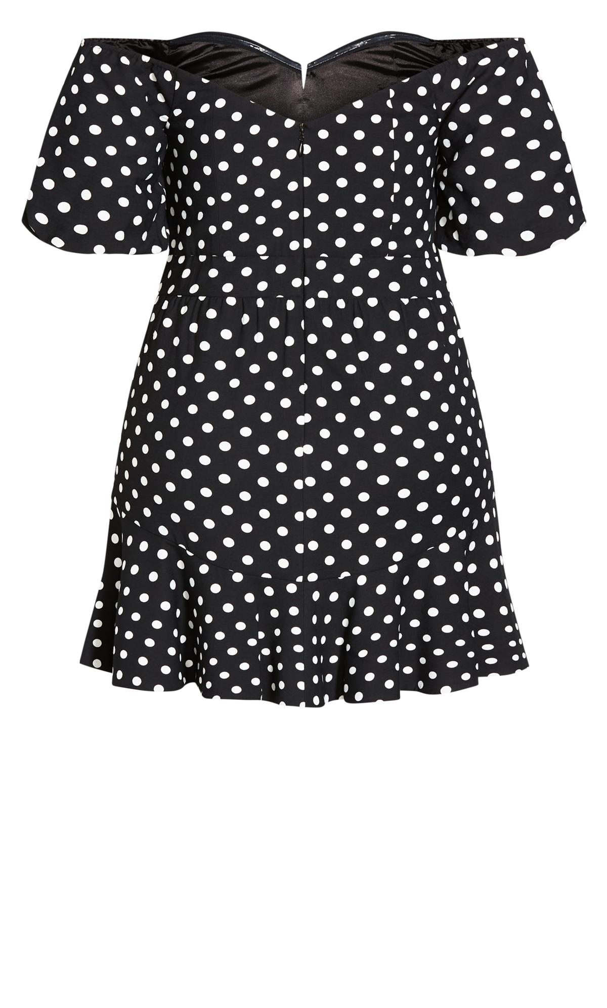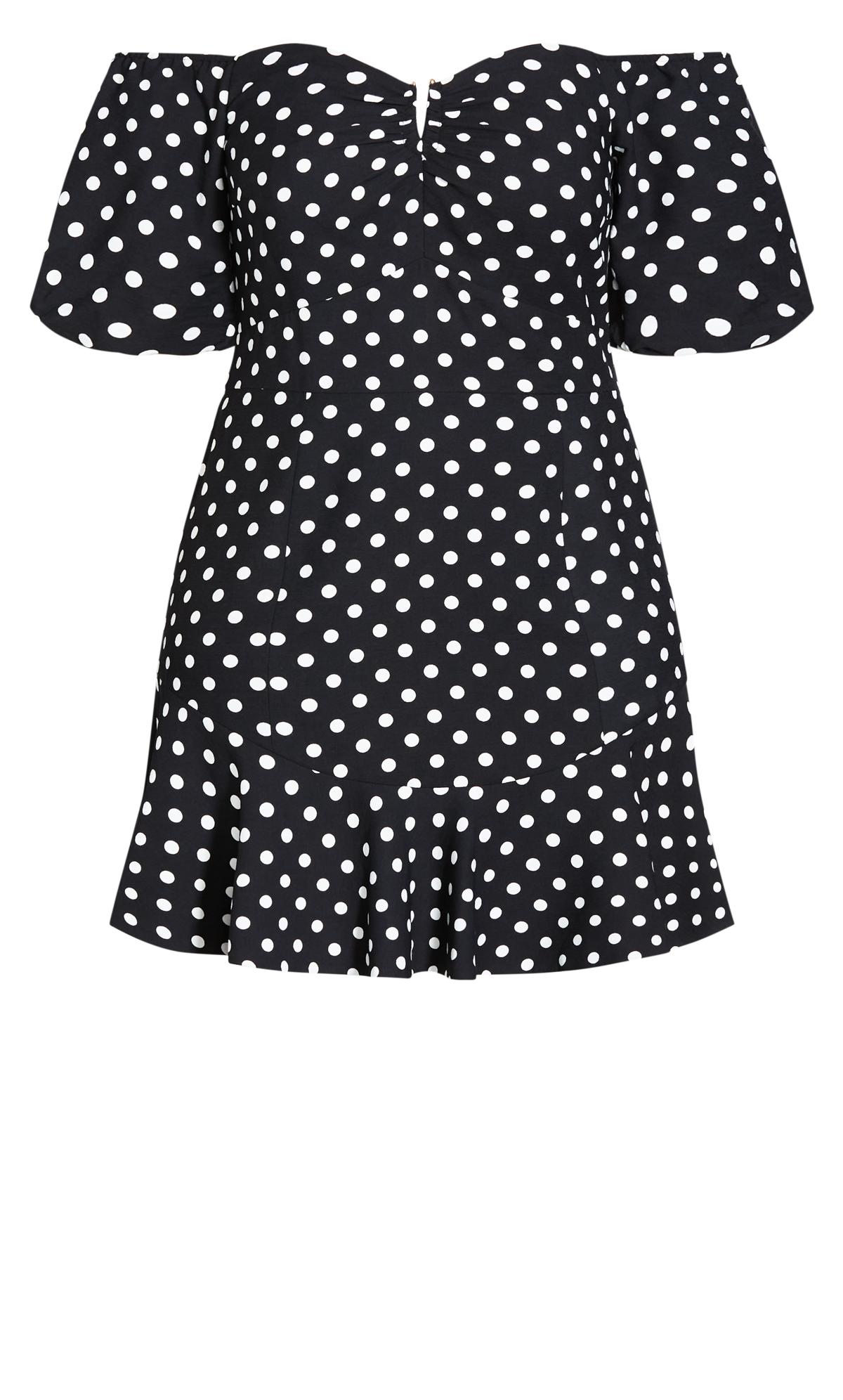 Love your curves in the Emma Dress. Boasting a vintage-inspired polka dot print, this gorgeous fit and flare silhouette pulls out all the stops with its off-shoulder puff sleeves and sexy notched neckline.