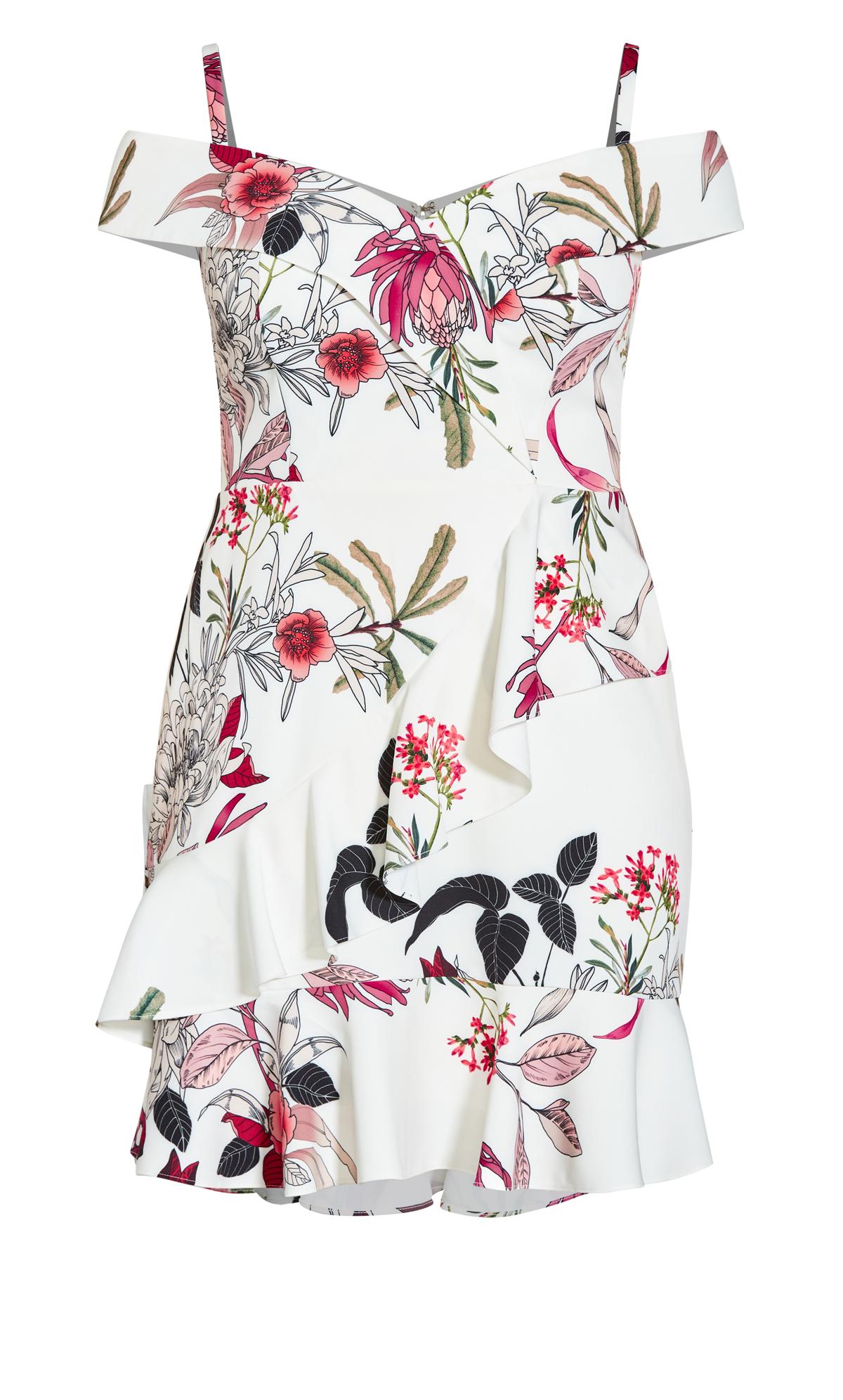 Decorative to your curves, the Botanical Floral Dress sure knows how to flatter. This flirty style boasts a dreamy floral print, sweetheart neckline and statement ruffled skirt.